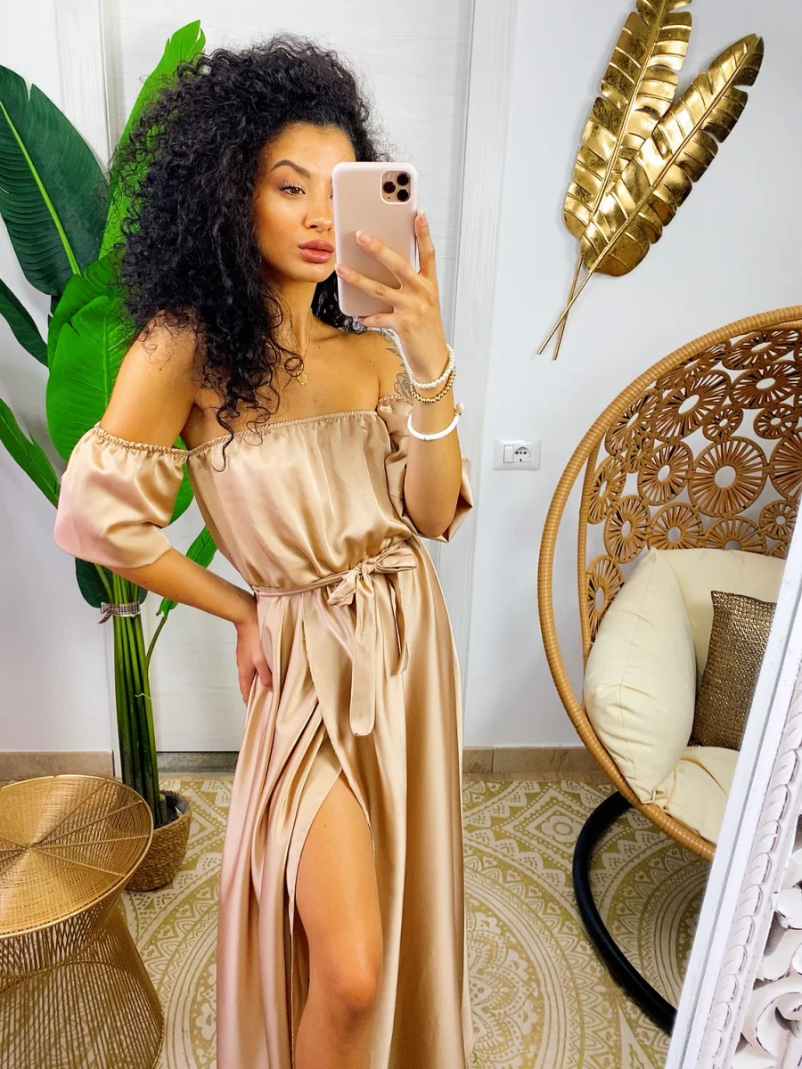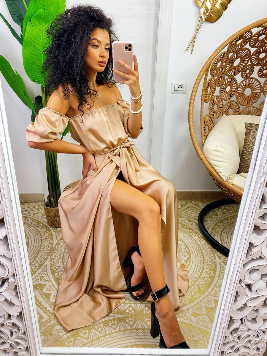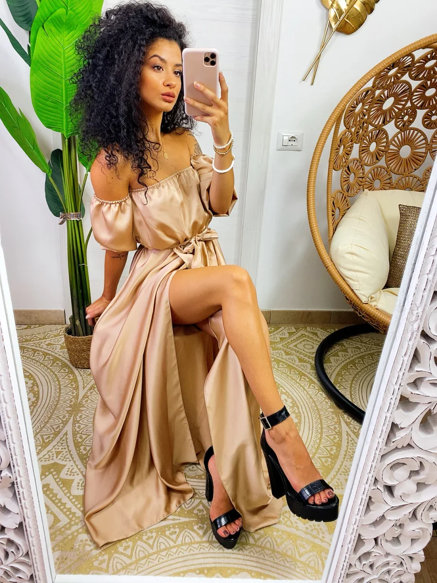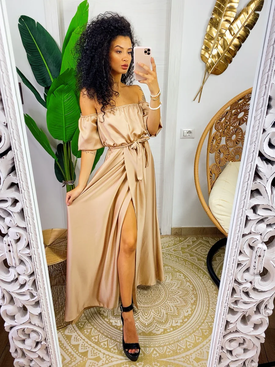 Abito in raso lungo con scollo a barchett elasticizzato. Maxi spacco sul davanti. Fresco e comodo sia da giorno che da sera, dotato di cinturina.