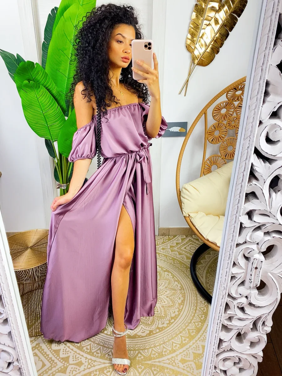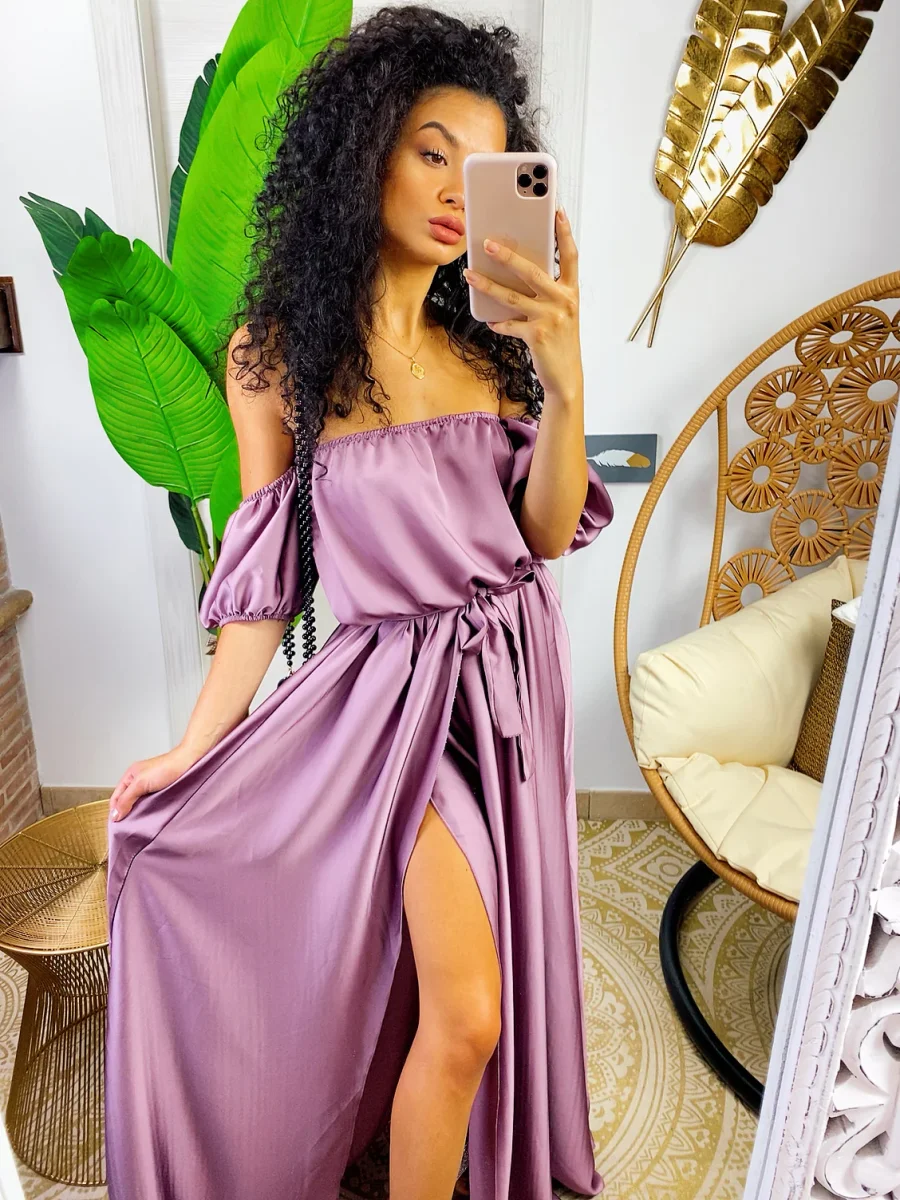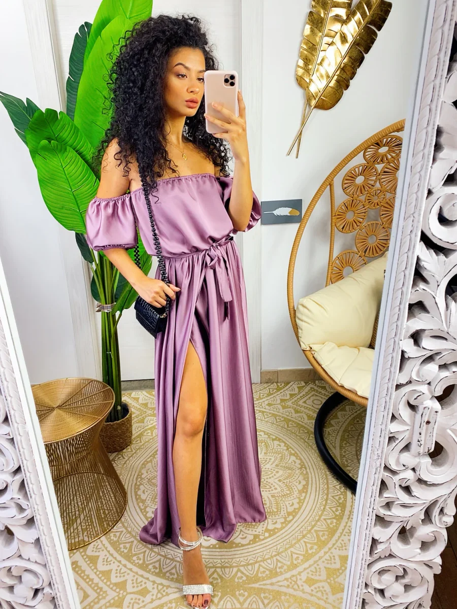 Abito in raso lungo con scollo a barchett elasticizzato. Maxi spacco sul davanti. Fresco e comodo sia da giorno che da sera, dotato di cinturina.