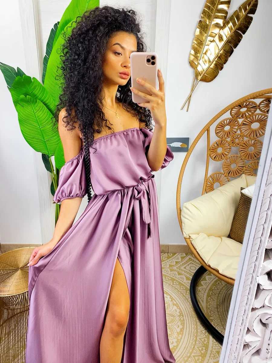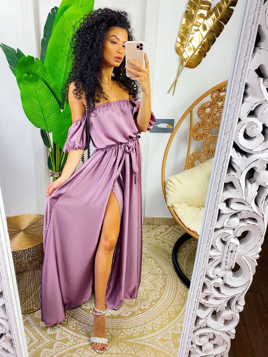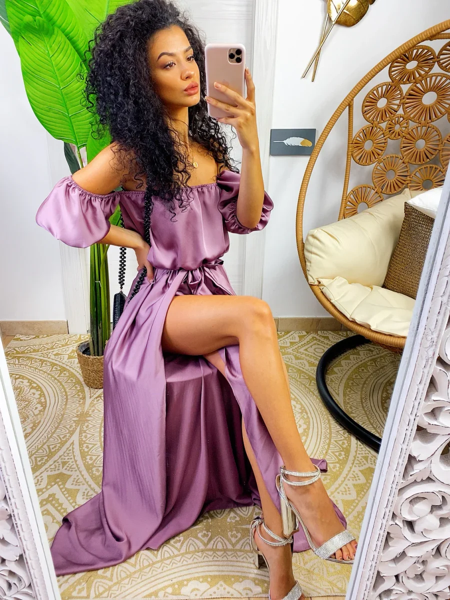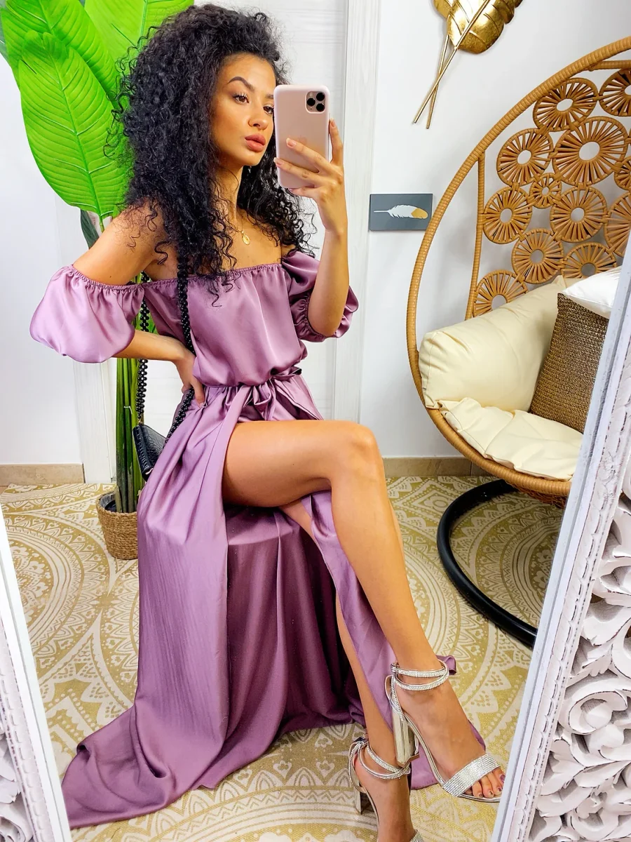 Abito in raso lungo con scollo a barchett elasticizzato. Maxi spacco sul davanti. Fresco e comodo sia da giorno che da sera, dotato di cinturina.