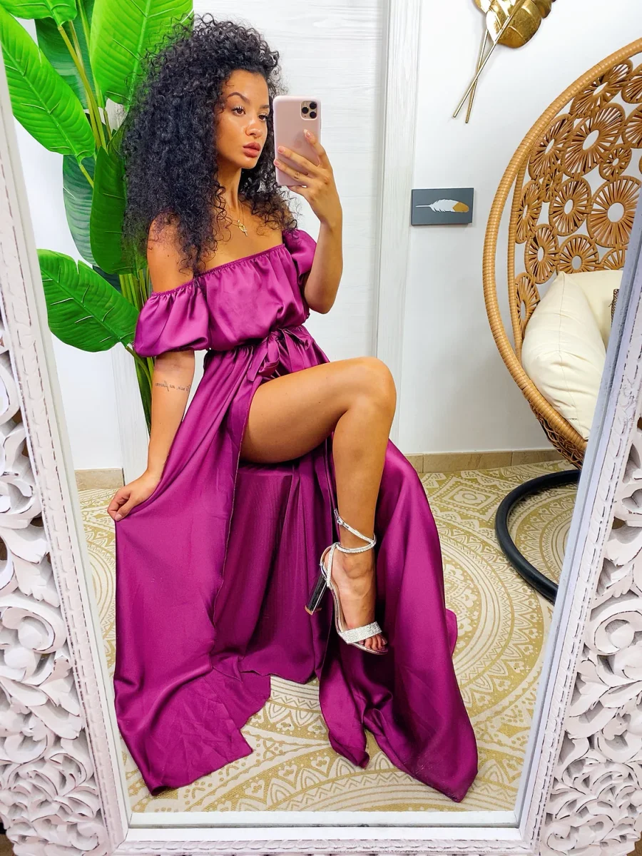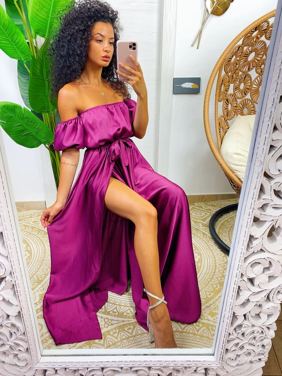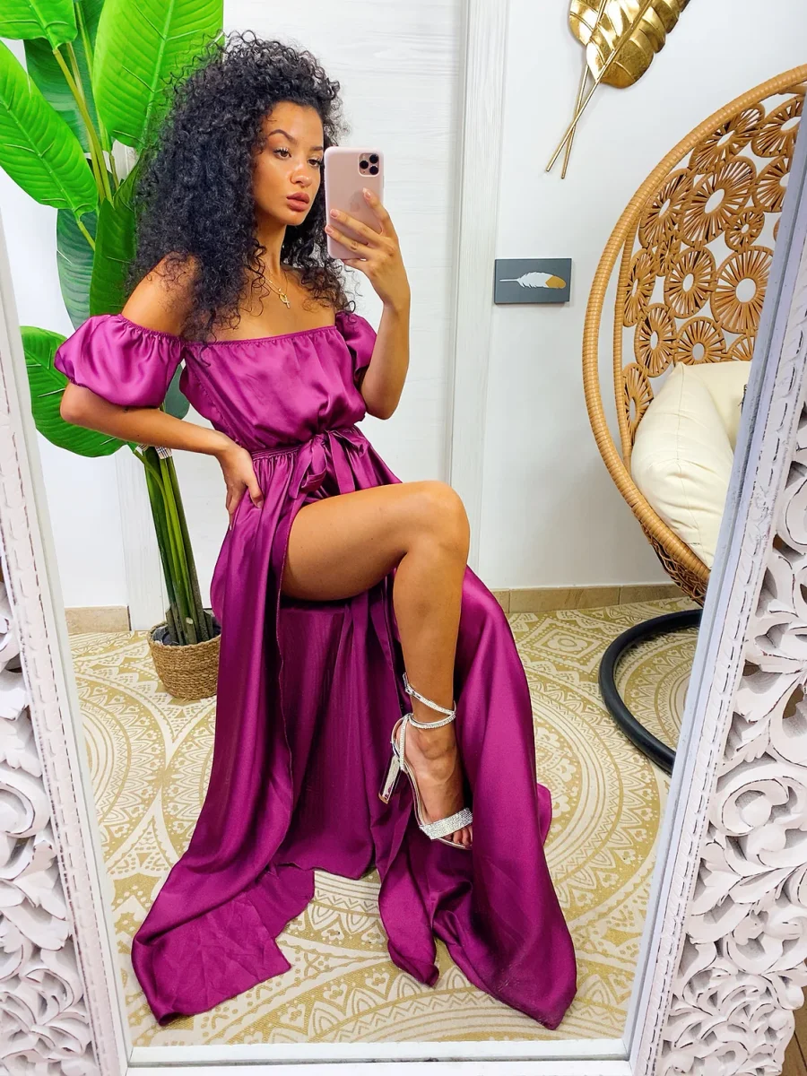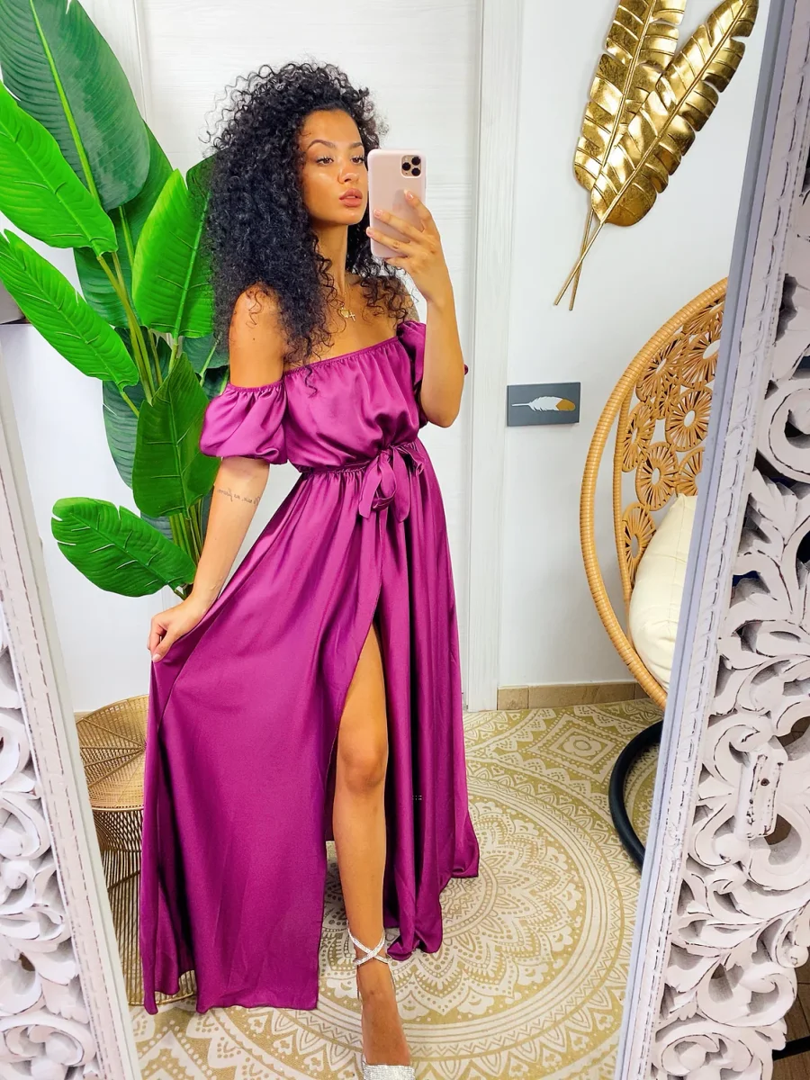 Abito in raso lungo con scollo a barchett elasticizzato. Maxi spacco sul davanti. Fresco e comodo sia da giorno che da sera, dotato di cinturina.