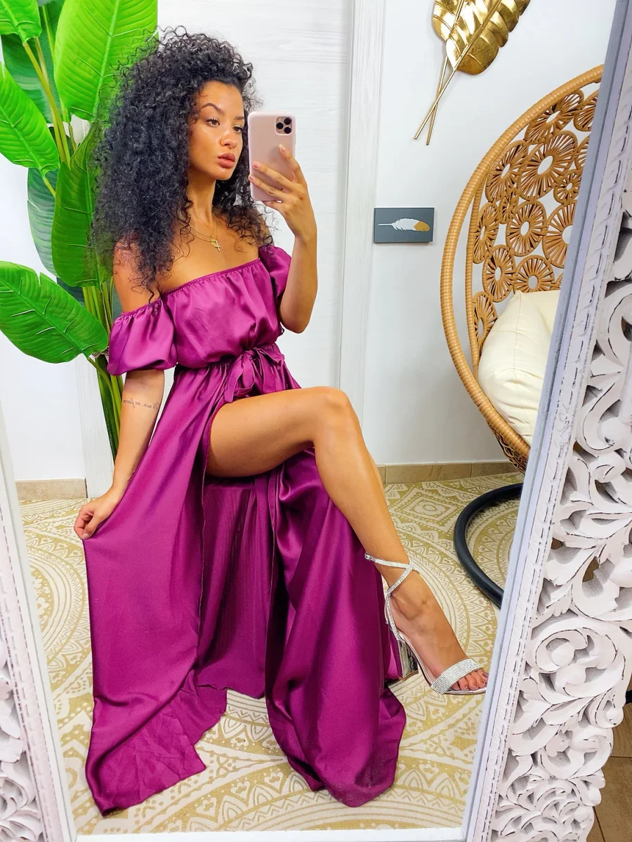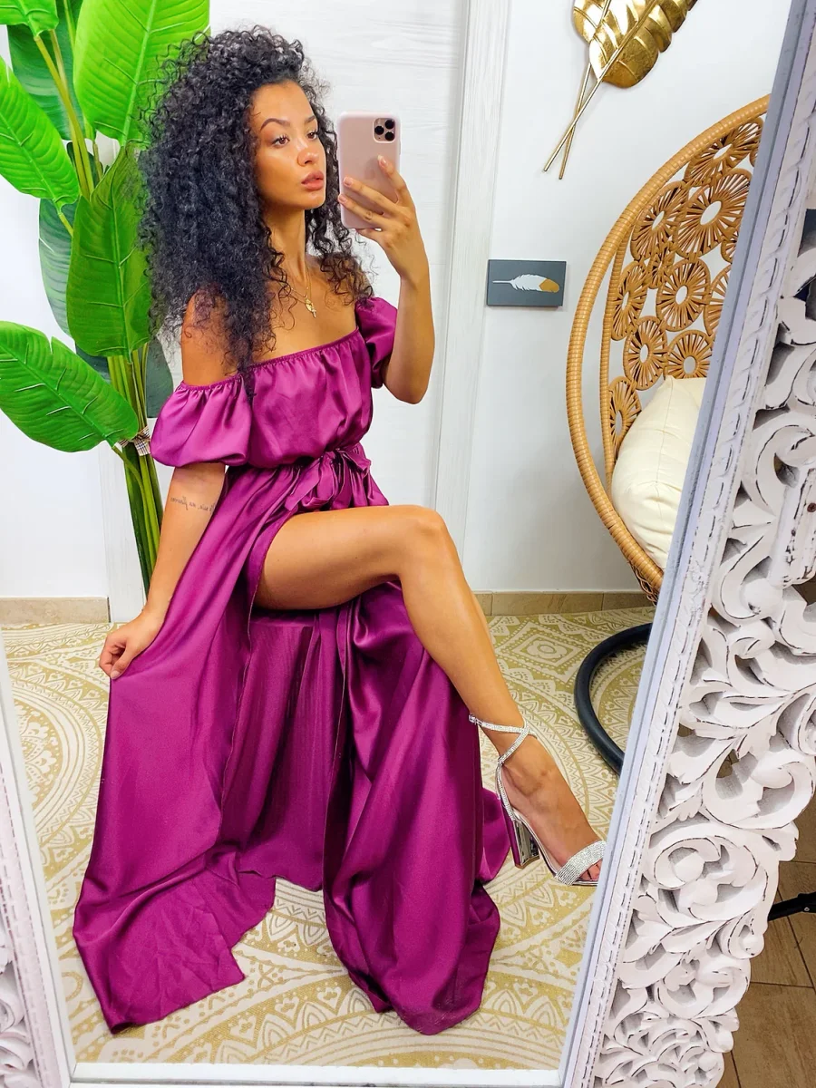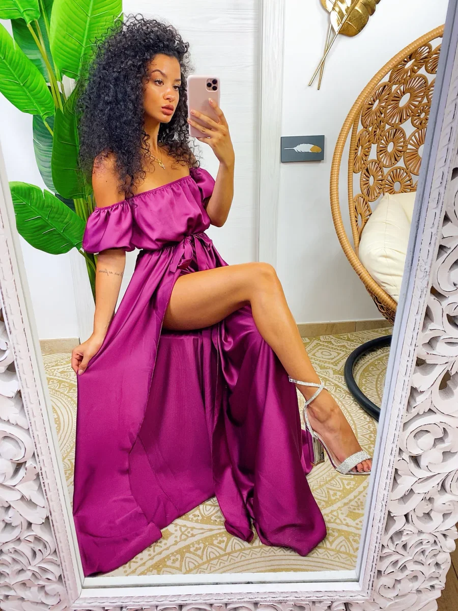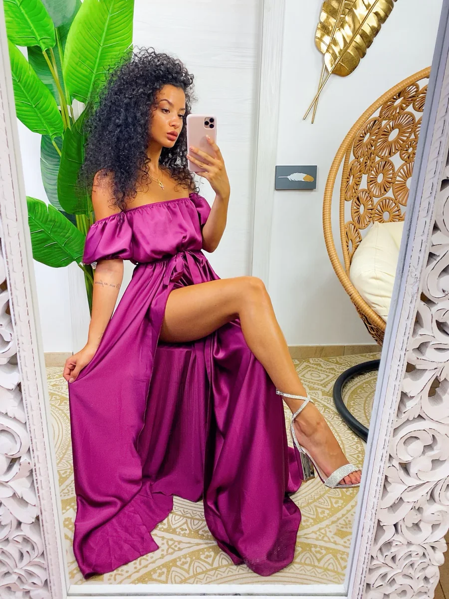 Abito in raso lungo con scollo a barchett elasticizzato. Maxi spacco sul davanti. Fresco e comodo sia da giorno che da sera, dotato di cinturina.