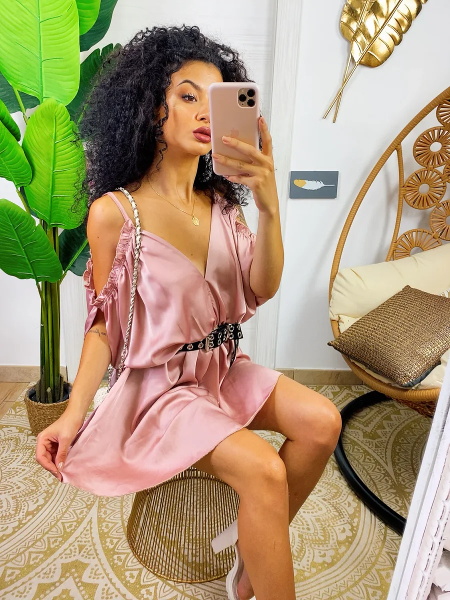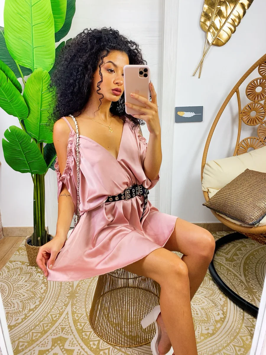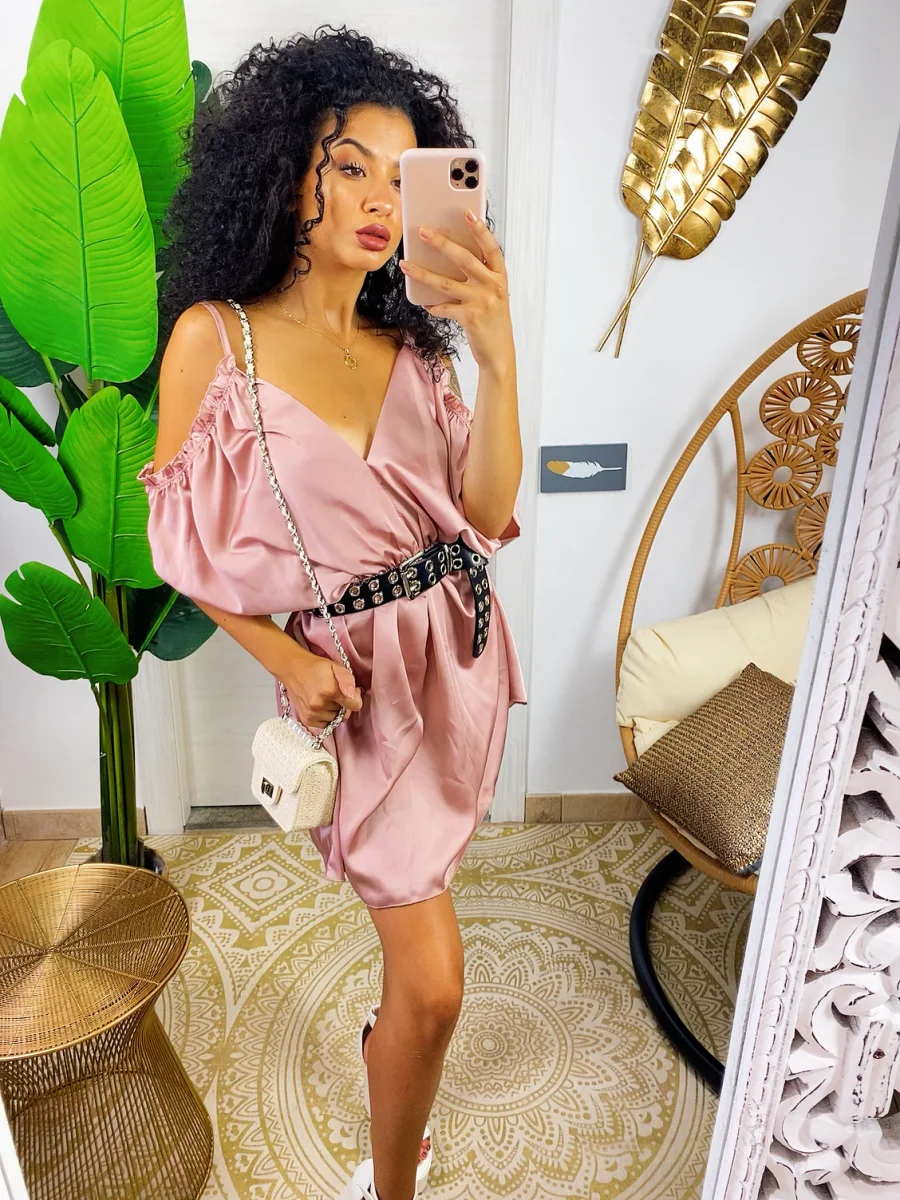 Abito in raso con rouches. Rouches sul davanti e manichina. Cosa aspetti?