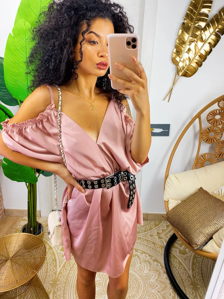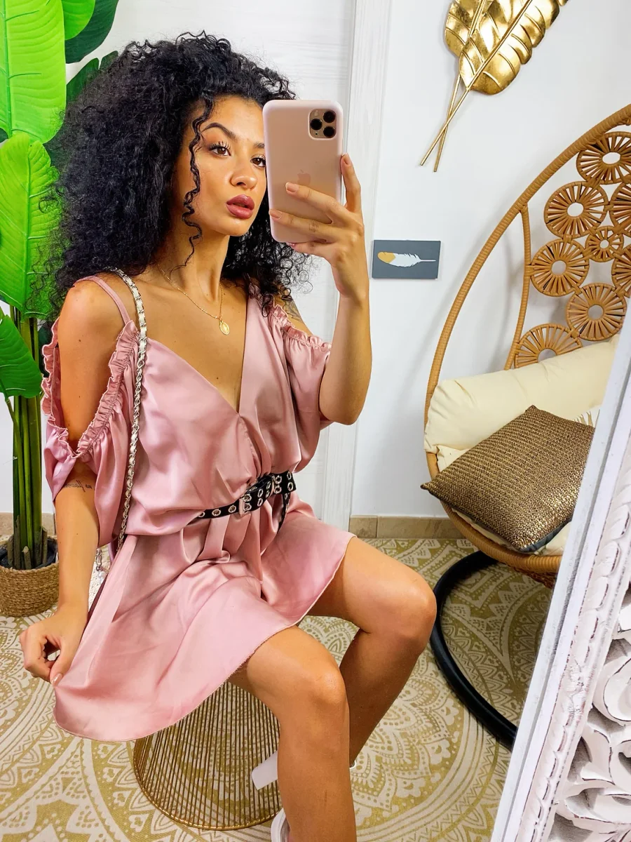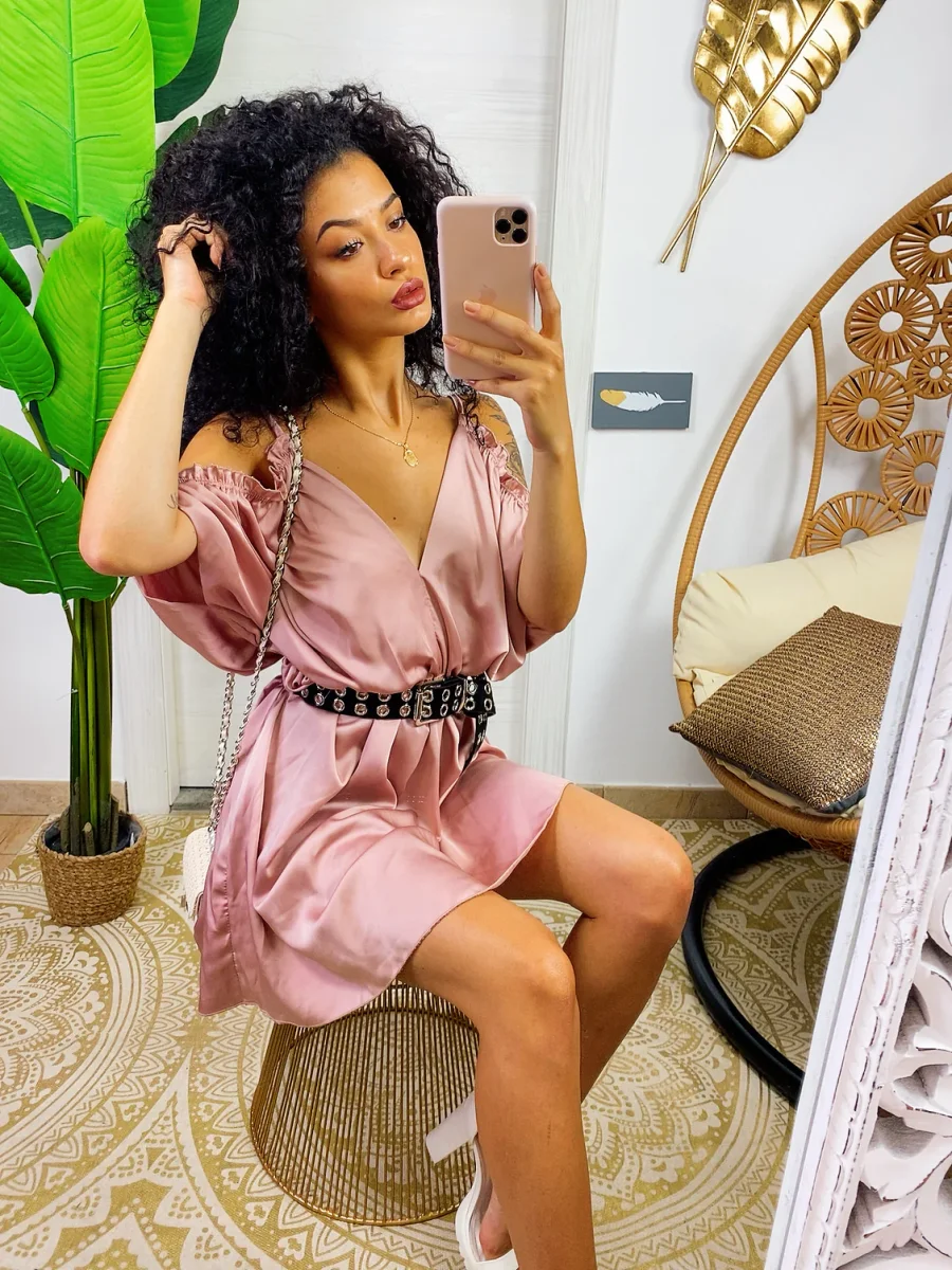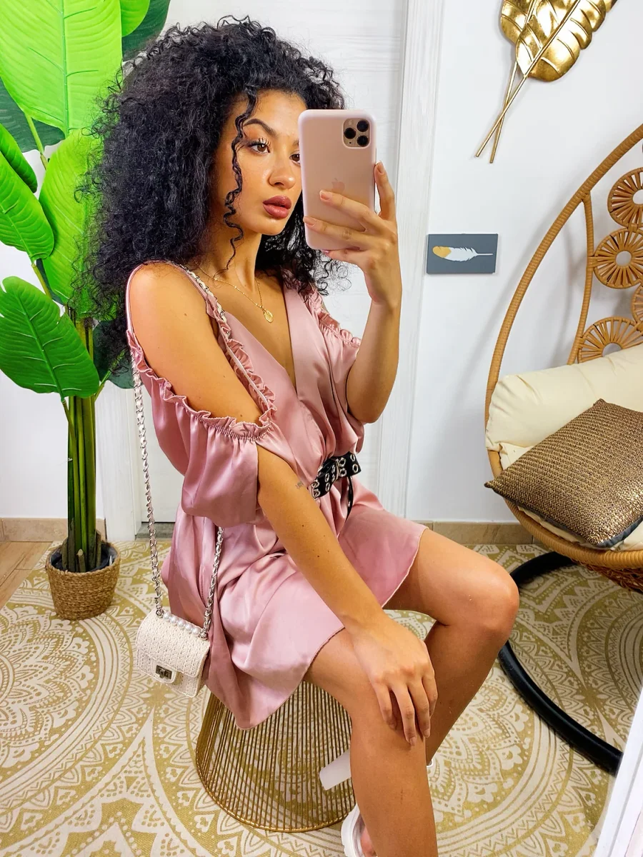 Abito in raso con rouches. Rouches sul davanti e manichina. Cosa aspetti?