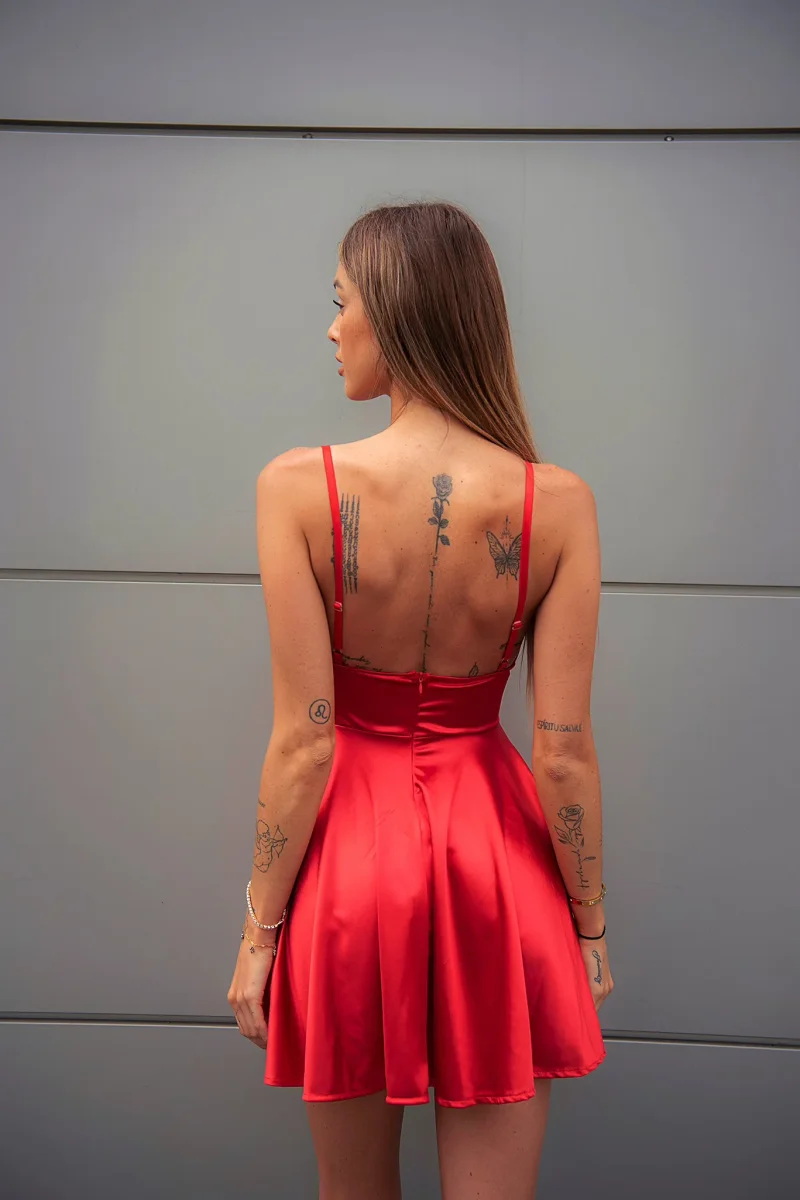 Elegantissimo abito corto in raso elagante, con coppe e spalline regolabili, elastico nel seno e maxi gonna a ruota e zip nel dietro