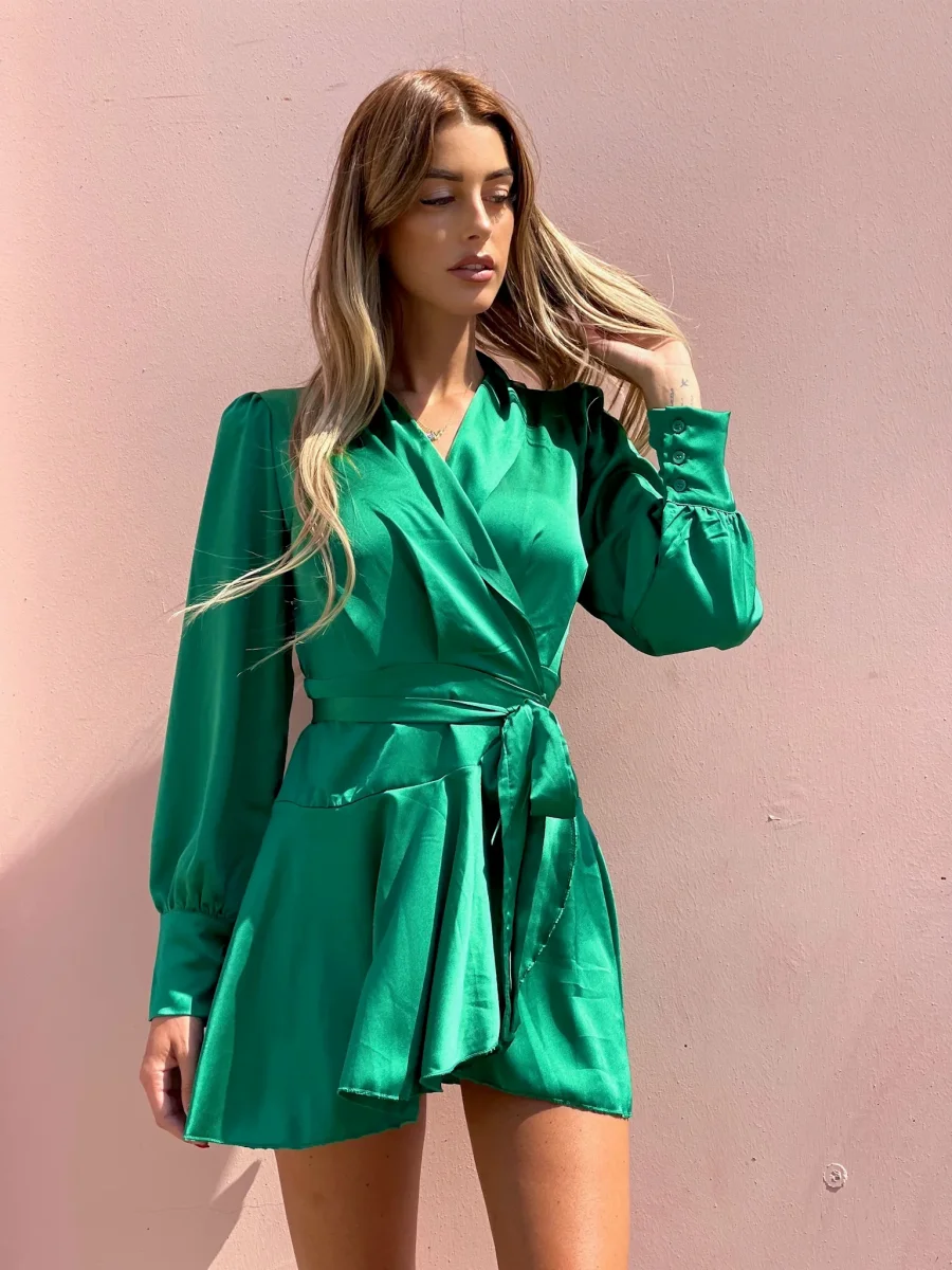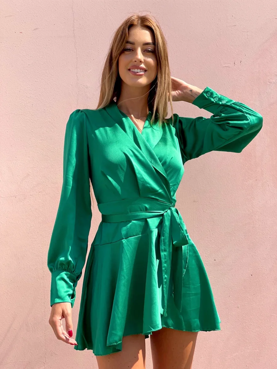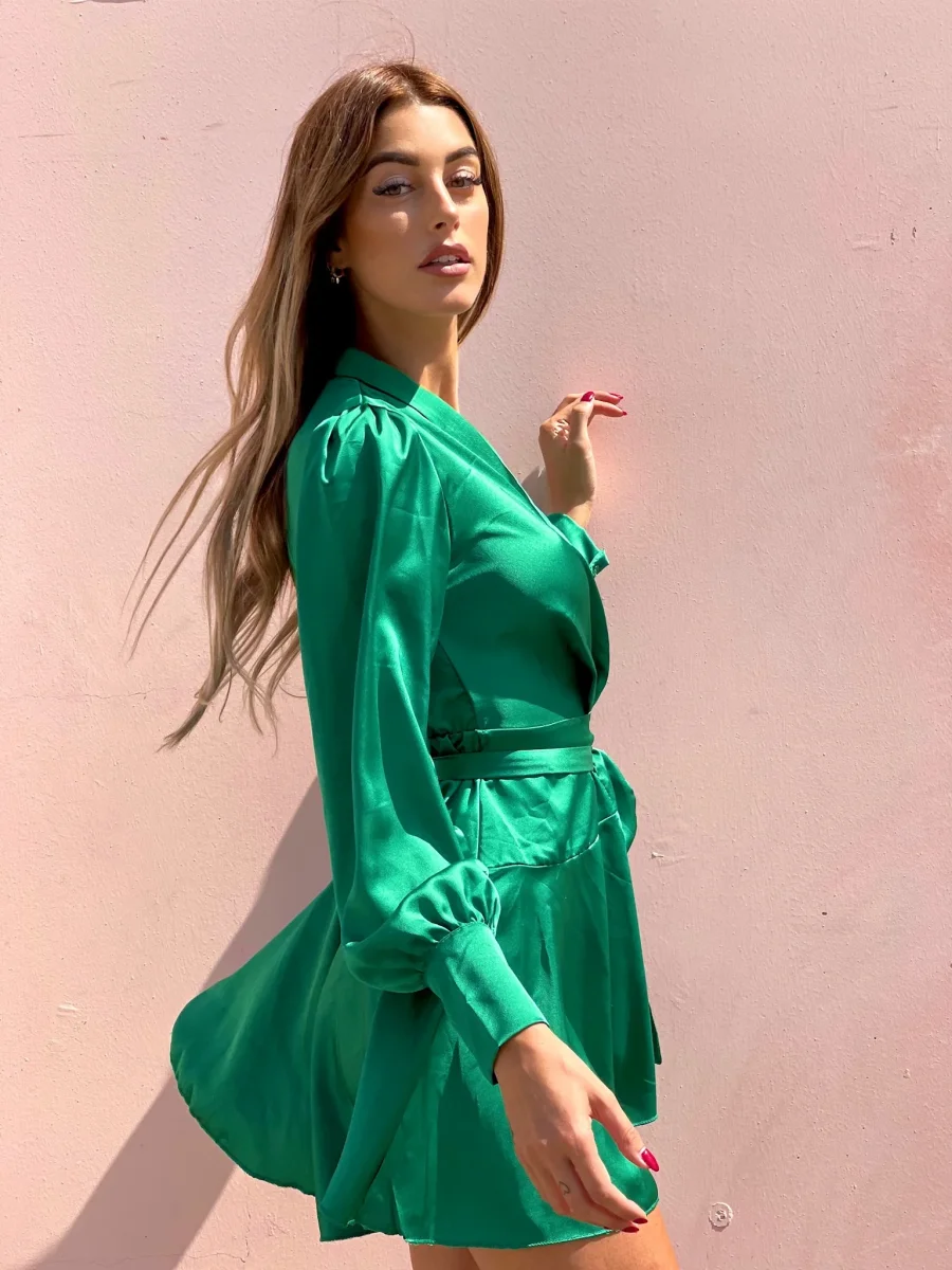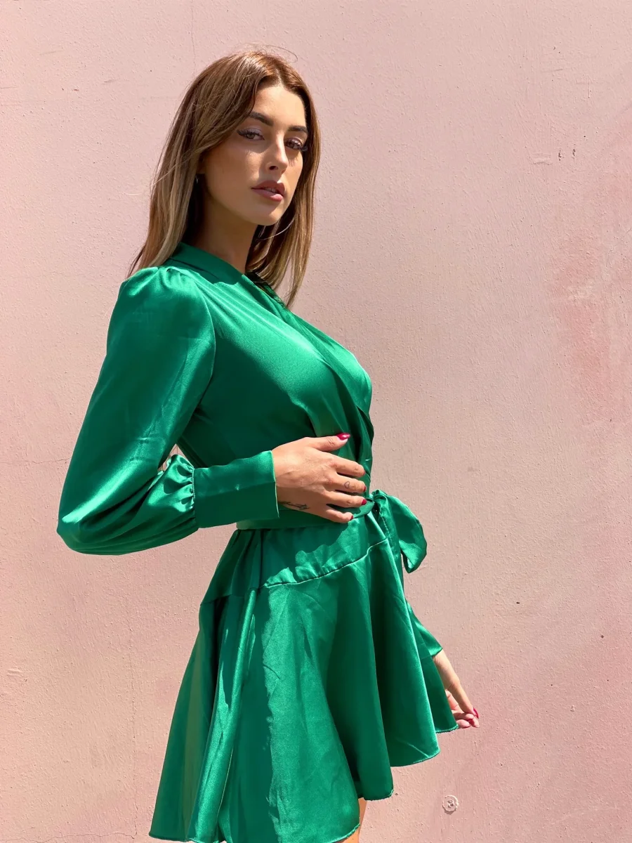 Abito in raso in un verde smeraldo sgargiante, chiusura a portafoglio e gonna asimmetrica. Fusciacca in vita tono su tono.