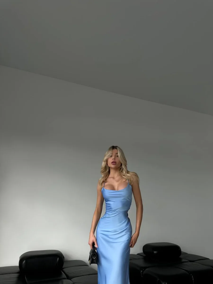 Abito in raso morbido senza coppe con schiena incrociata.