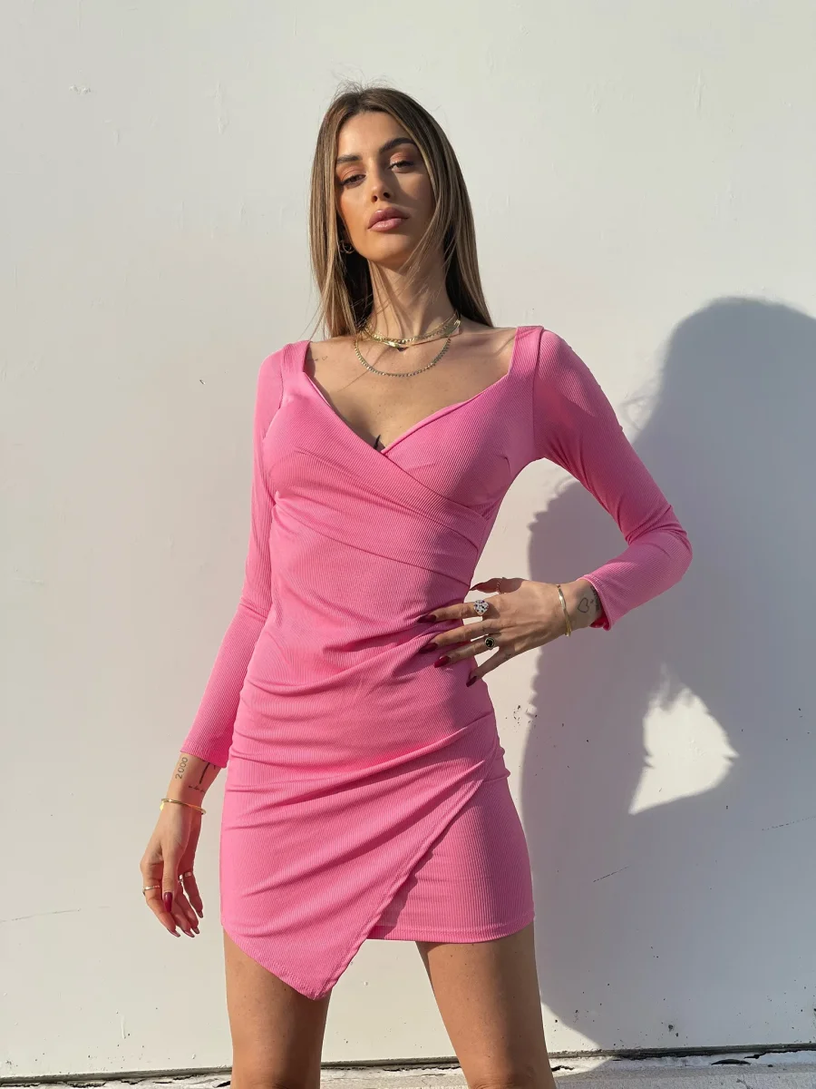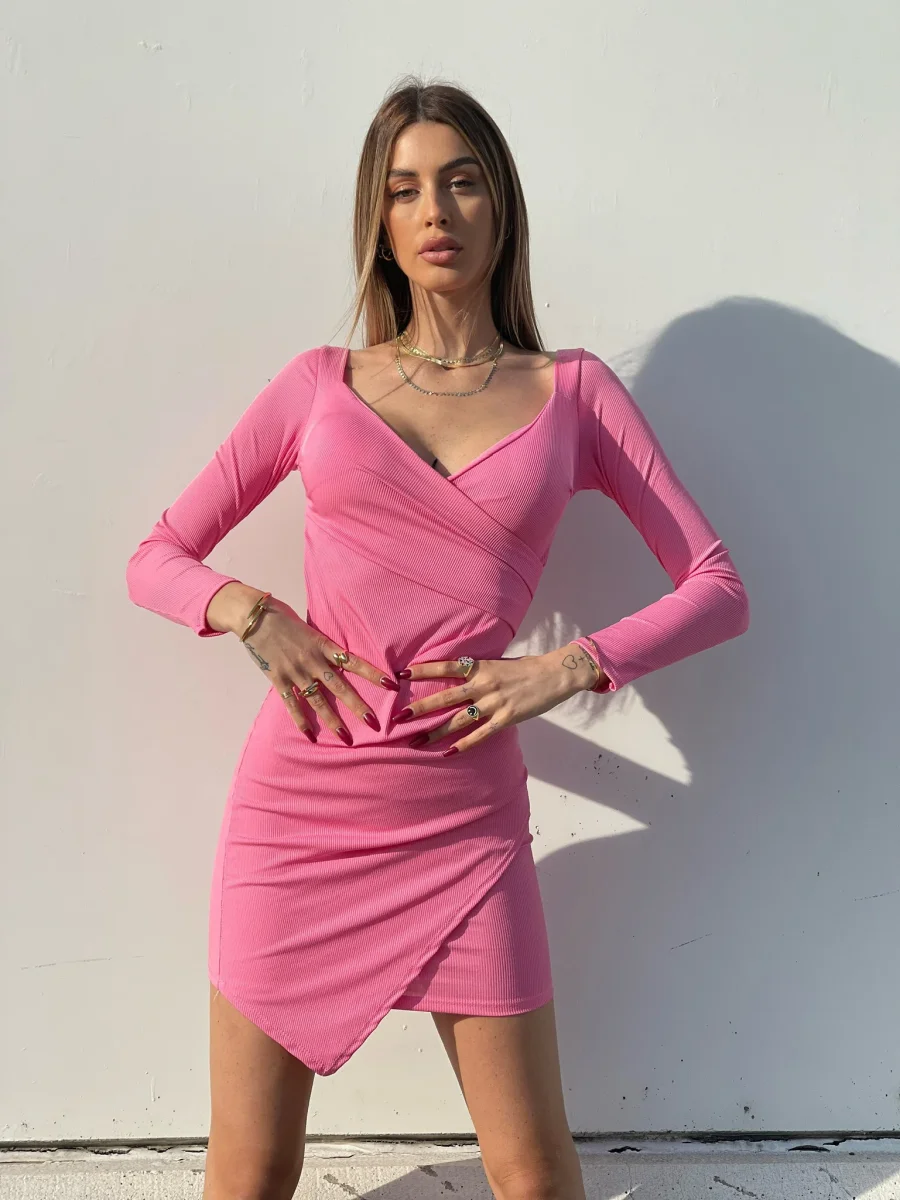 Abito incrociato con coppe e manica lunga. Tessuto a costine elasticizzato