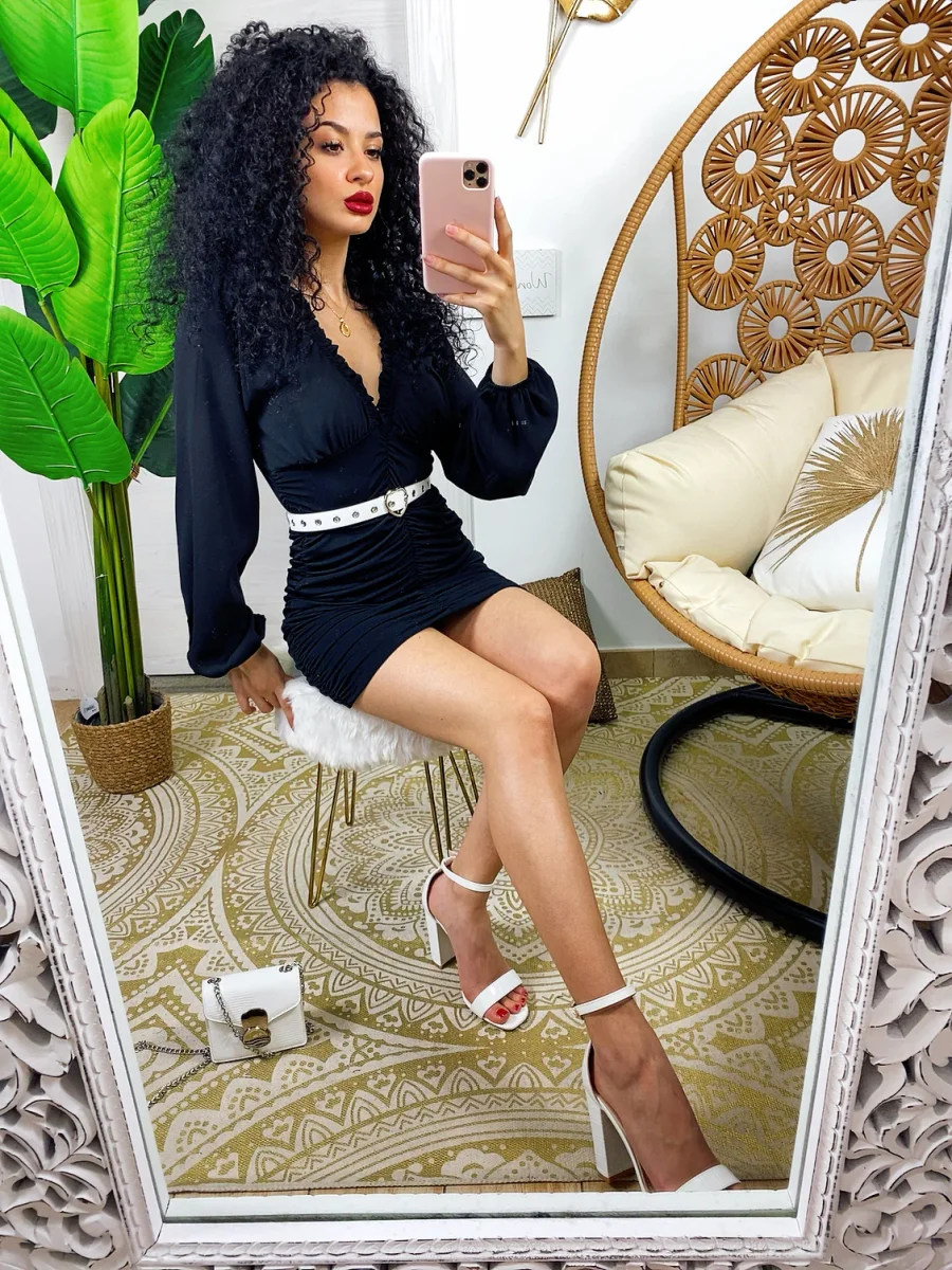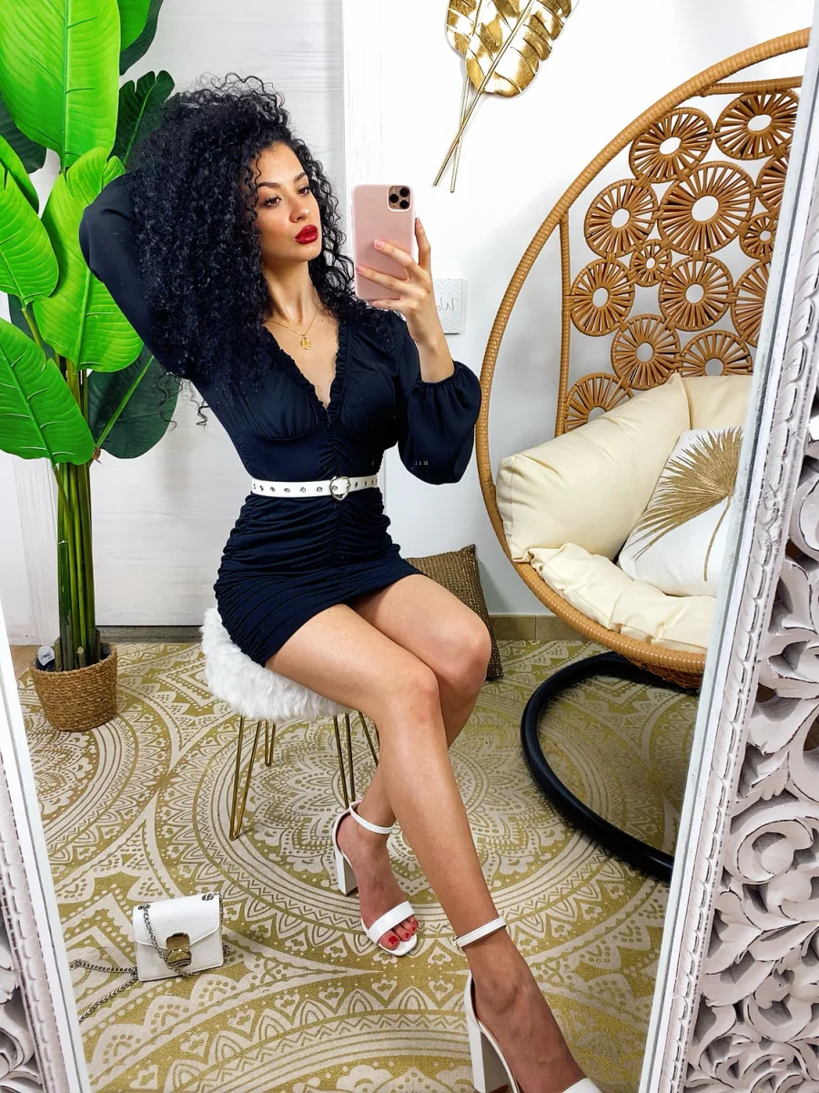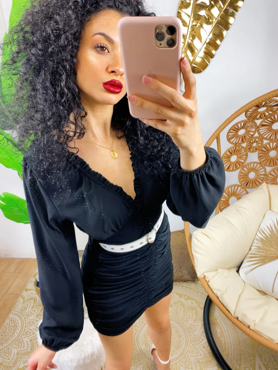 Abito in tessuto leggero con gonna foderata. Rouge sul davanti e dietro e maxi scollo. Taglia unica tessuto elasticizzato