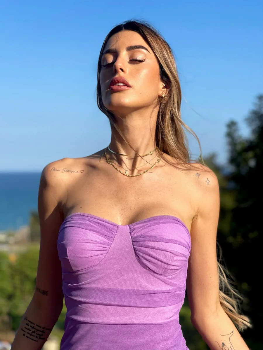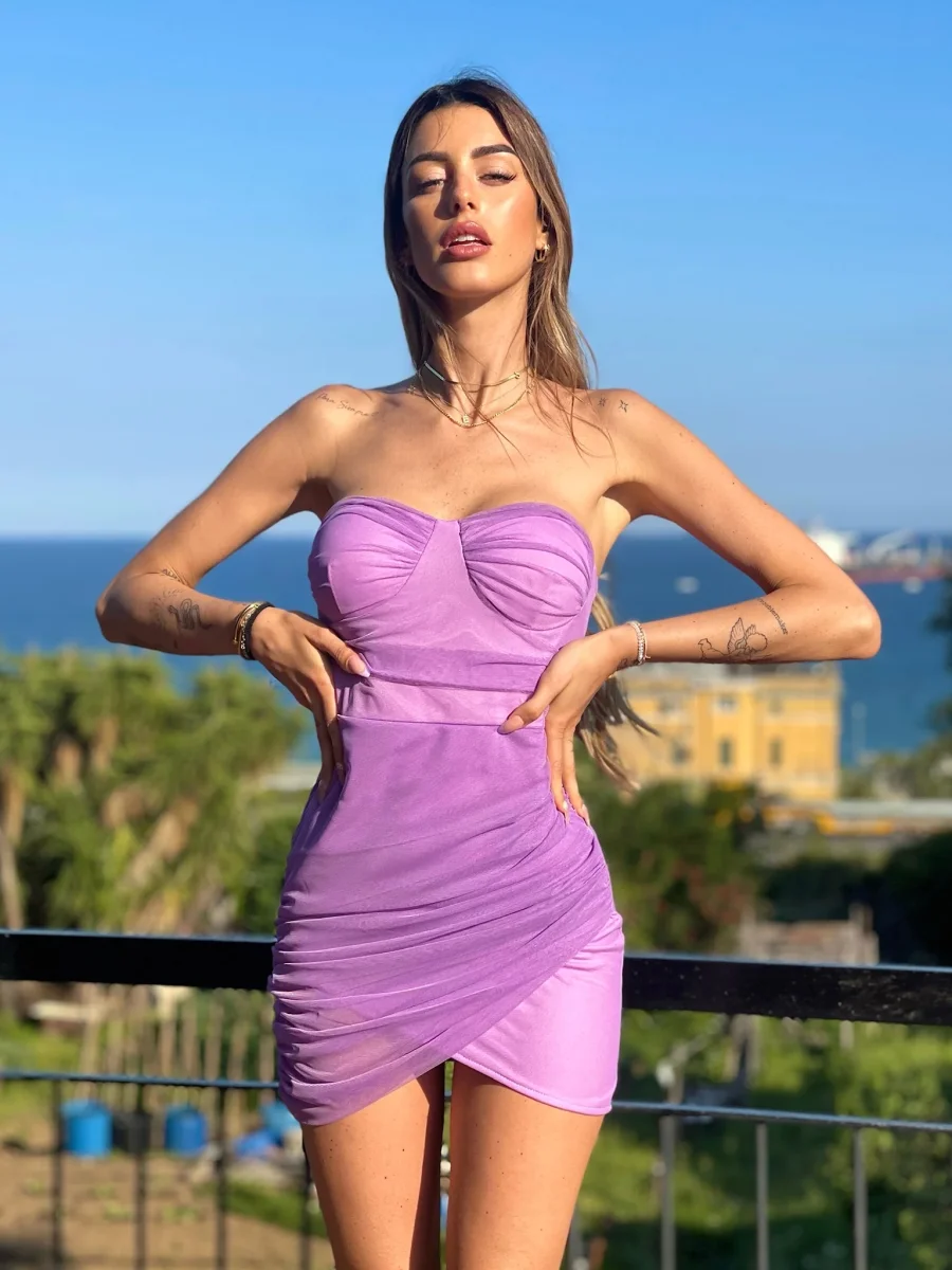 Abito lilla a bustino con coppe e gonna a portafoglio.