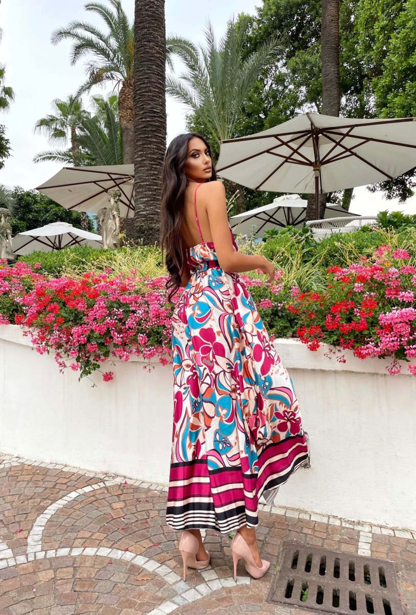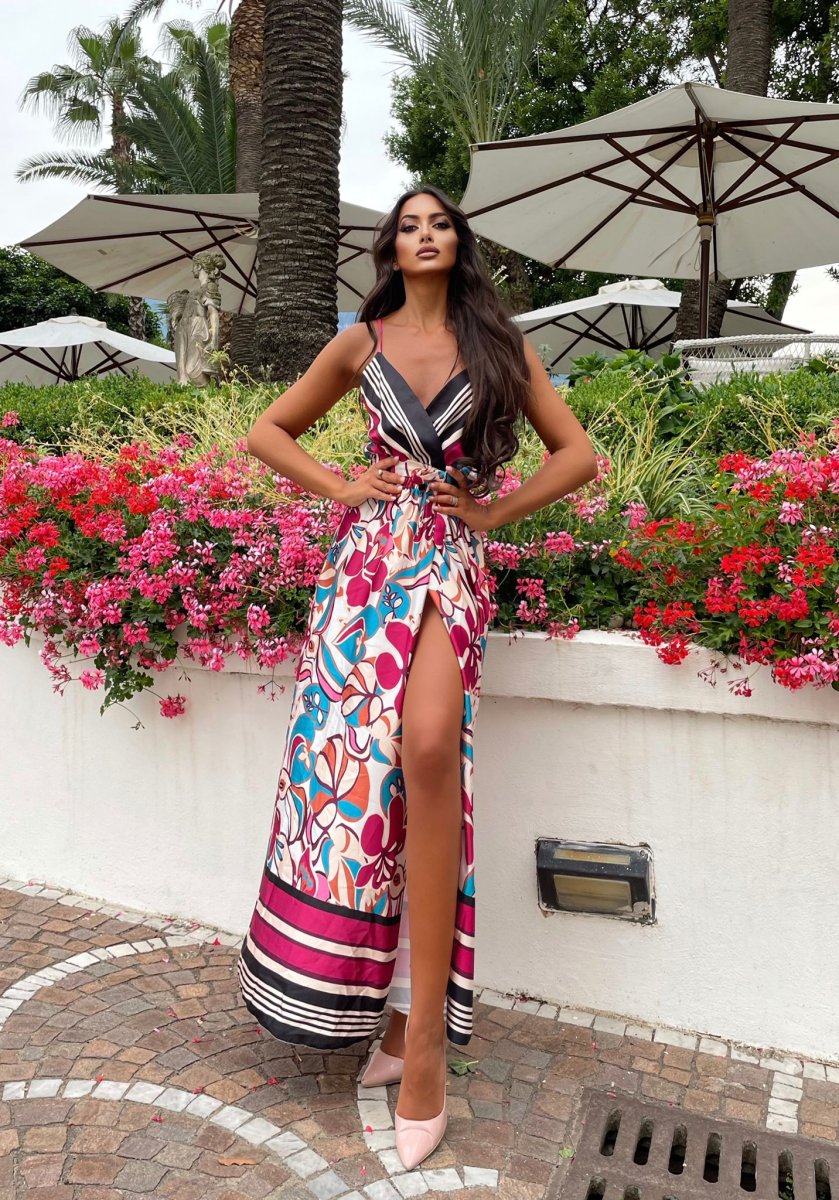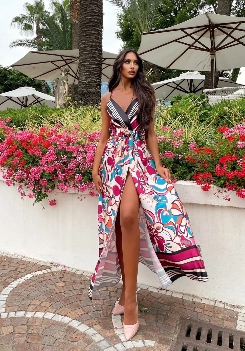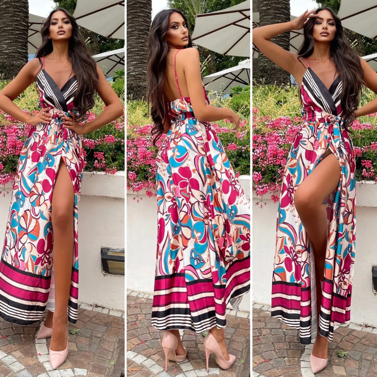 Abito lungo con maxi spacco e incrocio sul seno, cintura tono su tono