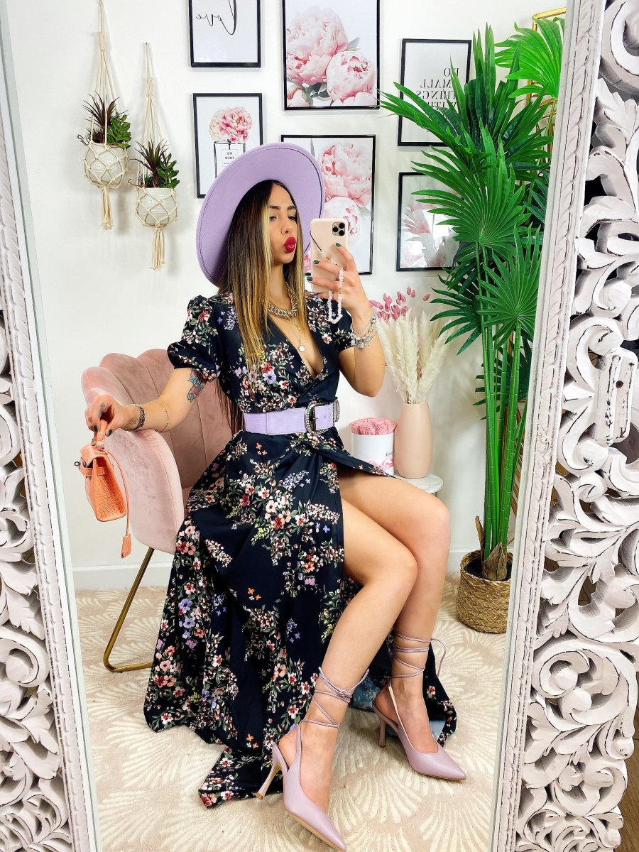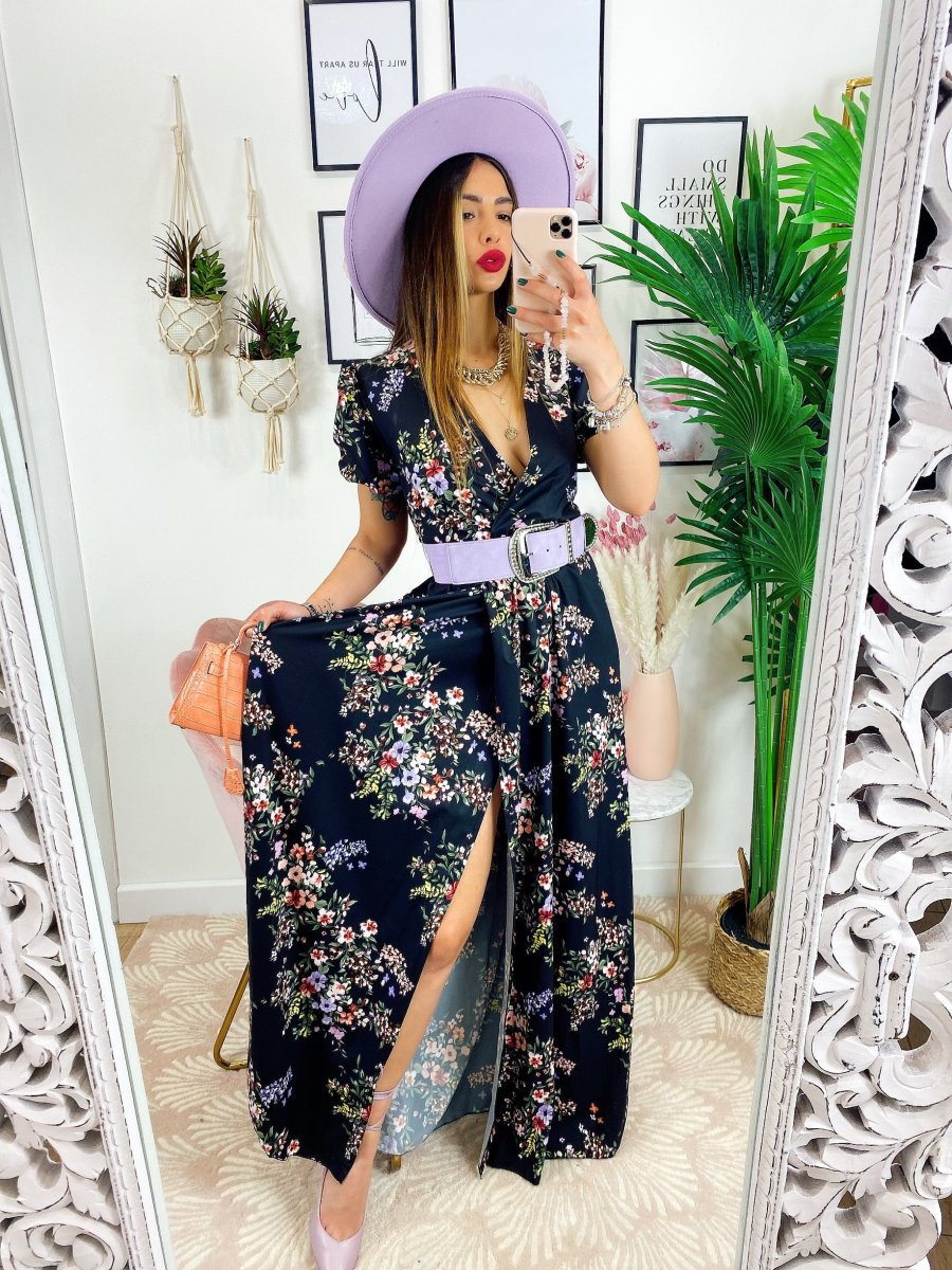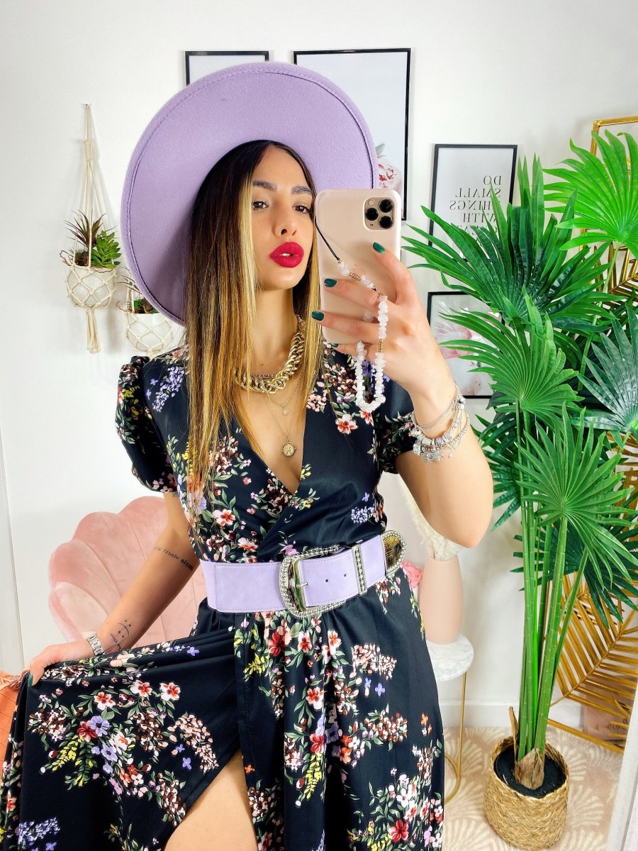 Abito a fiorellini base nera Con scollo a V e cintura in vita.