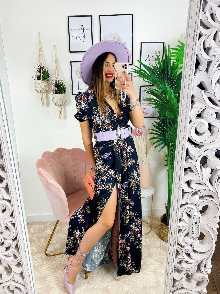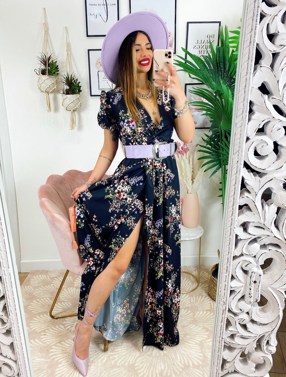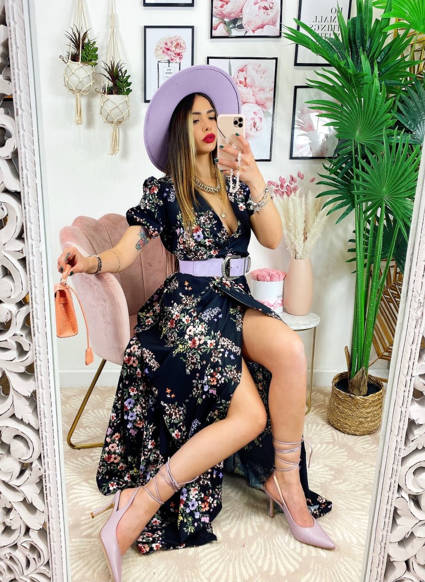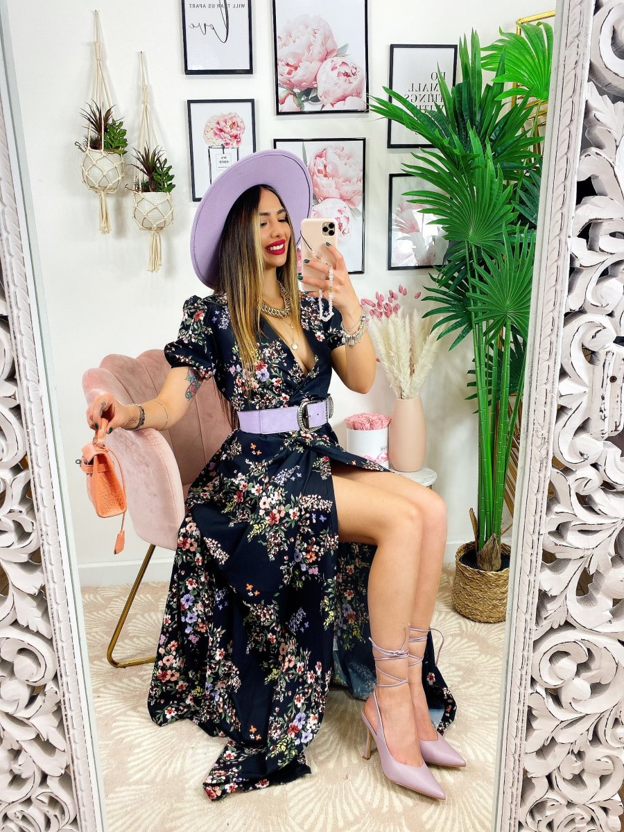 Abito a fiorellini base nera Con scollo a V e cintura in vita.