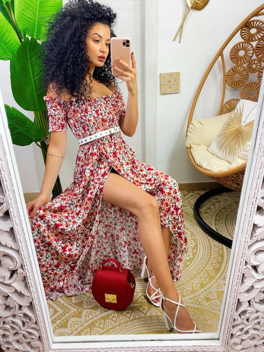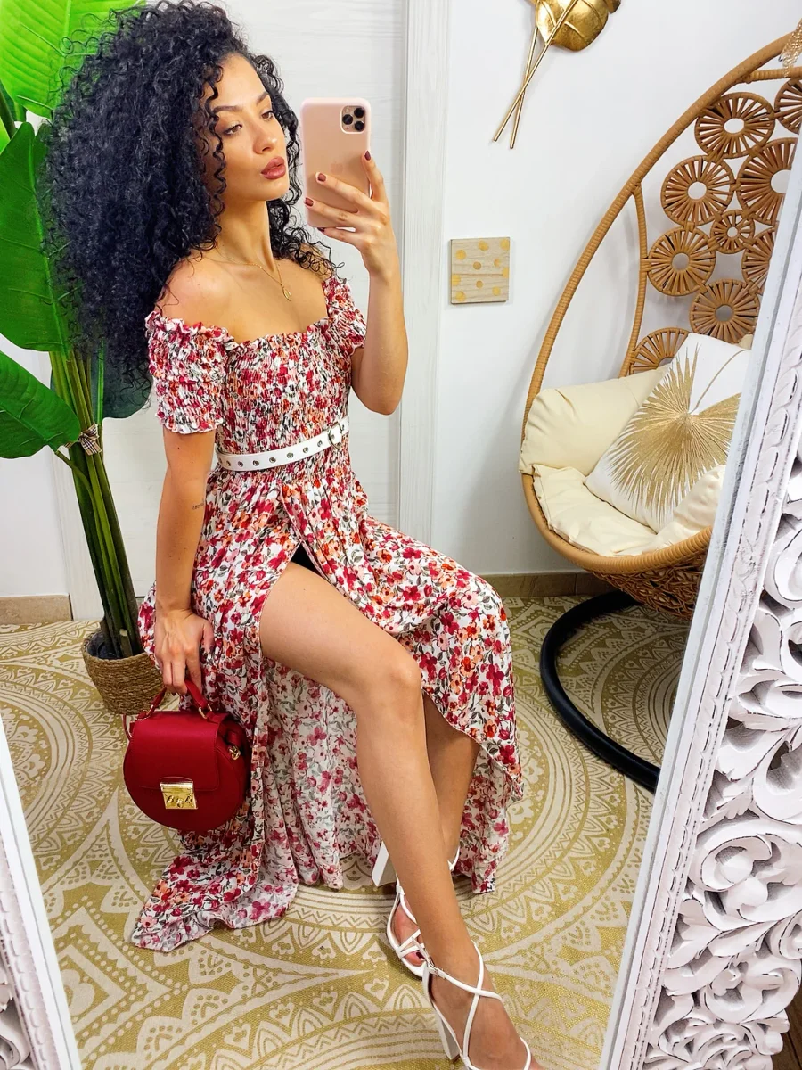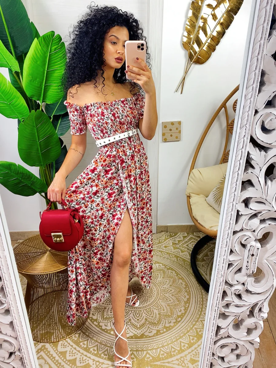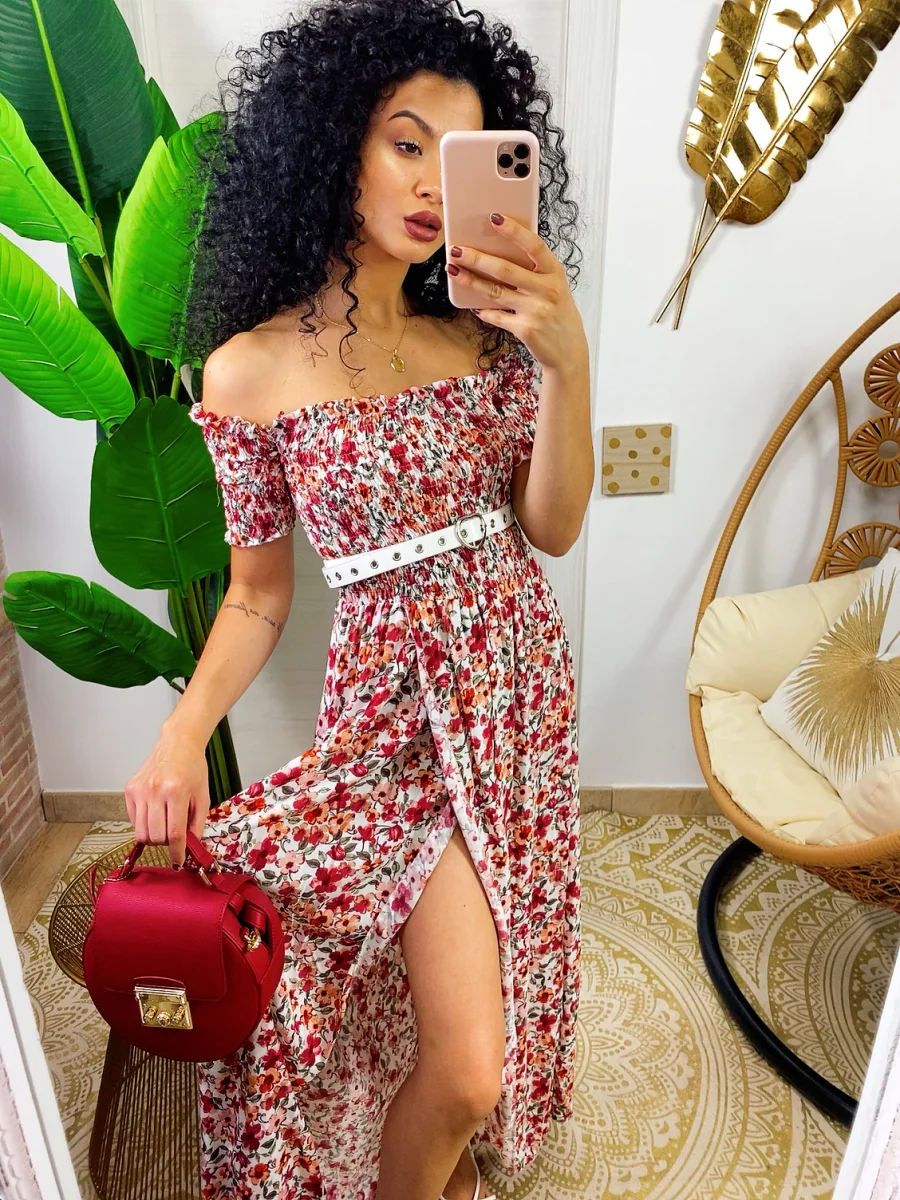 Abito con scollo a barchetta arricciato e elasticizzato. Maxi spacco sul davanti. Fresco e comodo sia da giorno che da sera con una cinturina.
