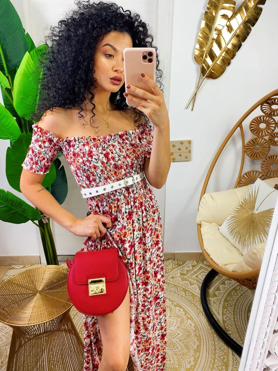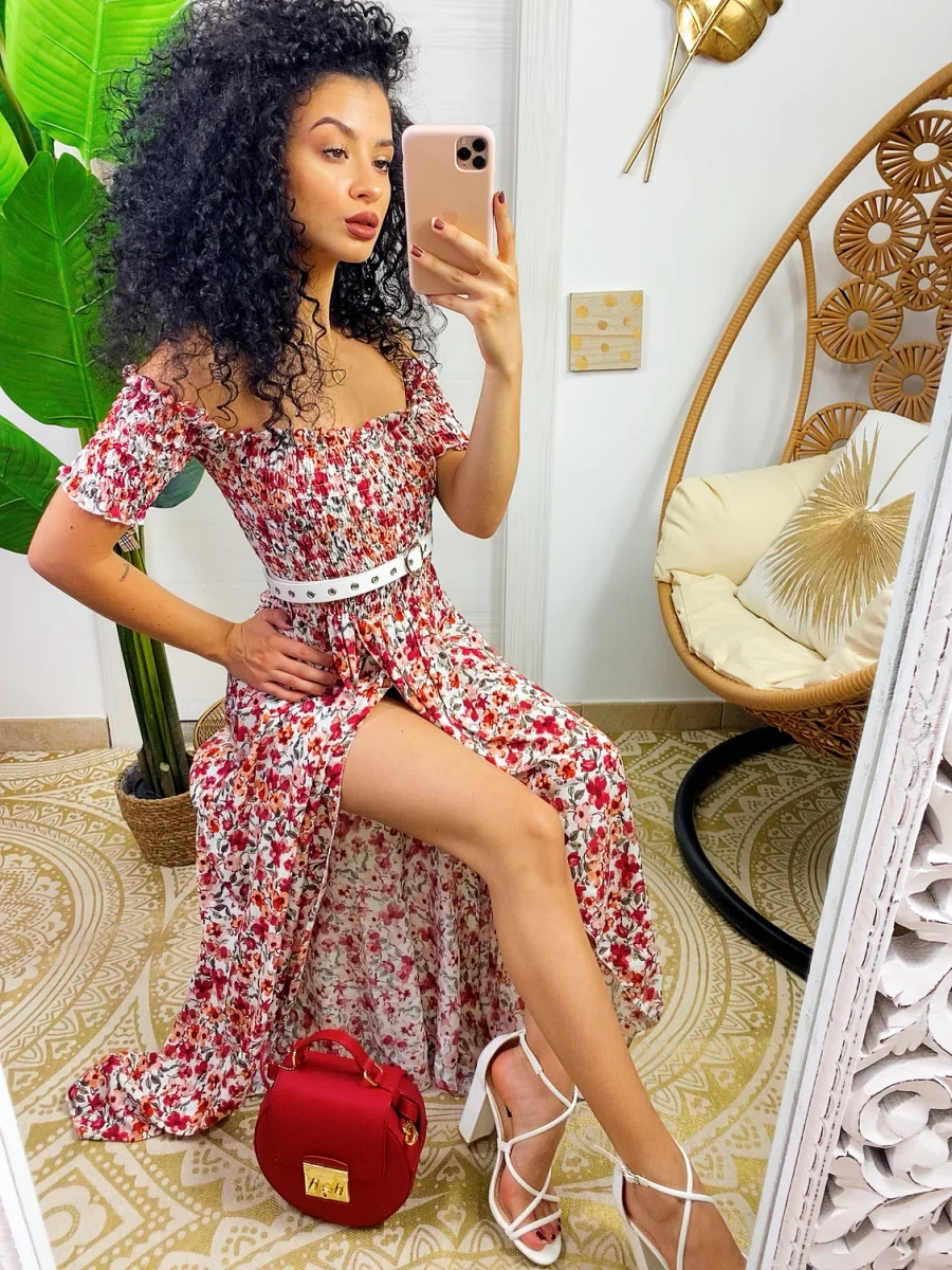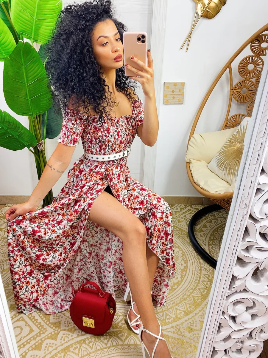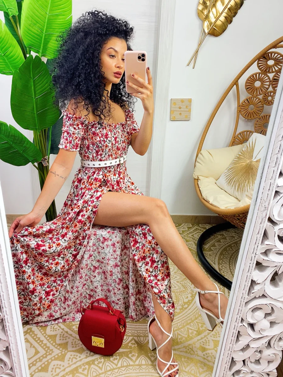 Abito con scollo a barchetta arricciato e elasticizzato. Maxi spacco sul davanti. Fresco e comodo sia da giorno che da sera con una cinturina.