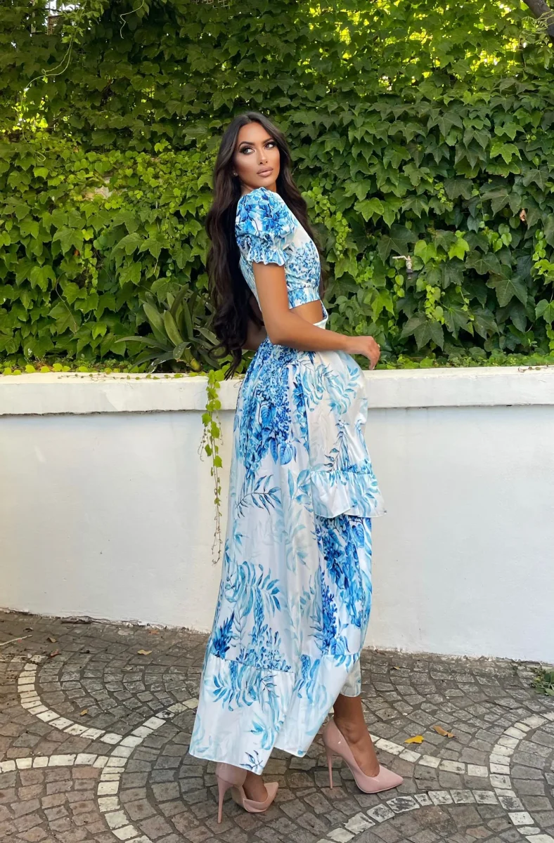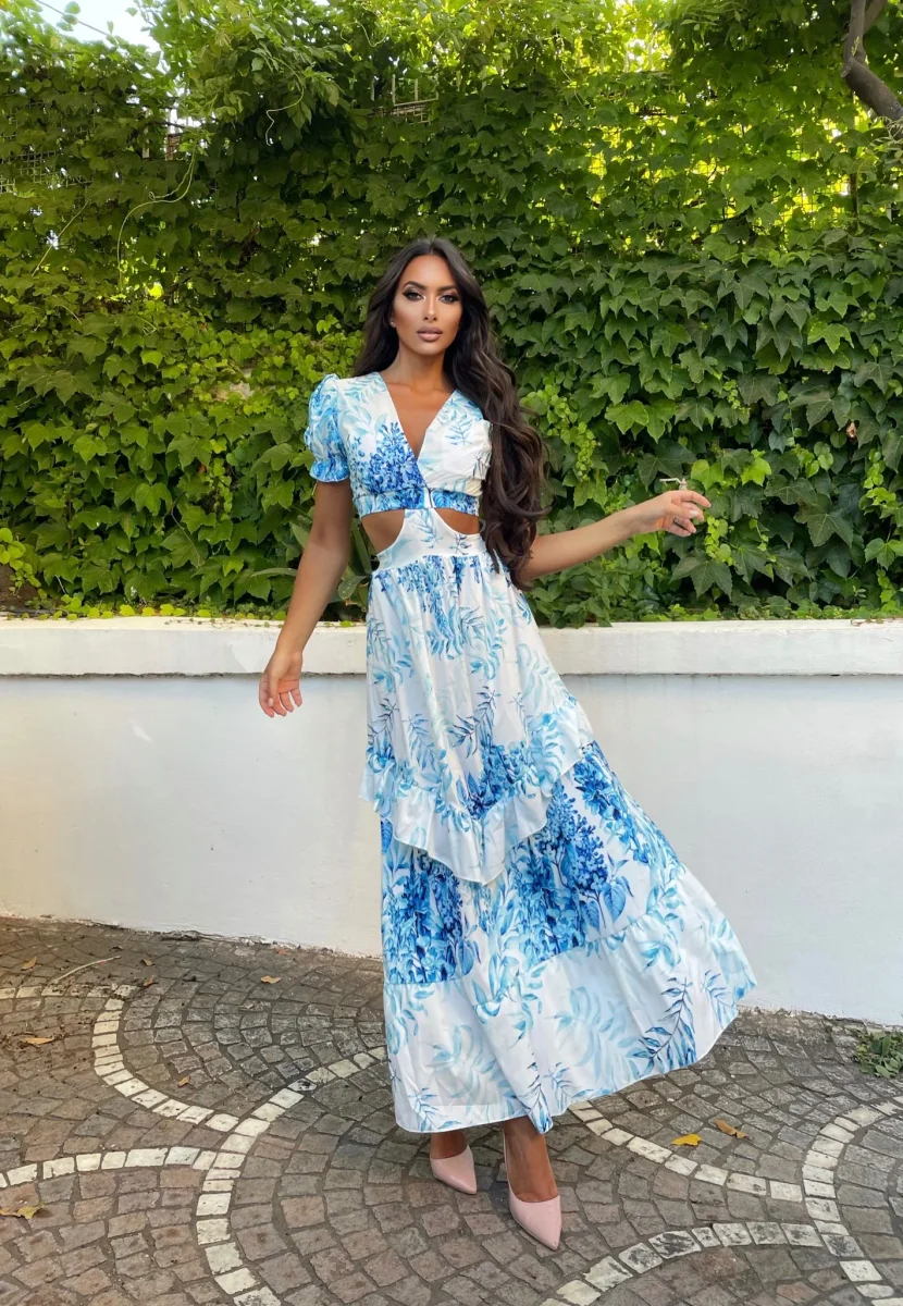 Abito lungo con fantasia a fiori azzurri, manica a palloncino e balze sul fondo.