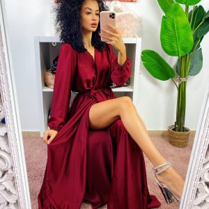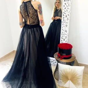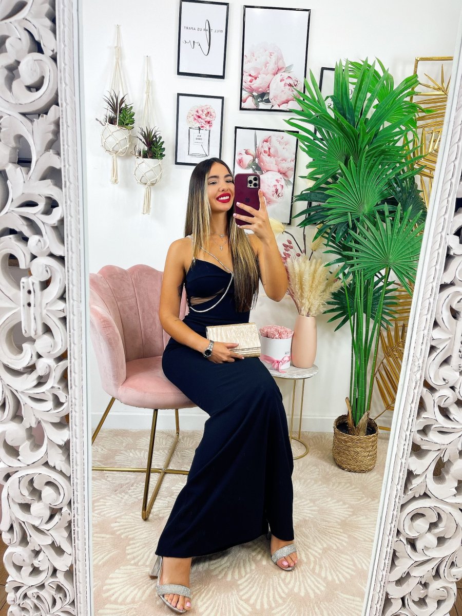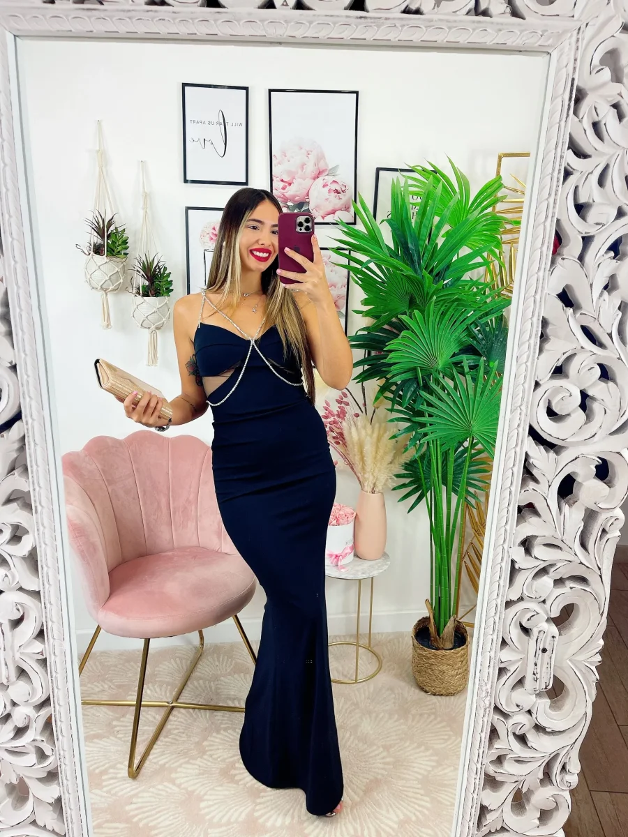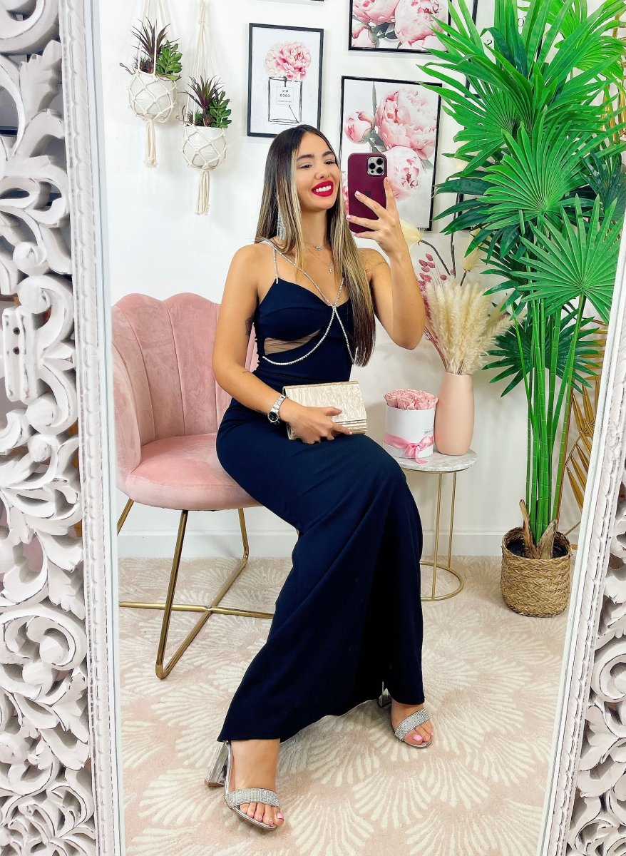 Abito lungo con dettaglio in strass, trasparenze sul seno con coppe e bretelline regolabili.