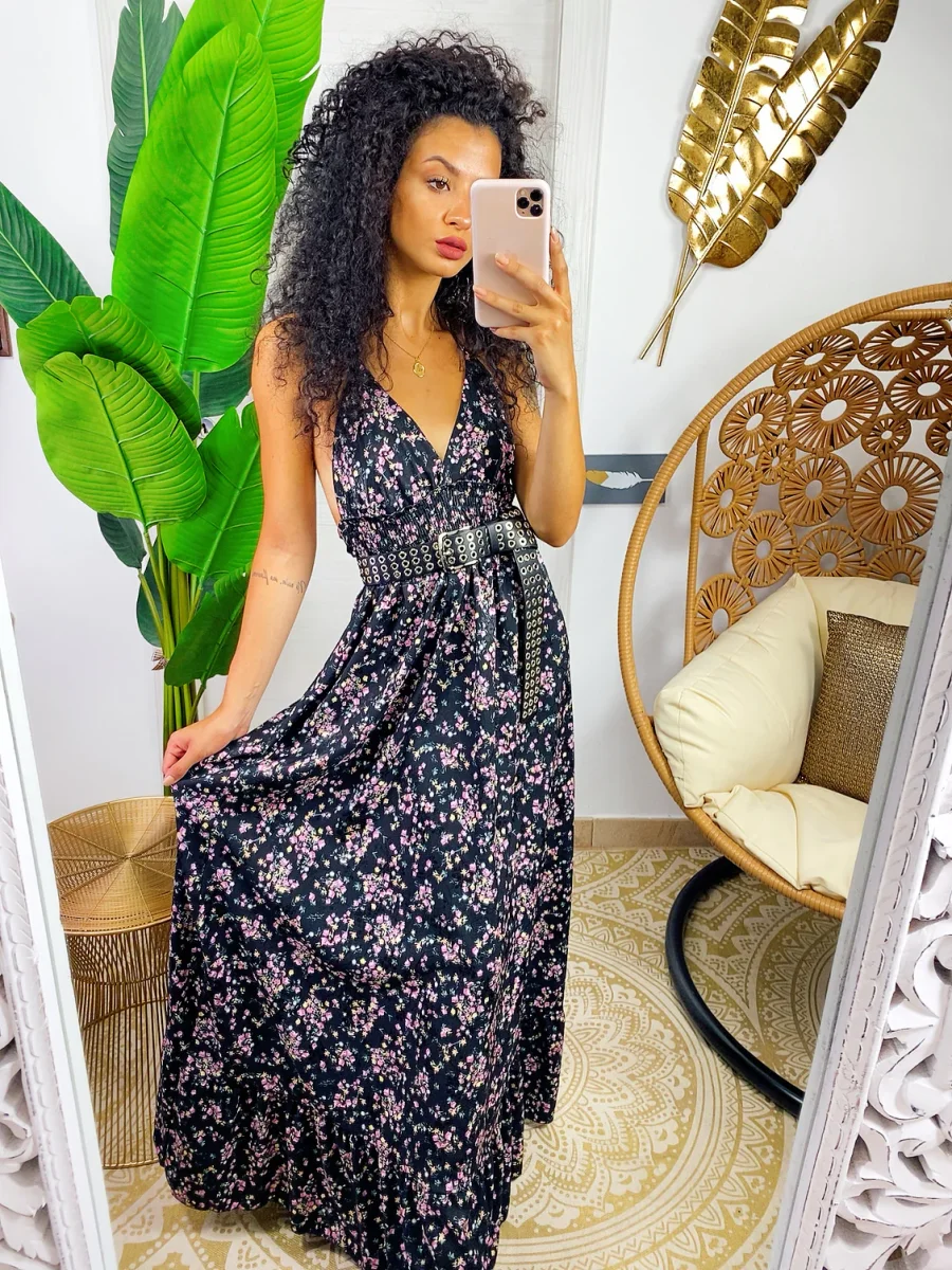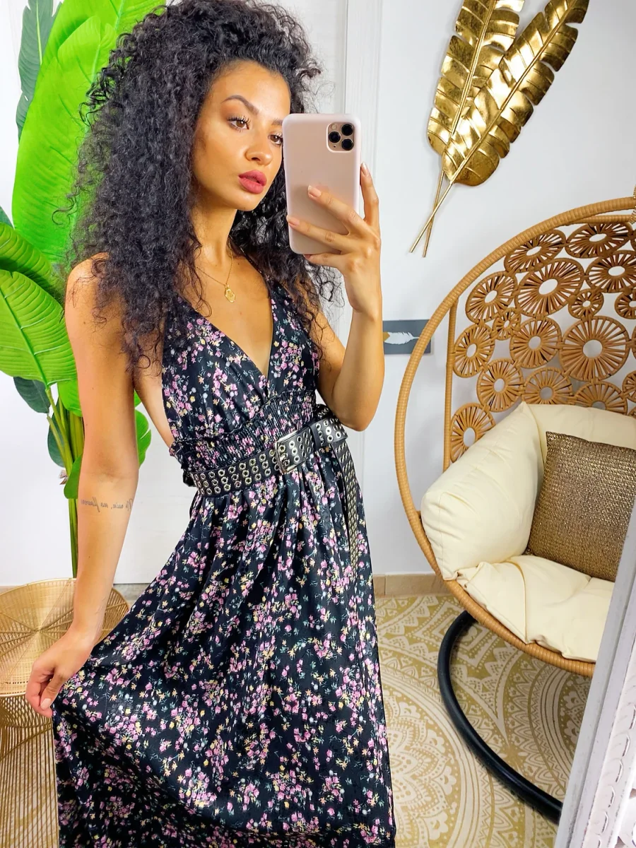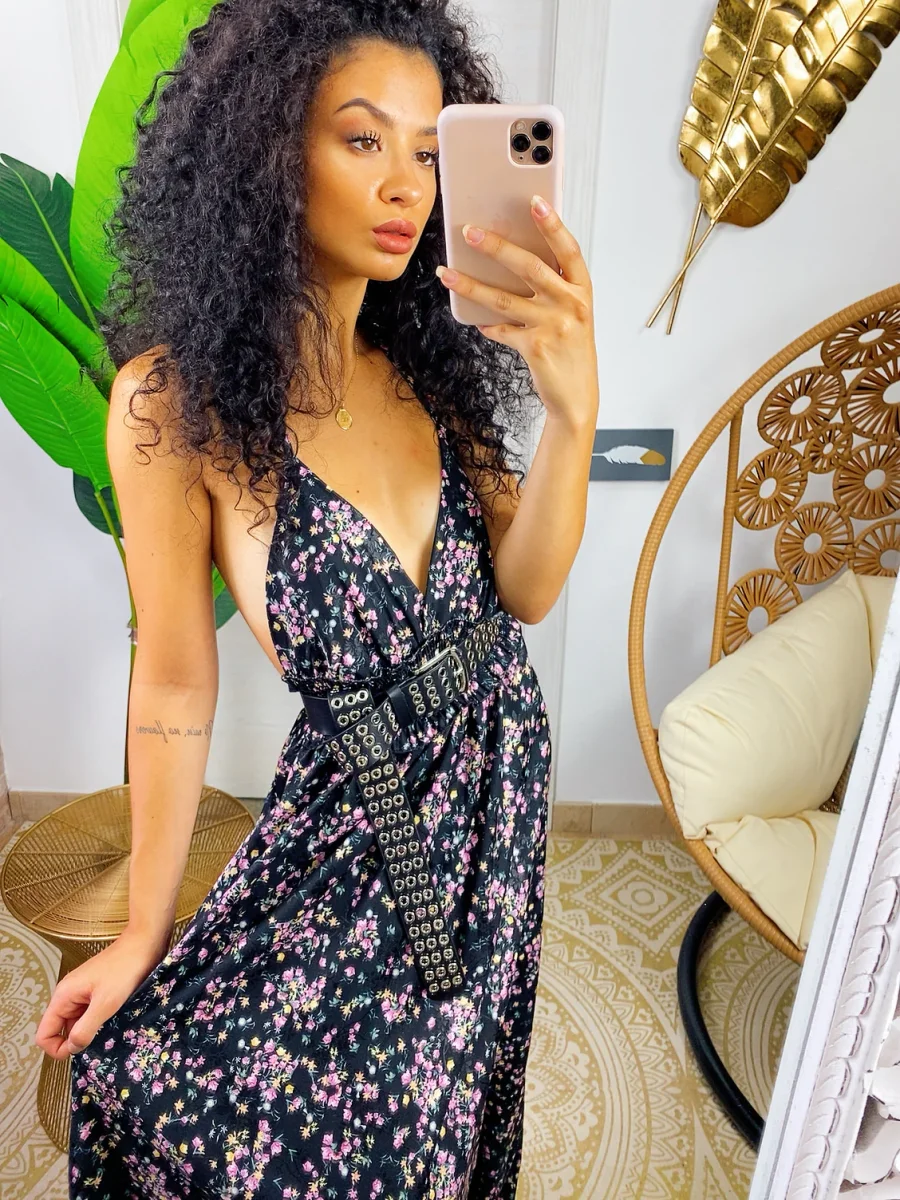 Abito con schiena aperta a fiorellini, allacciatura dietro al collo. Fresco e comodo sia da giorno che da sera con una cinturina.