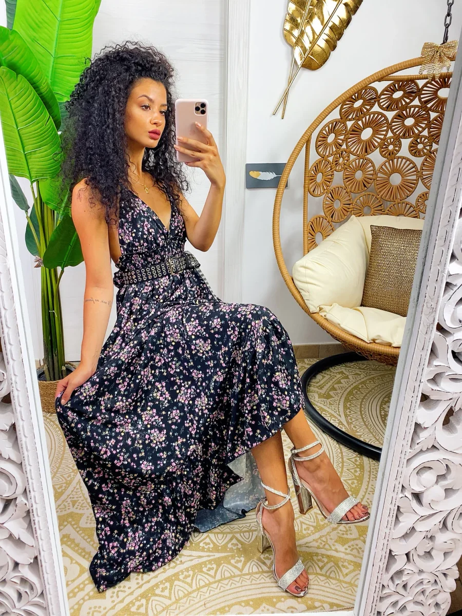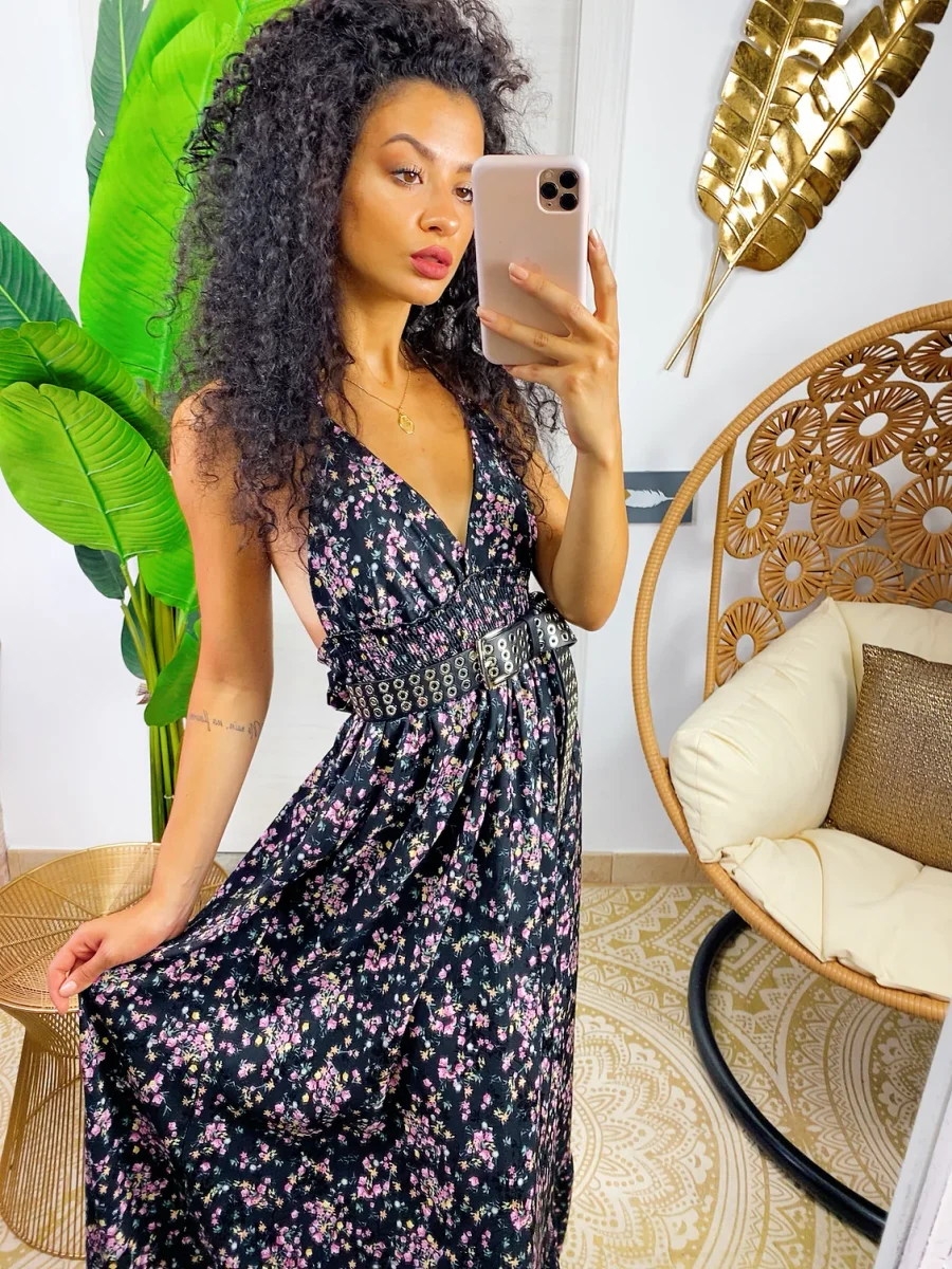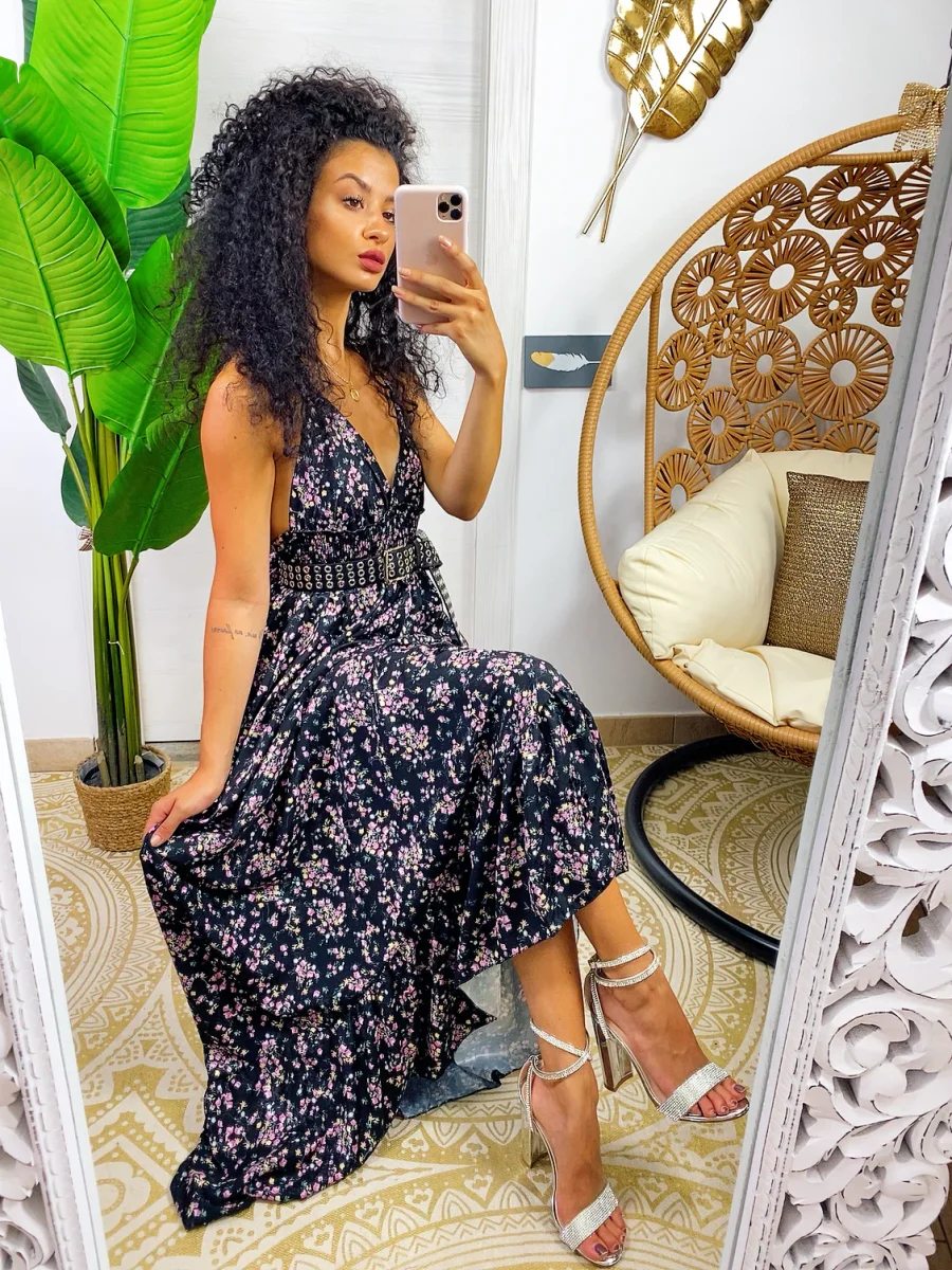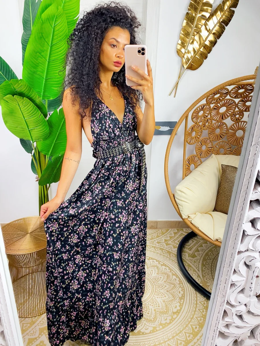 Abito con schiena aperta a fiorellini, allacciatura dietro al collo. Fresco e comodo sia da giorno che da sera con una cinturina.