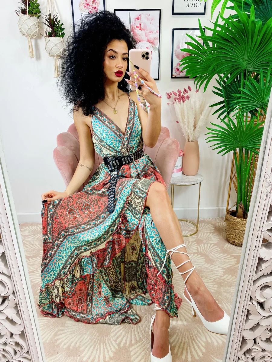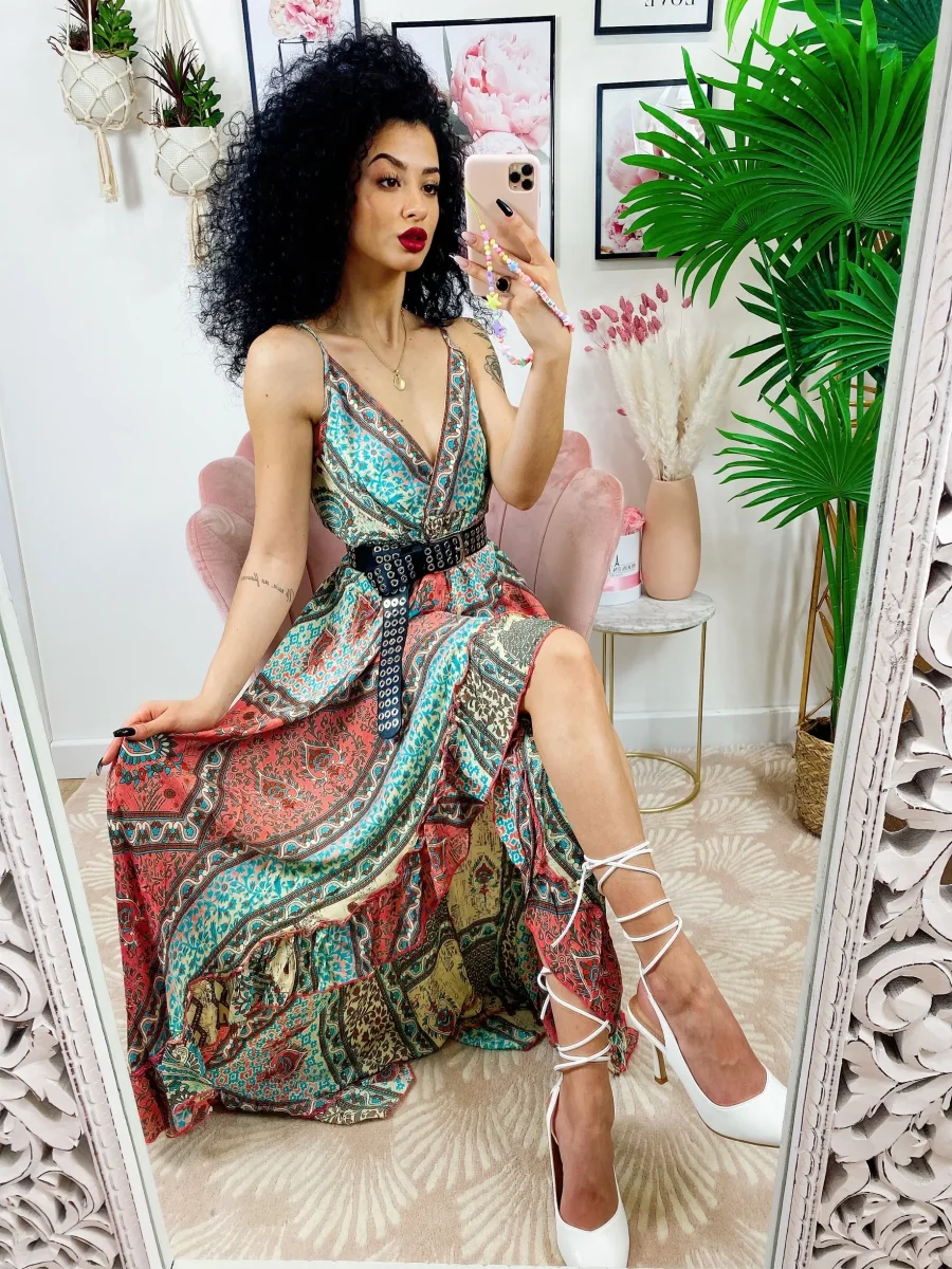 Abito con scollo a V e spalline a bretellina . Fresco e comodo sia da giorno che da sera con una cinturina. Elastico in vita
