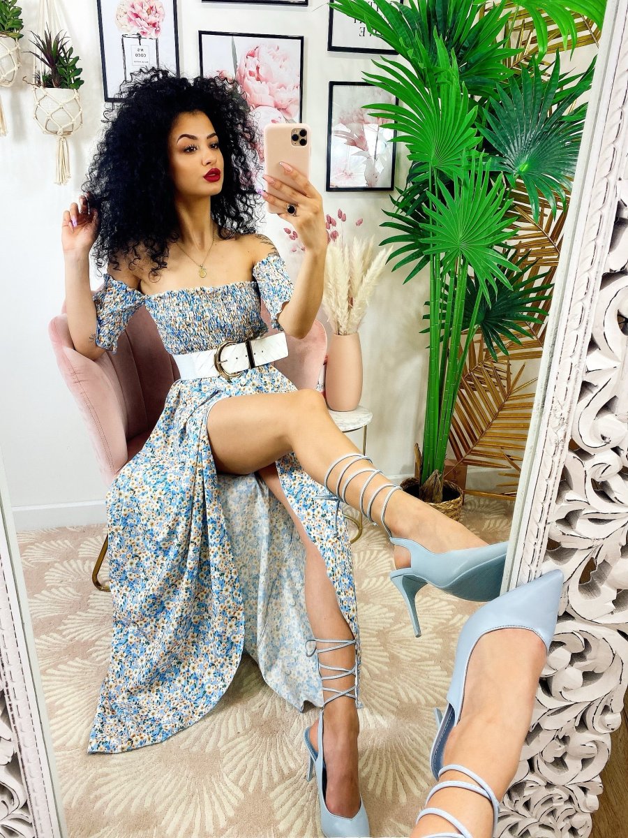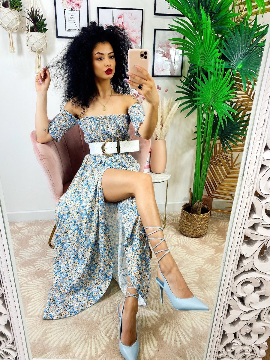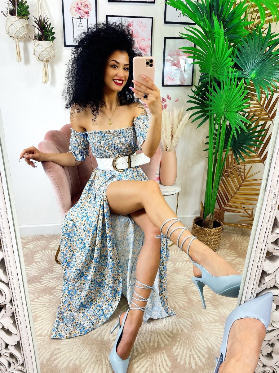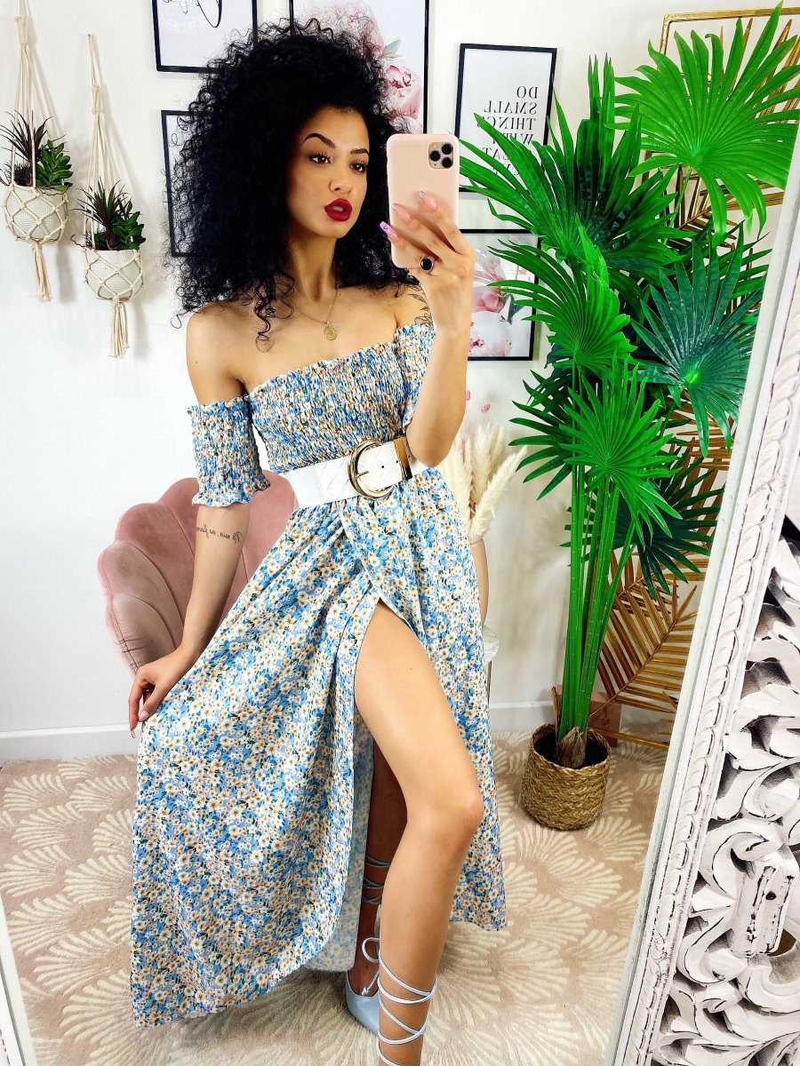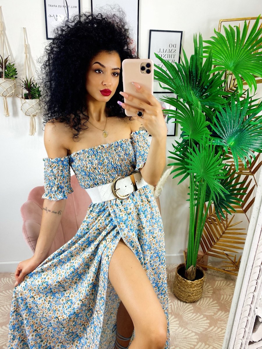 Abito con scollo a barchetta arricciato elasticizzato. Maxi spacco sul davanti. Fresco e comodo sia da giorno che da sera con una cinturina.