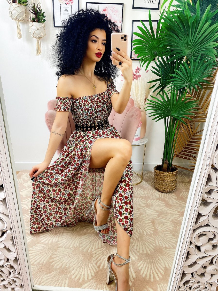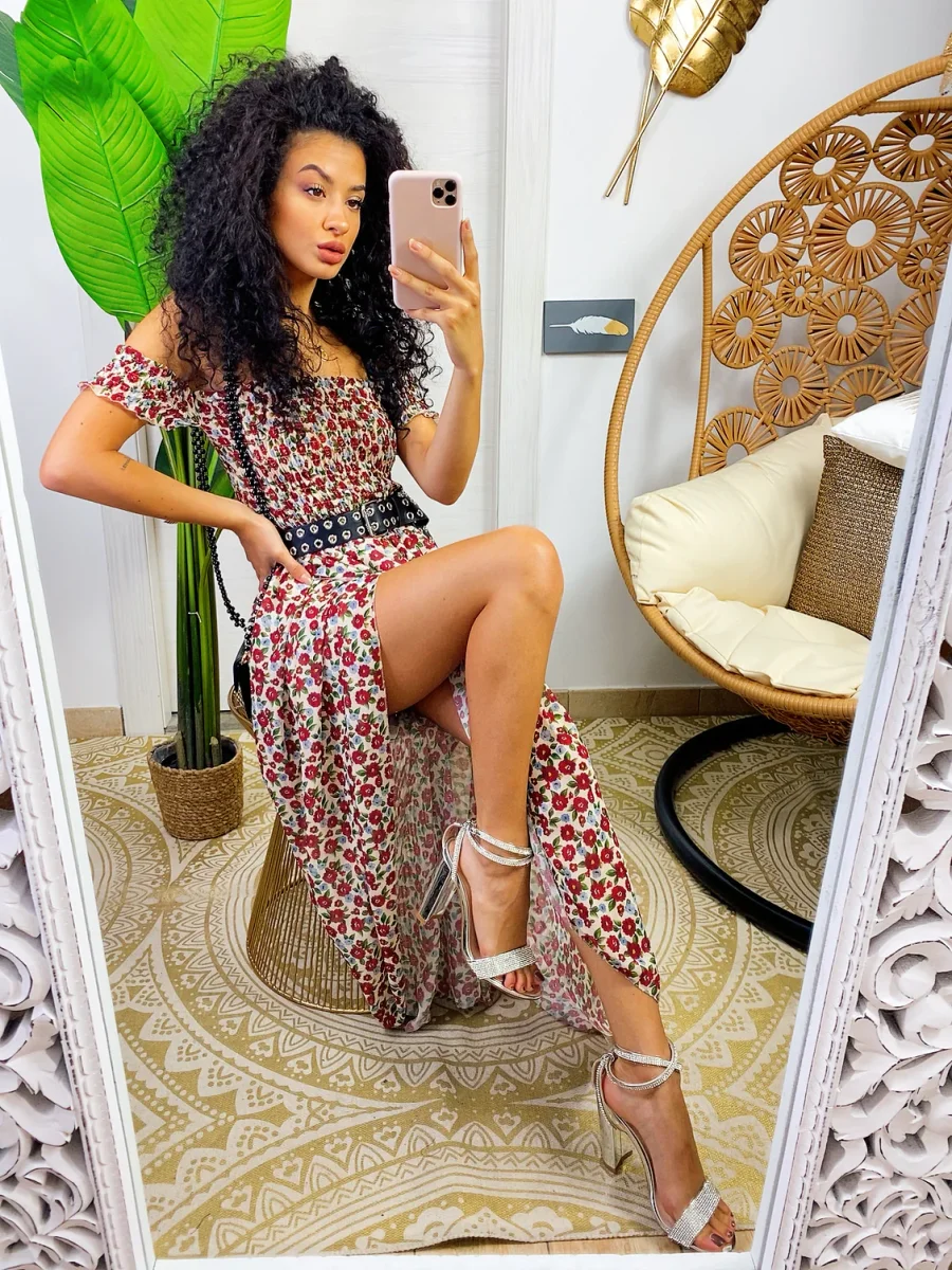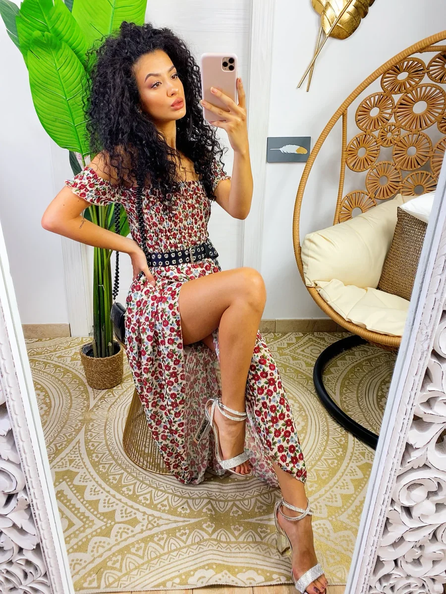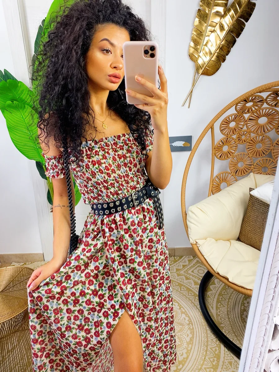 Abito con scollo a barchetta arricciato elasticizzato. Maxi spacco sul davanti. Fresco e comodo sia da giorno che da sera con una cinturina.