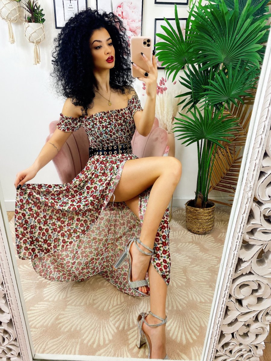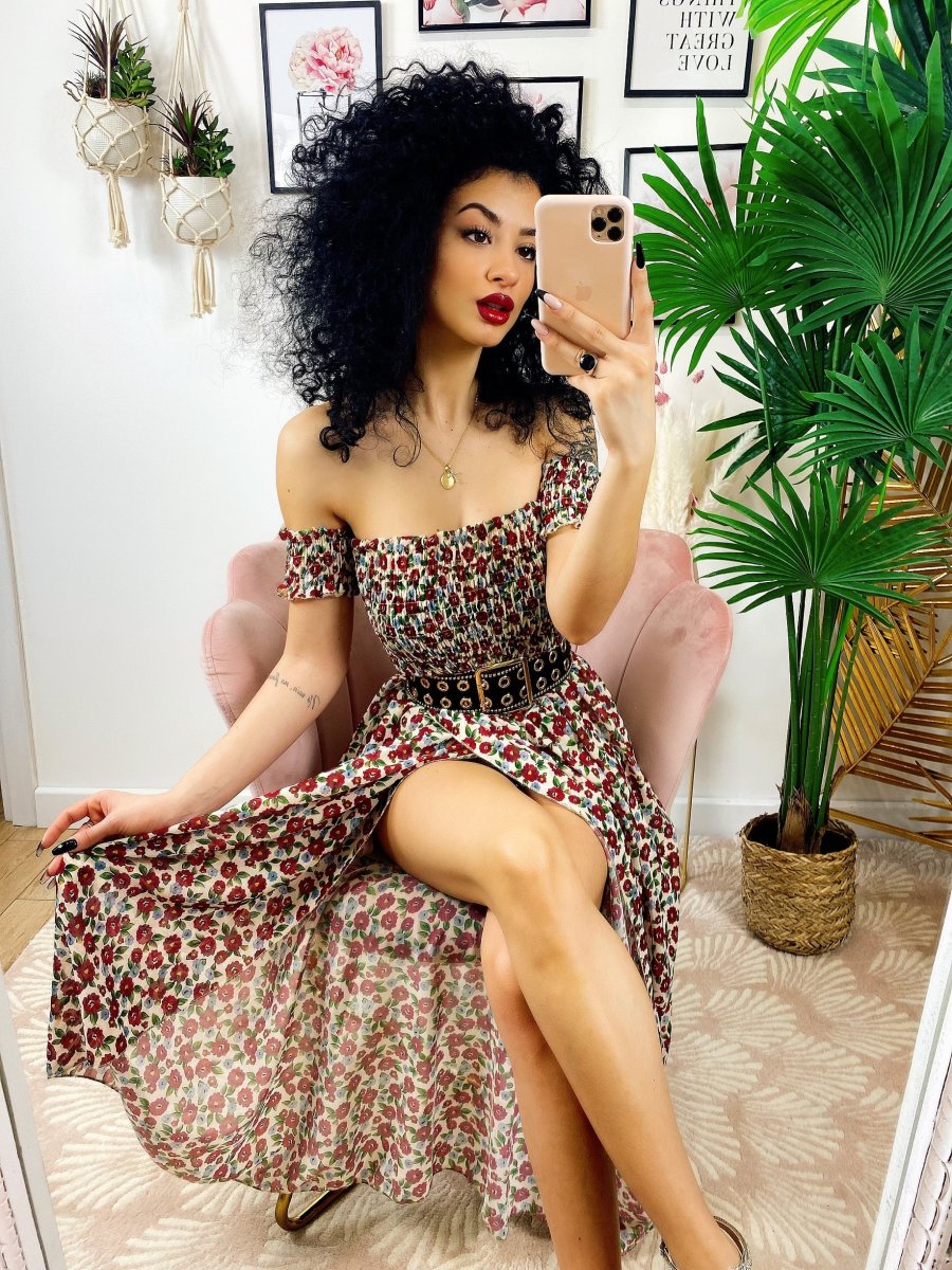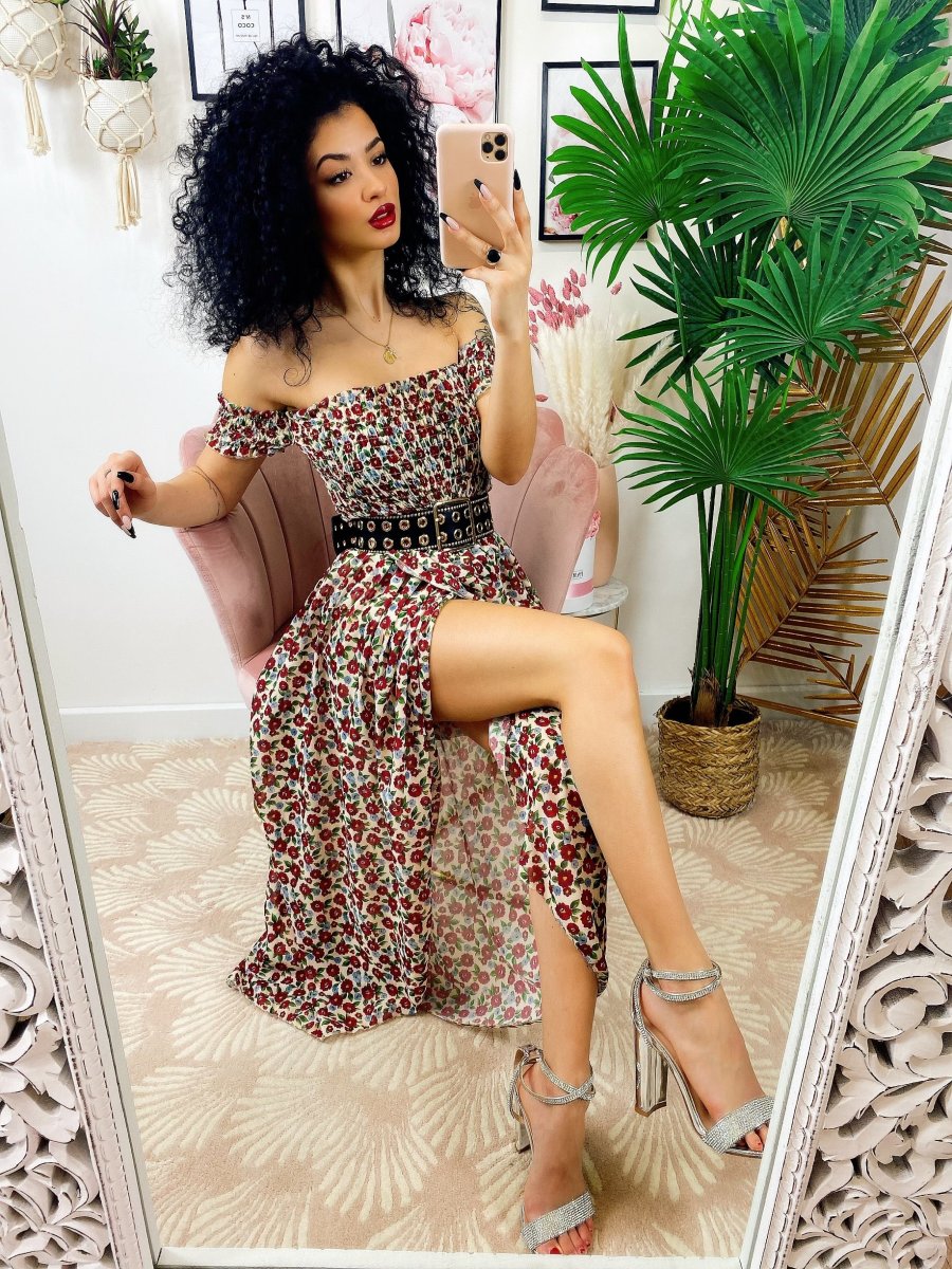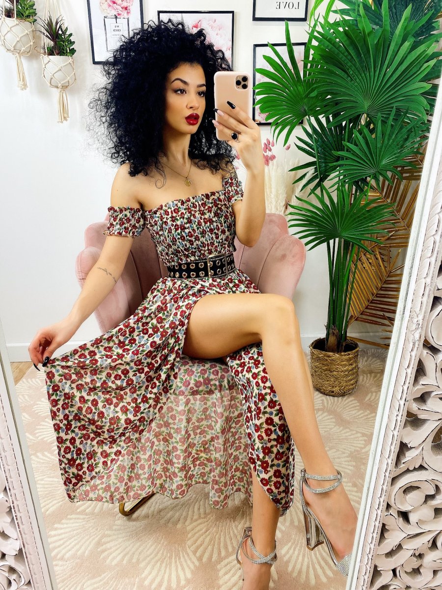 Abito con scollo a barchetta arricciato elasticizzato. Maxi spacco sul davanti. Fresco e comodo sia da giorno che da sera con una cinturina.