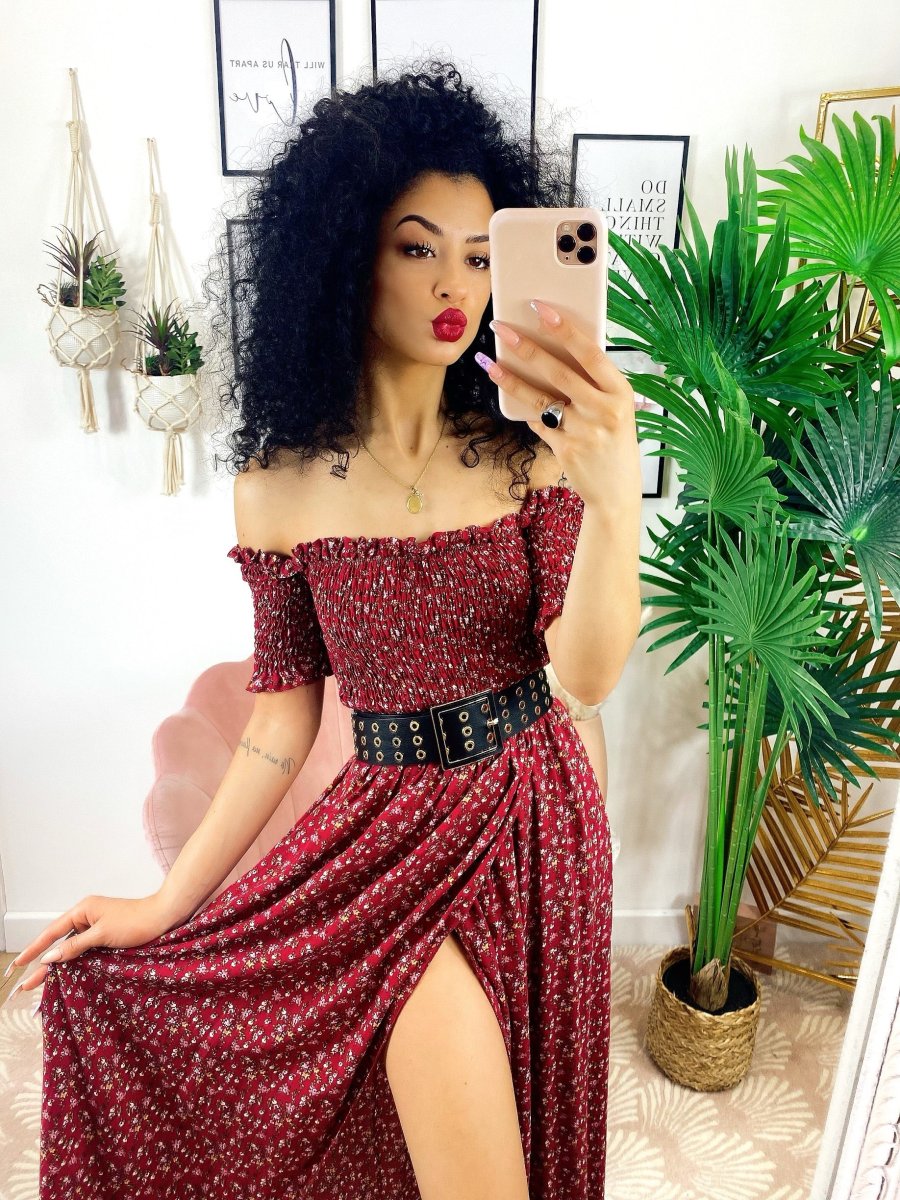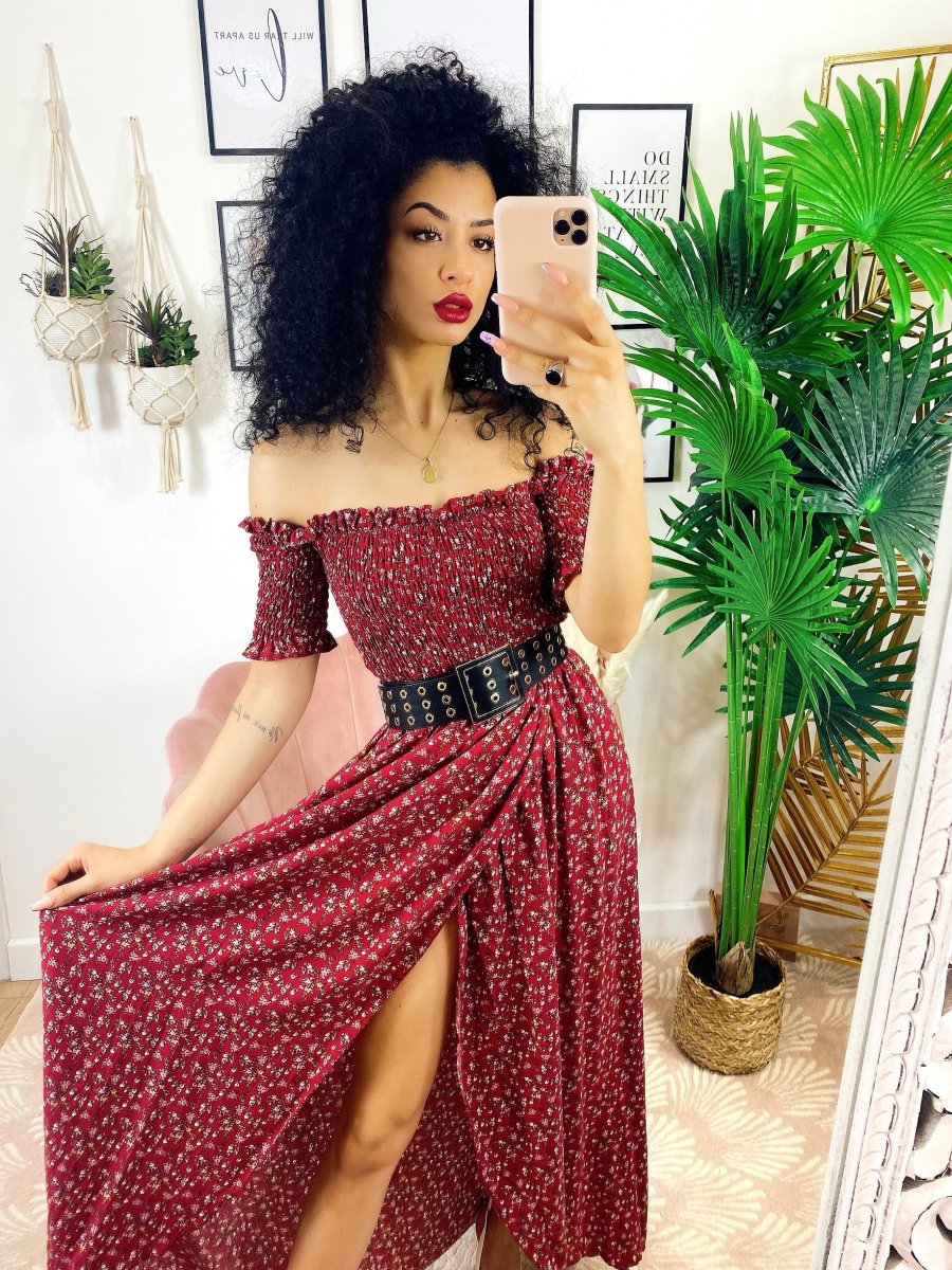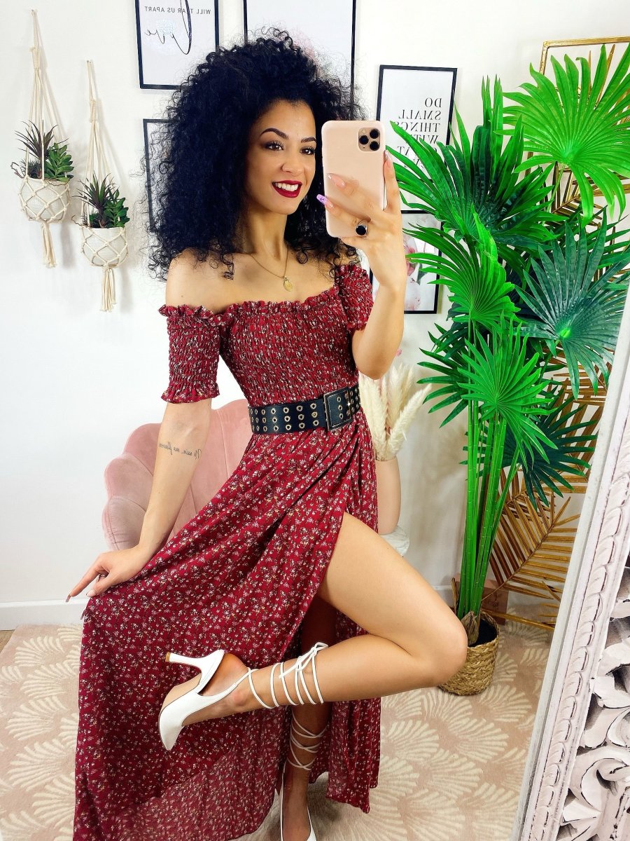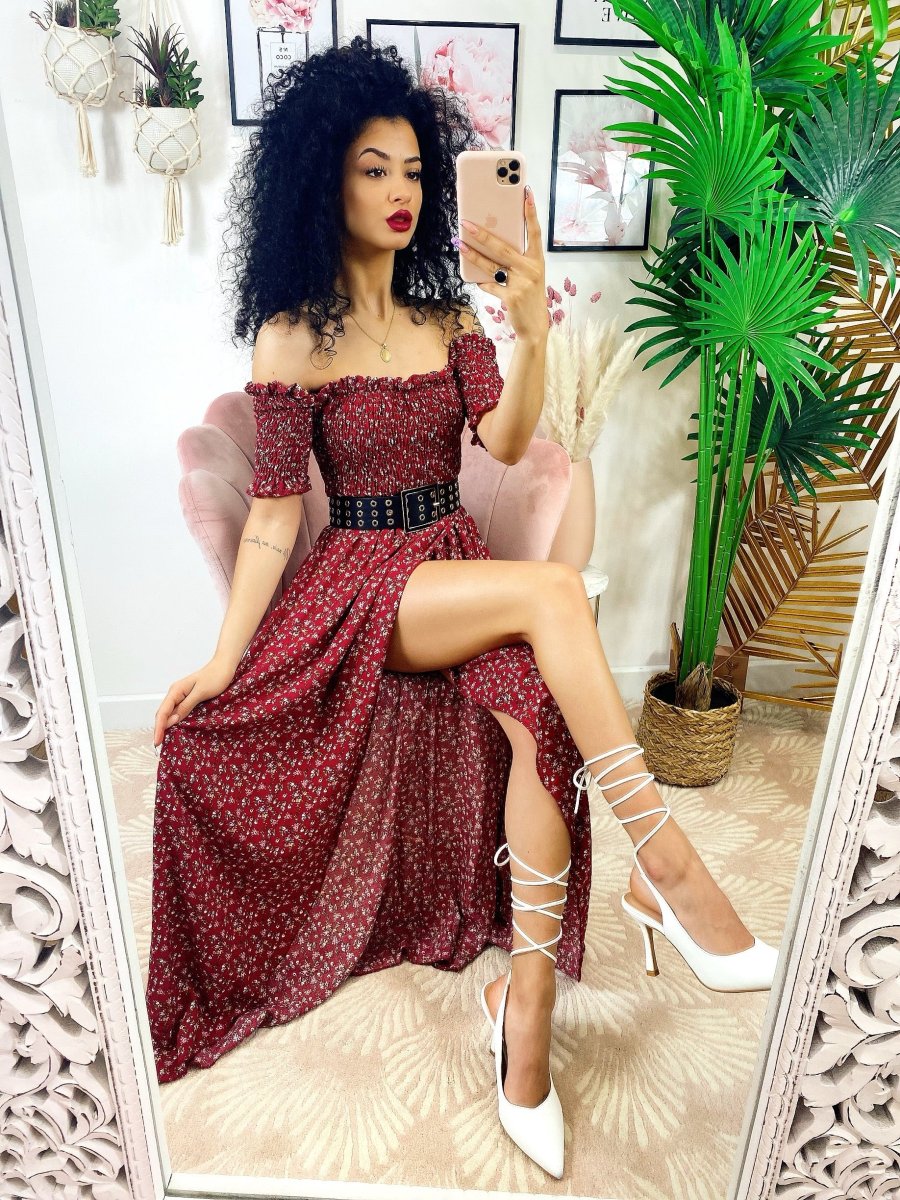 Abito lungo con scollo a barchetta con fiorellini bordeaux