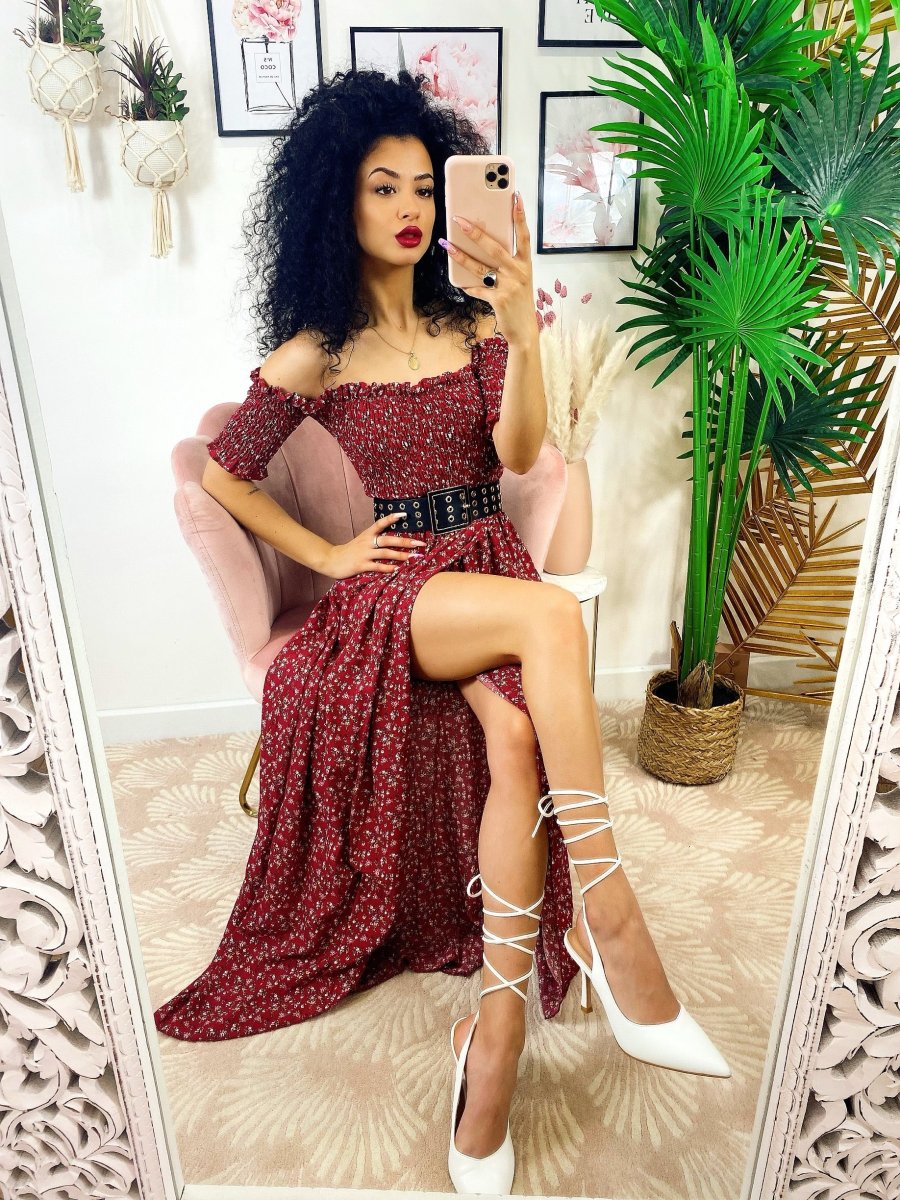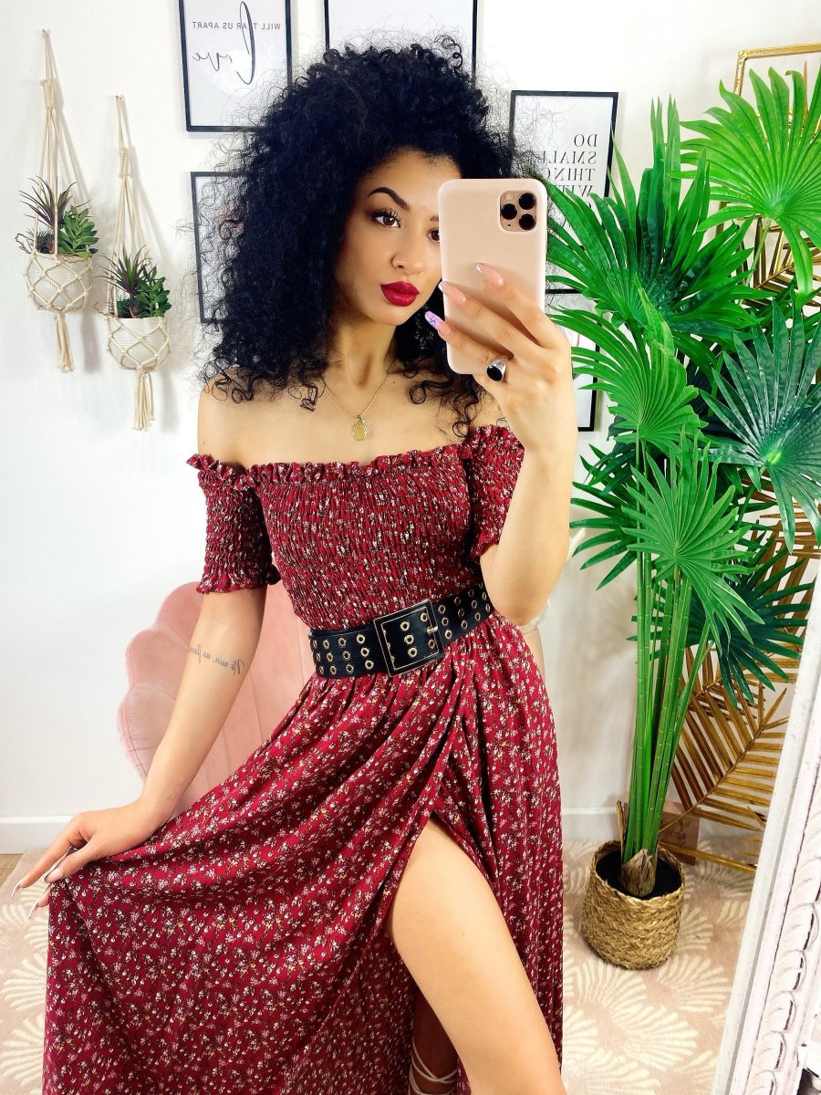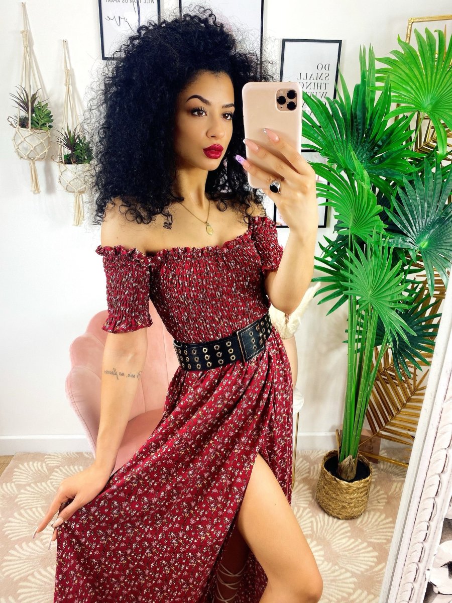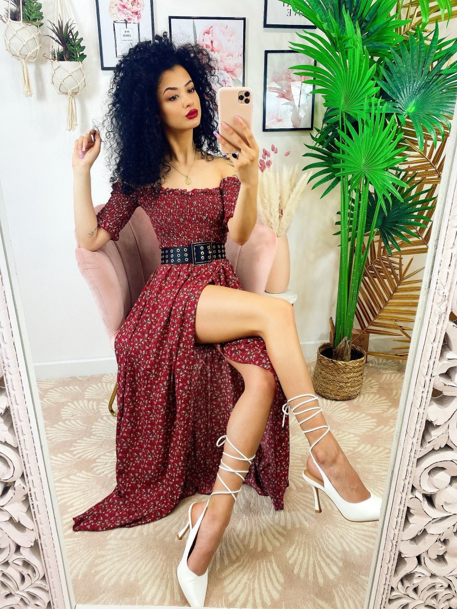 Abito lungo con scollo a barchetta con fiorellini bordeaux