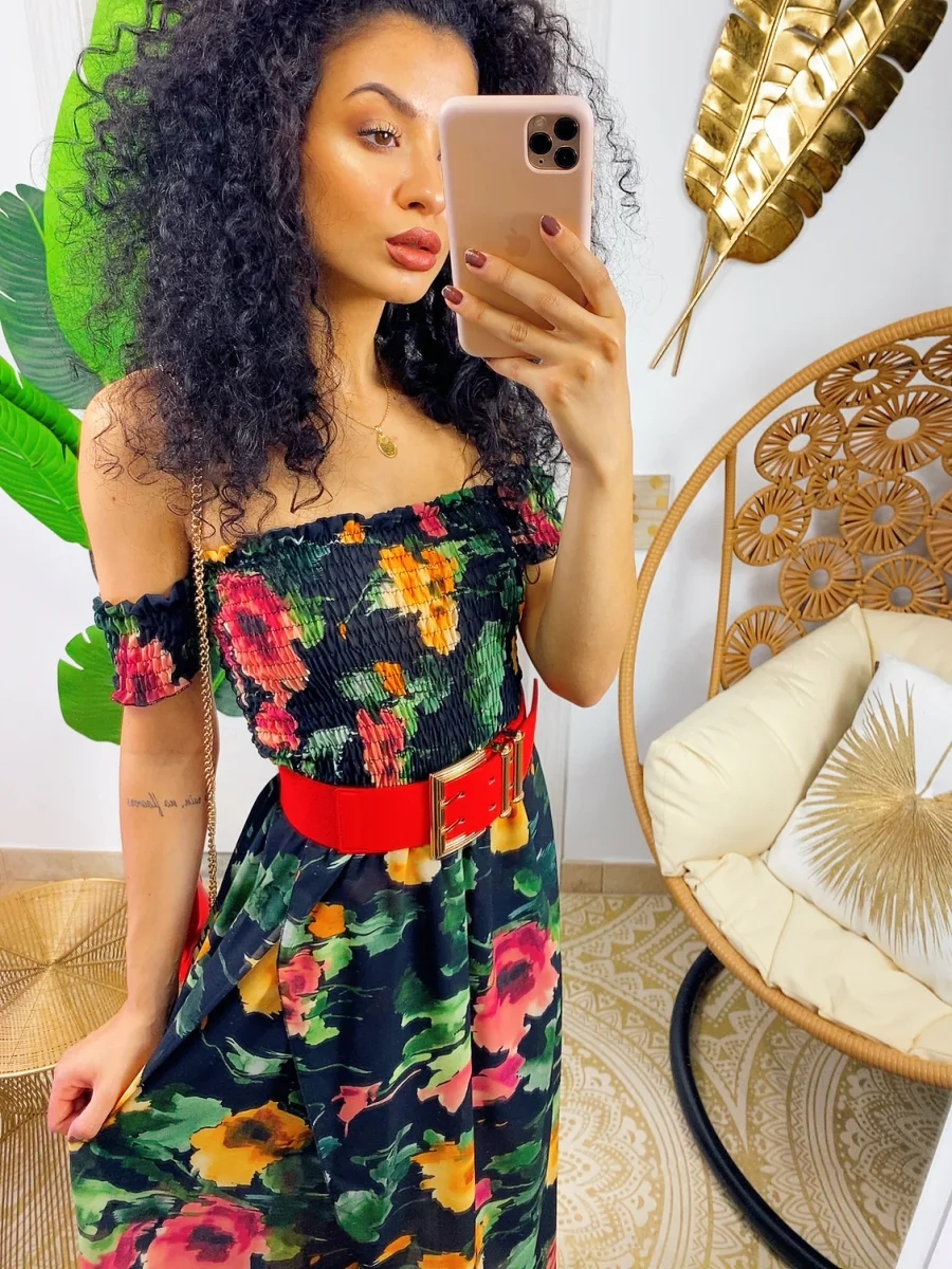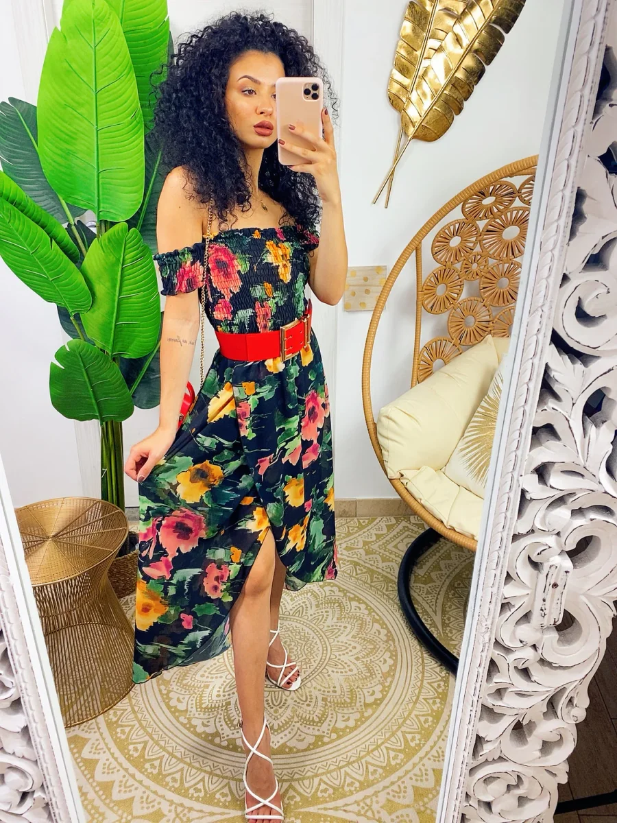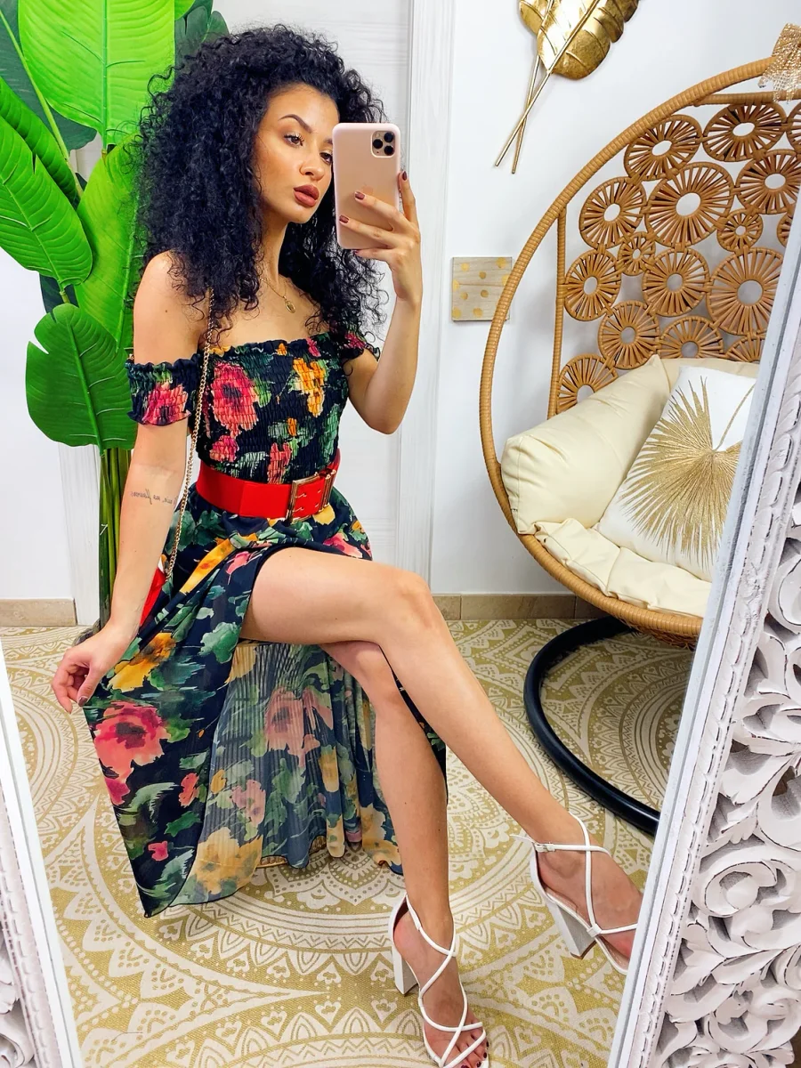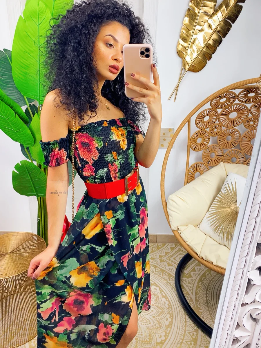 Abito con scollo a barchetta arricciato elasticizzato. Maxi spacco sul davanti. Fresco e comodo sia da giorno che da sera con una cinturina. Fantasia floreale colorata
