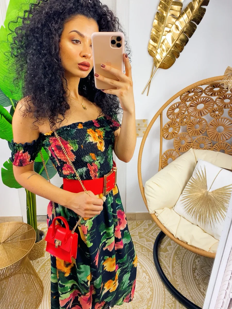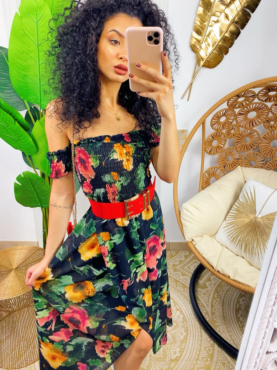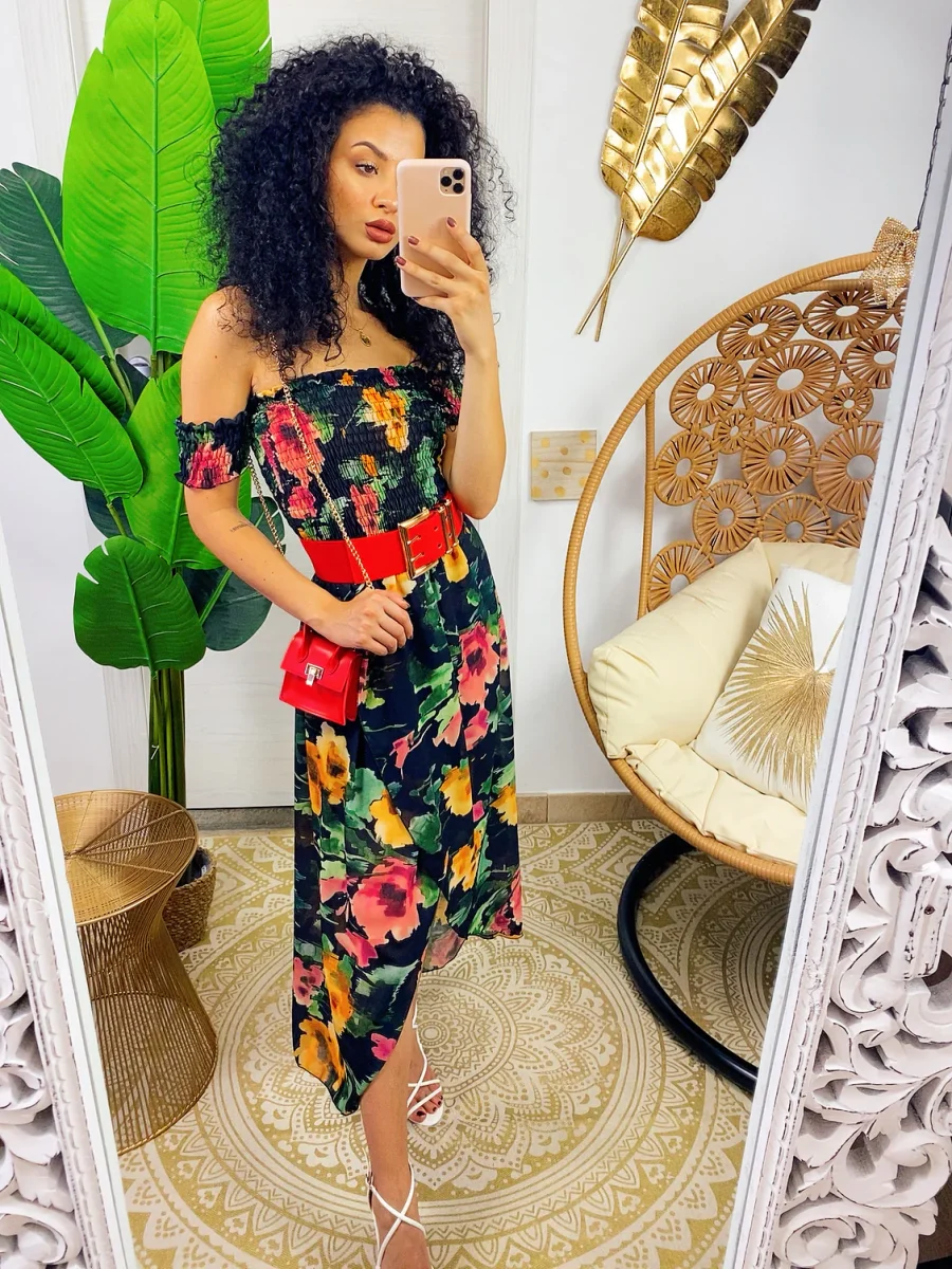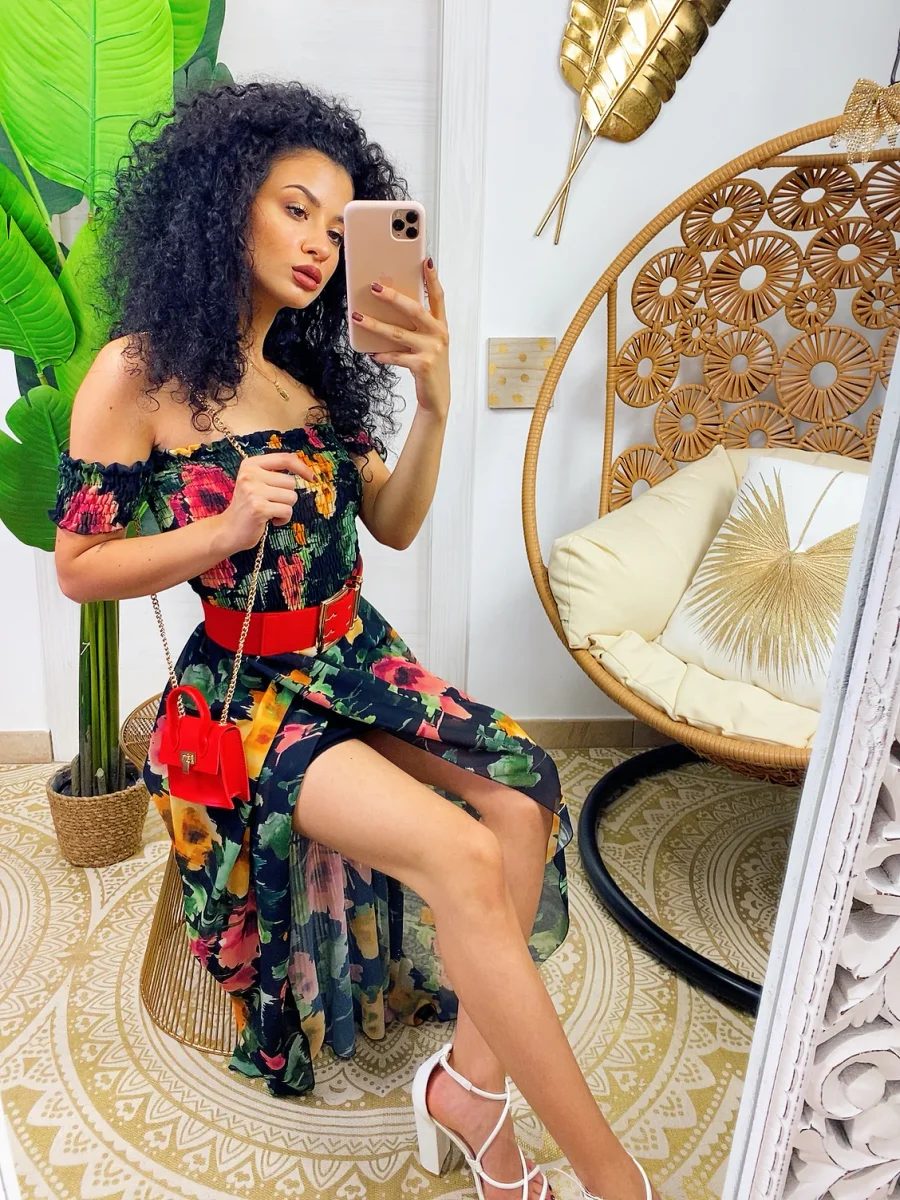 Abito con scollo a barchetta arricciato elasticizzato. Maxi spacco sul davanti. Fresco e comodo sia da giorno che da sera con una cinturina. Fantasia floreale colorata