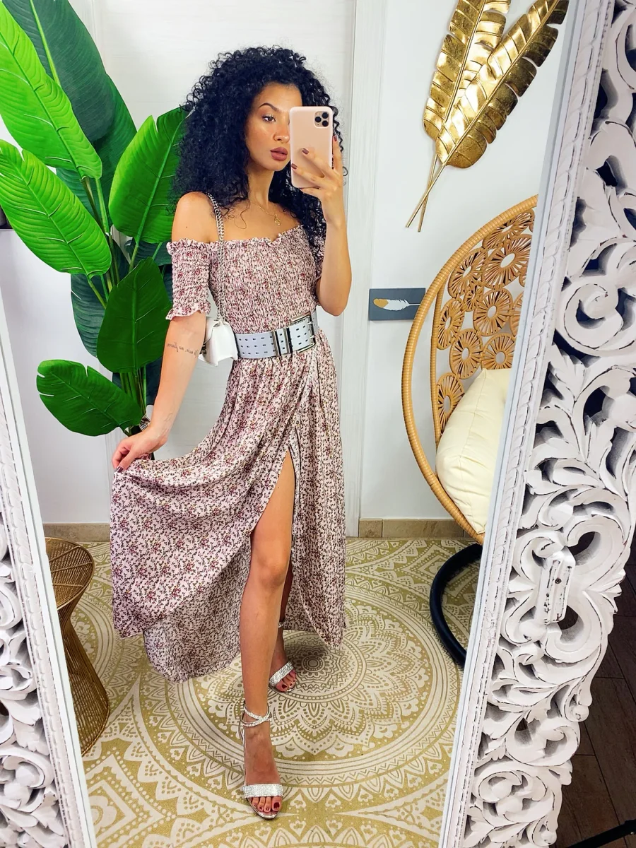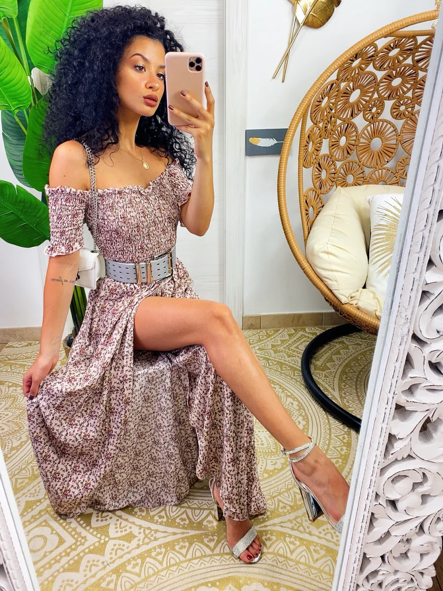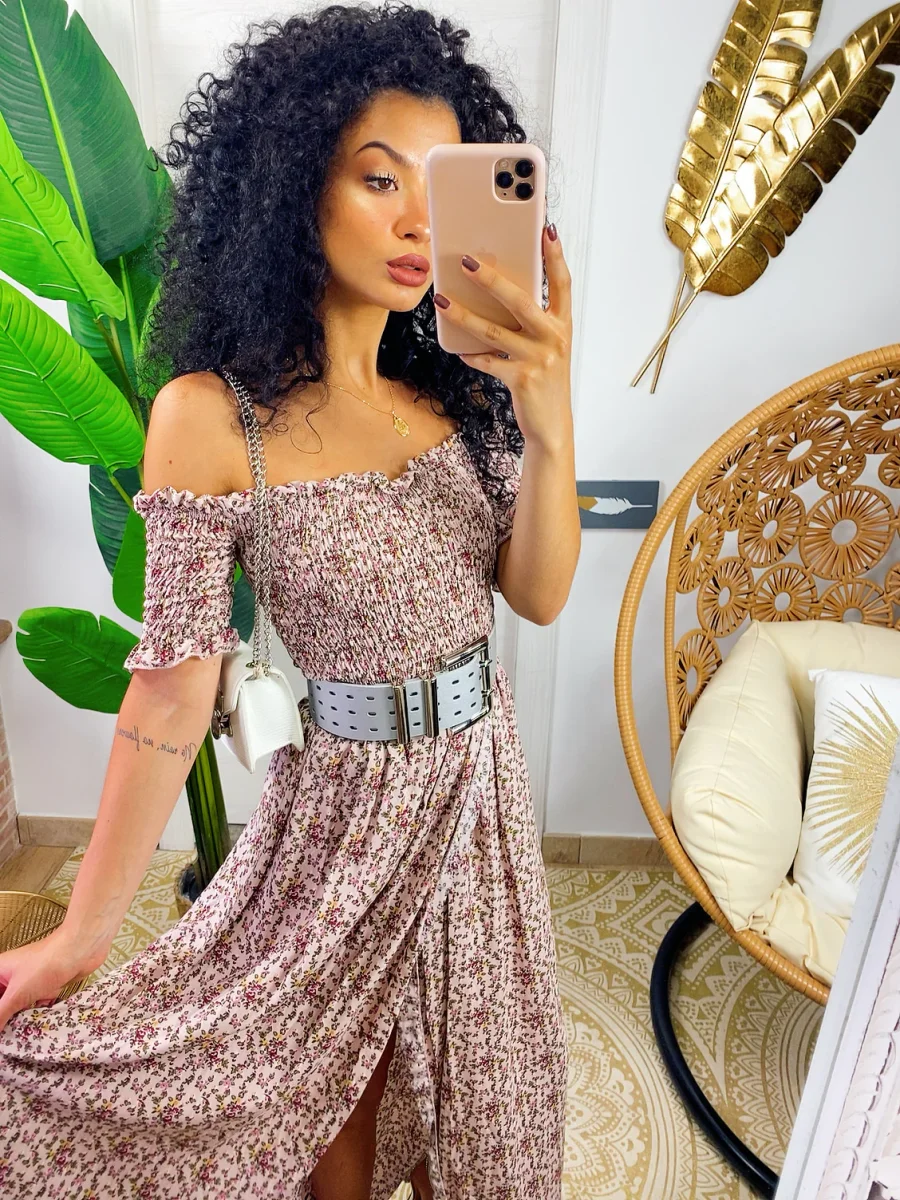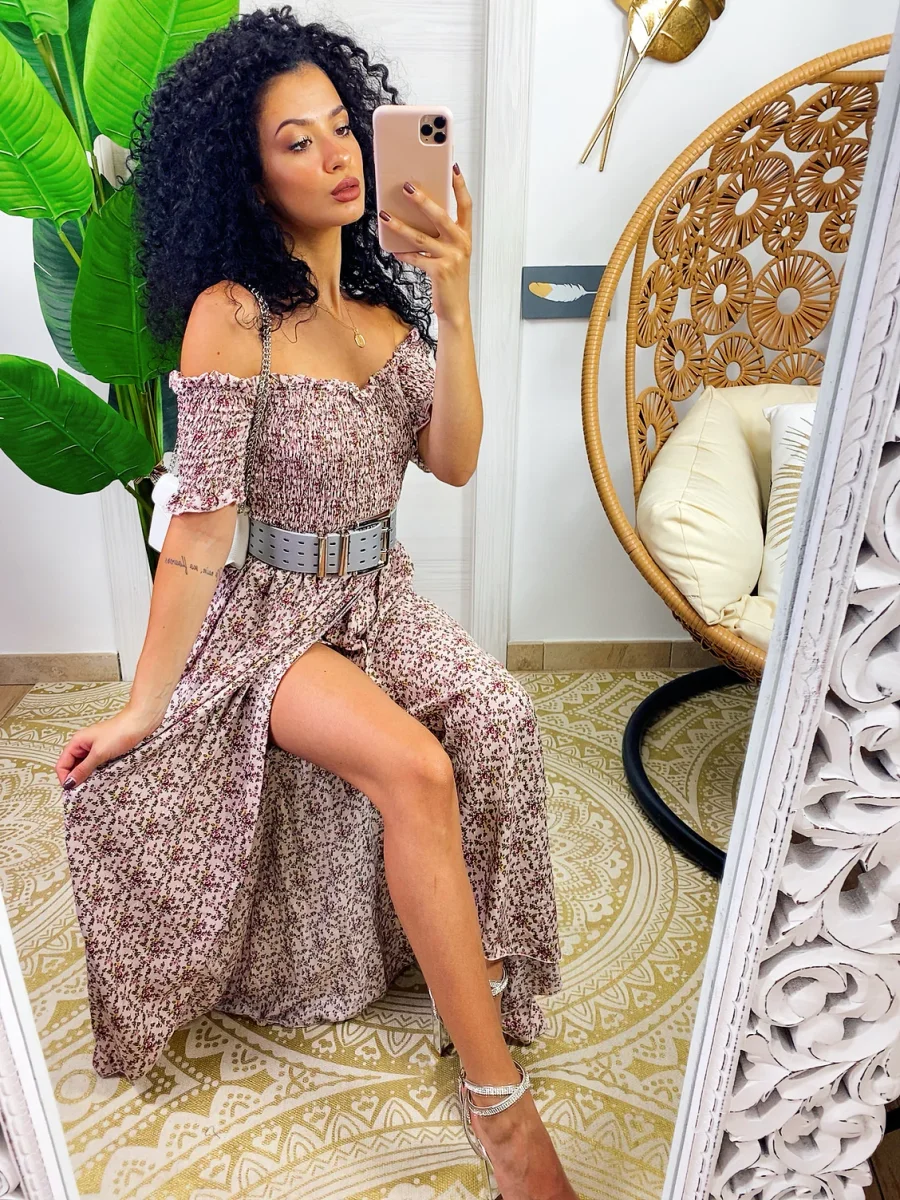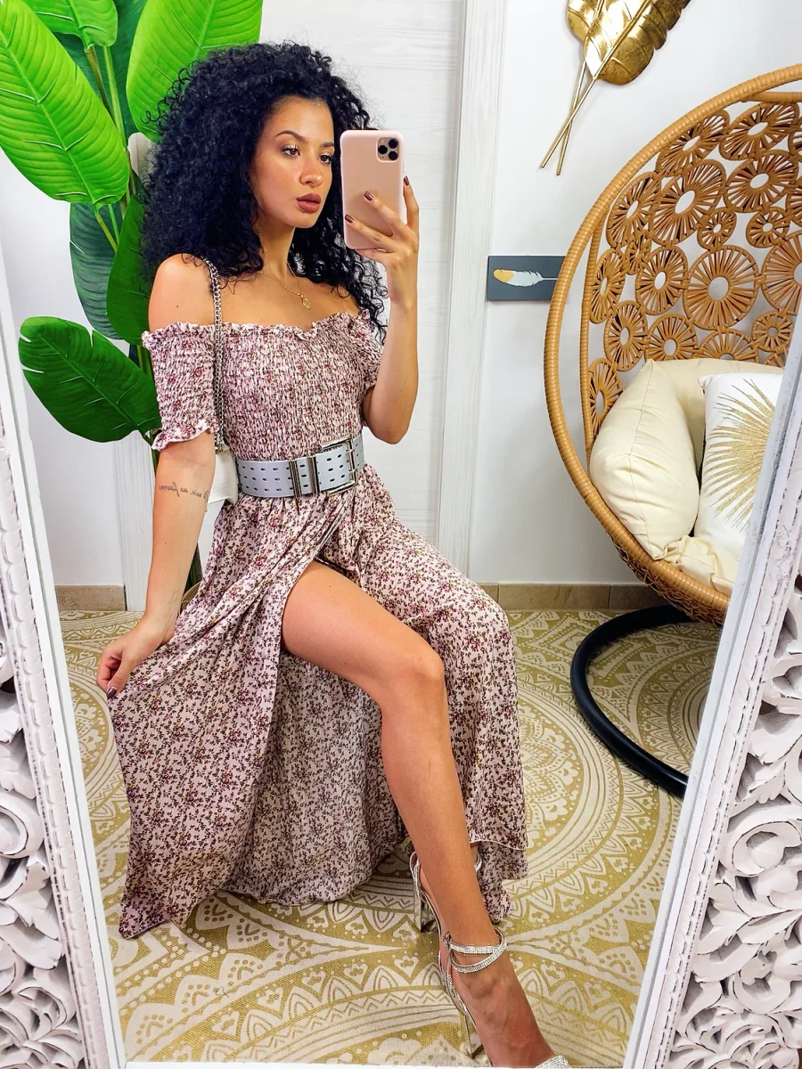 Abito con scollo a barchetta arricciato elasticizzato. Maxi spacco sul davanti. Fresco e comodo sia da giorno che da sera con una cinturina. Fantasia floreale.