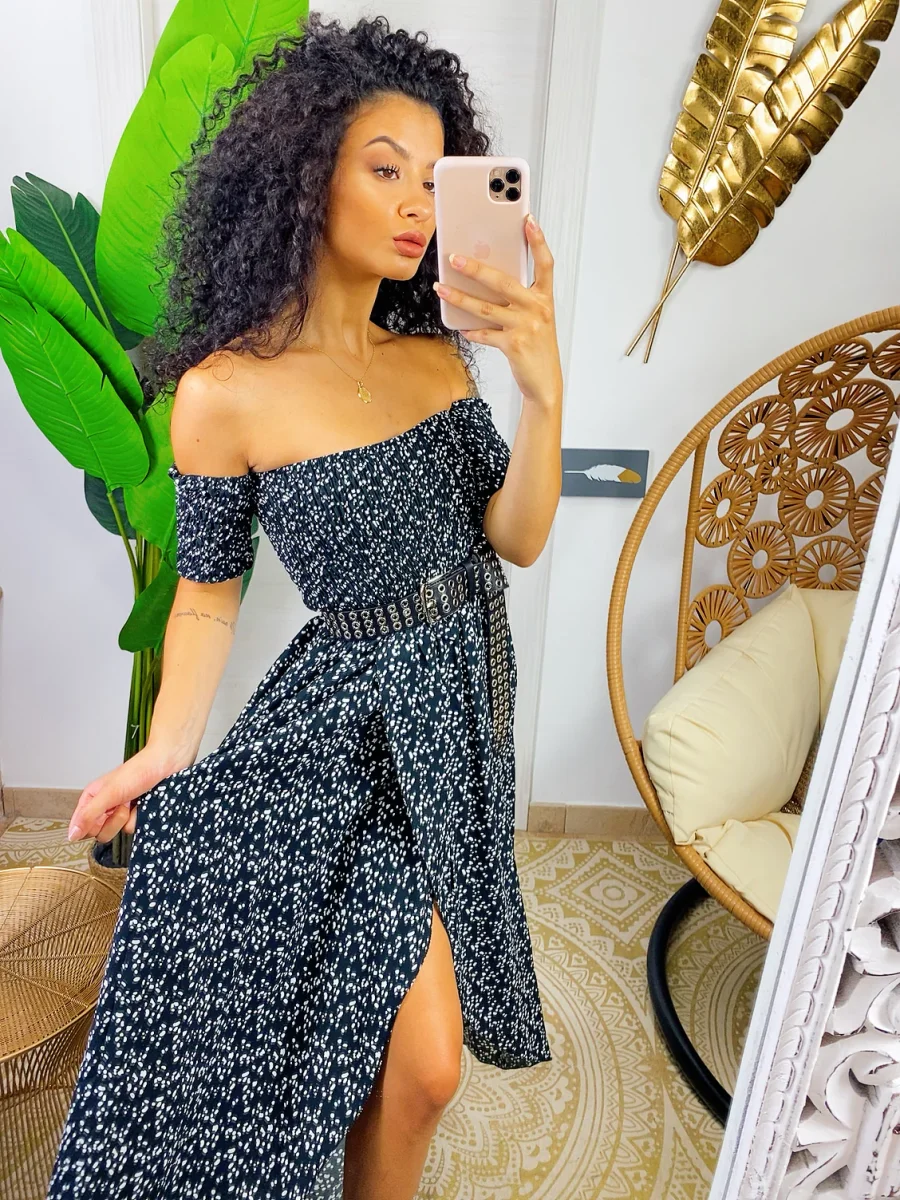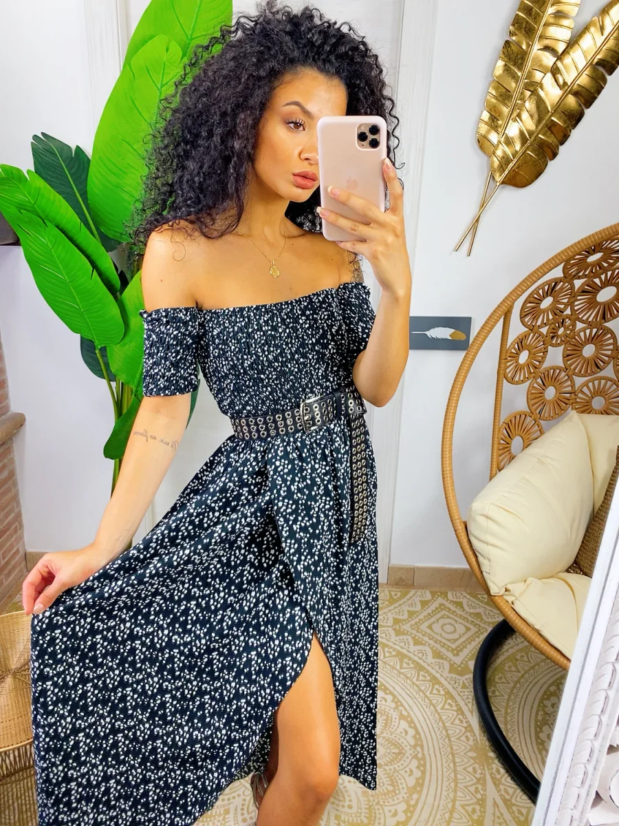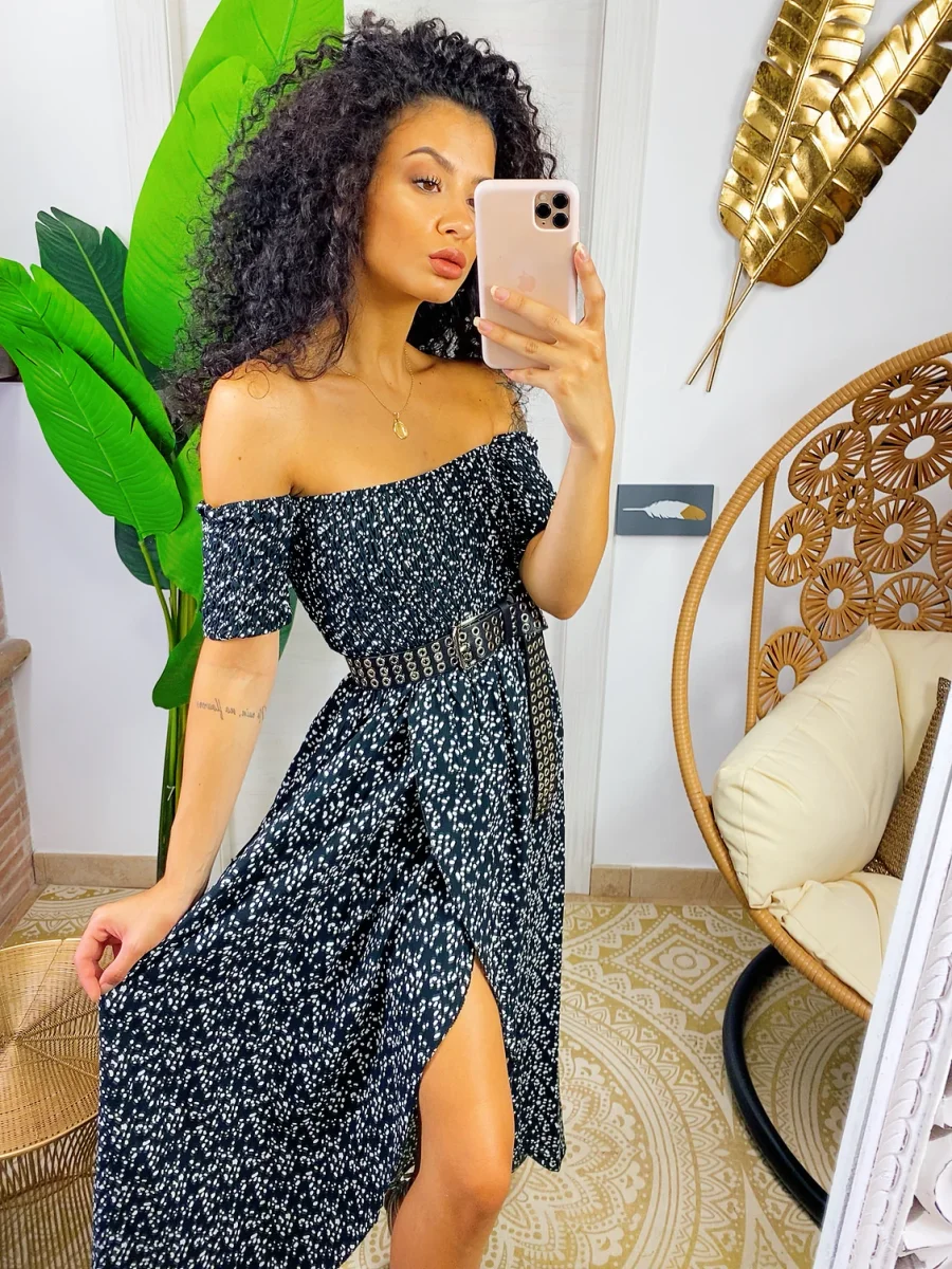 Abito con scollo a barchetta arricciato elasticizzato. Maxi spacco sul davanti. Fresco e comodo sia da giorno che da sera con una cinturina.