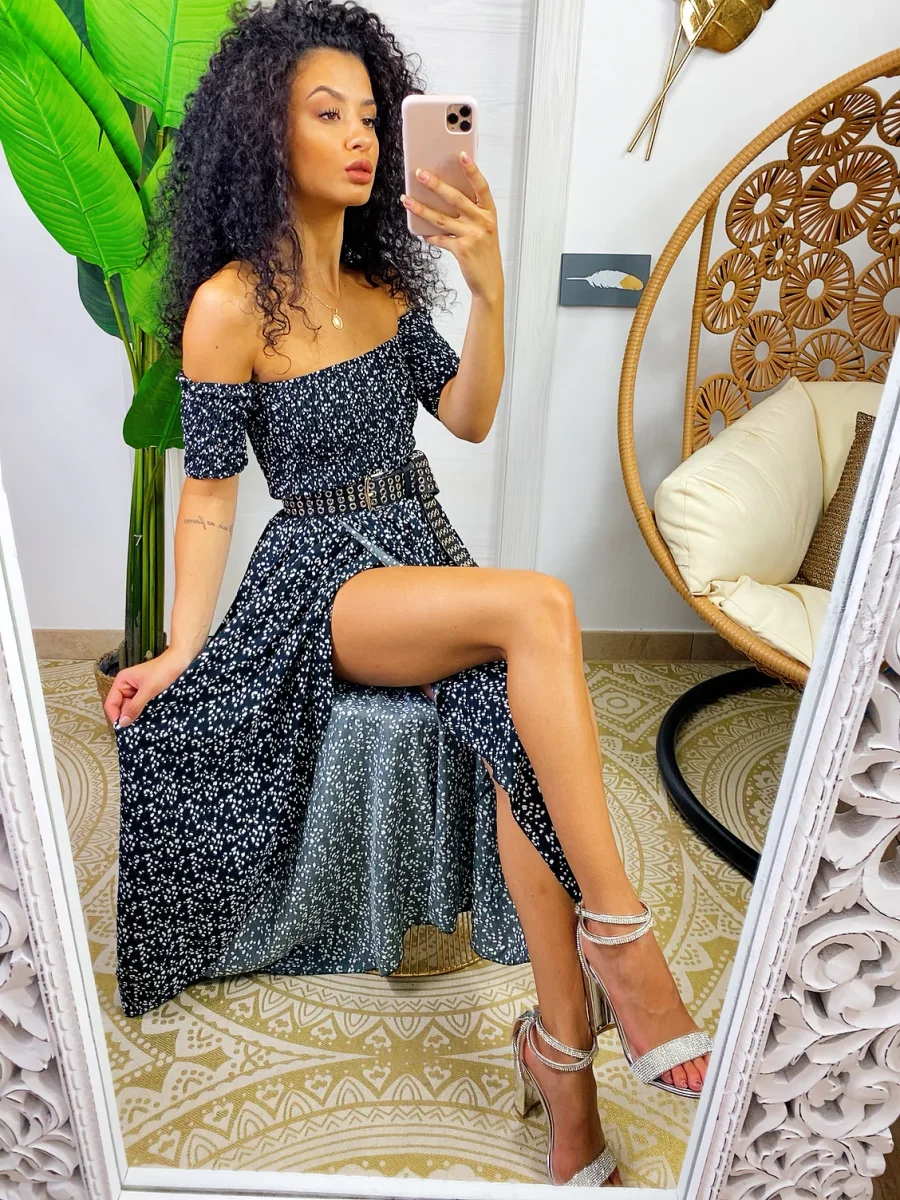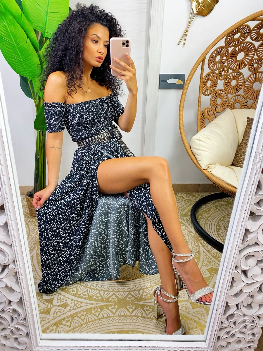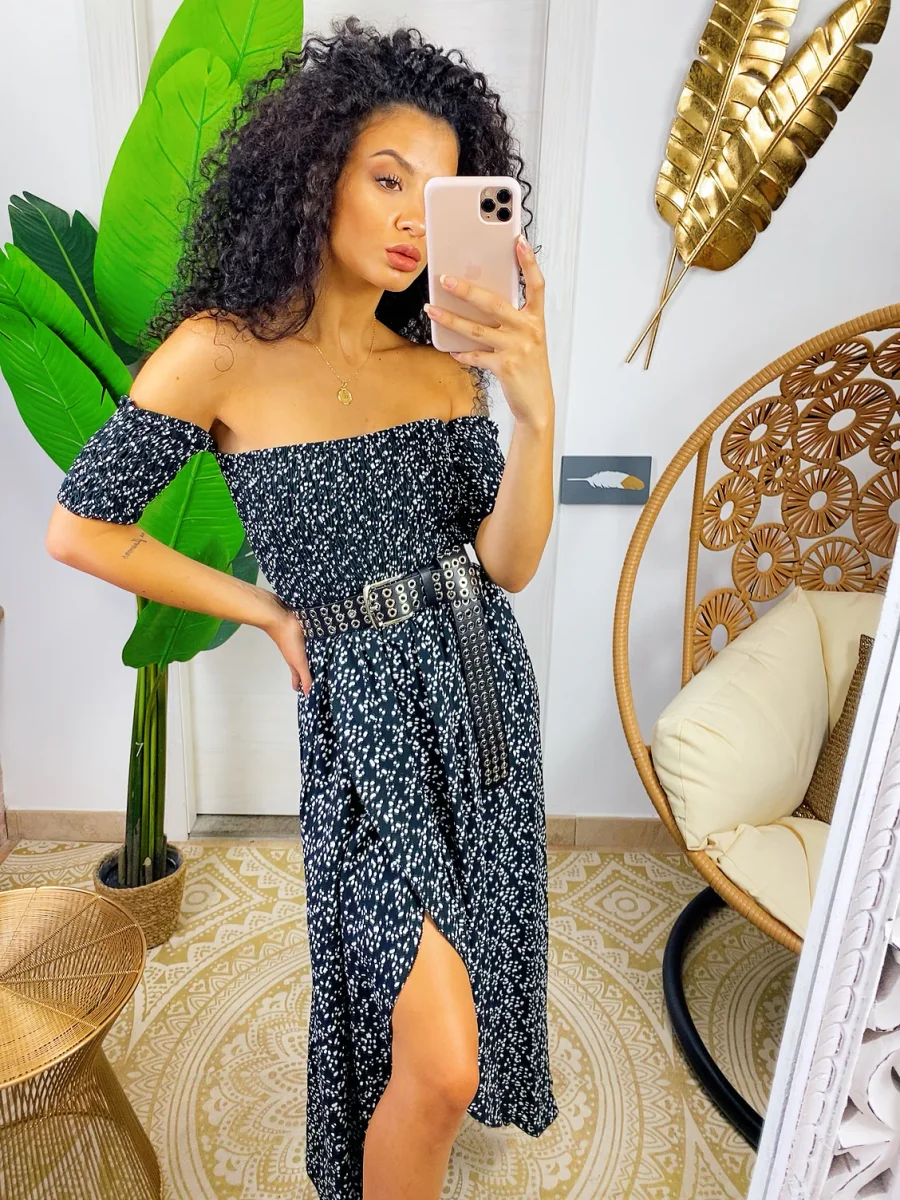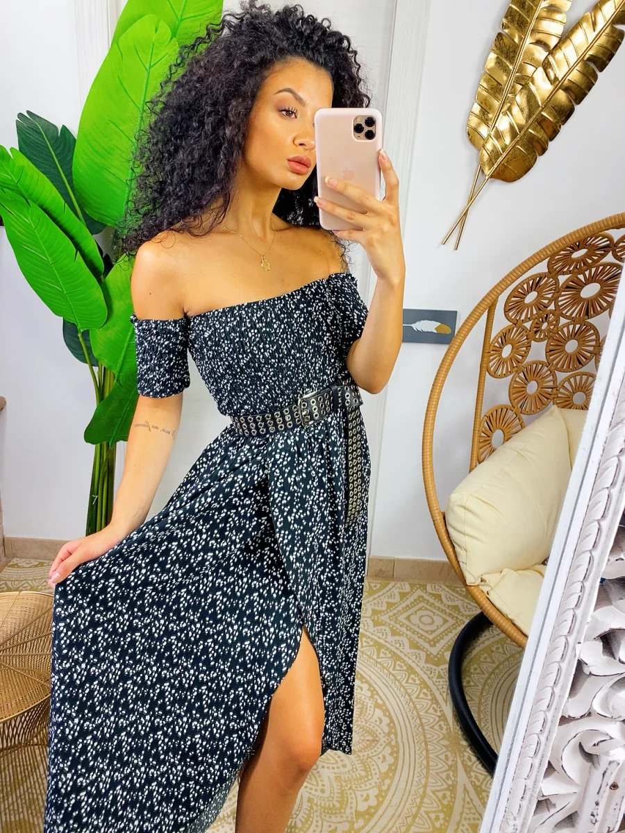 Abito con scollo a barchetta arricciato elasticizzato. Maxi spacco sul davanti. Fresco e comodo sia da giorno che da sera con una cinturina.