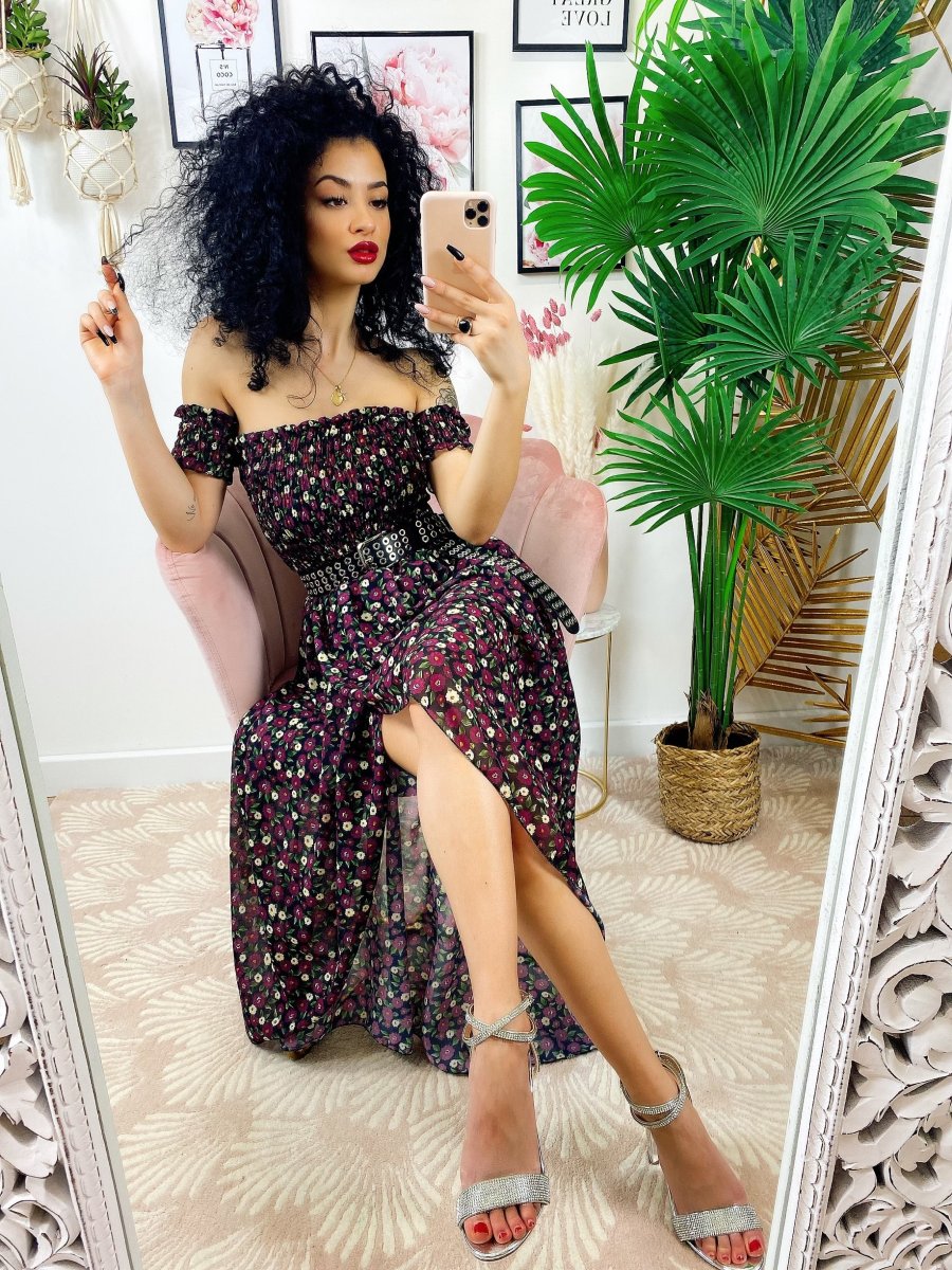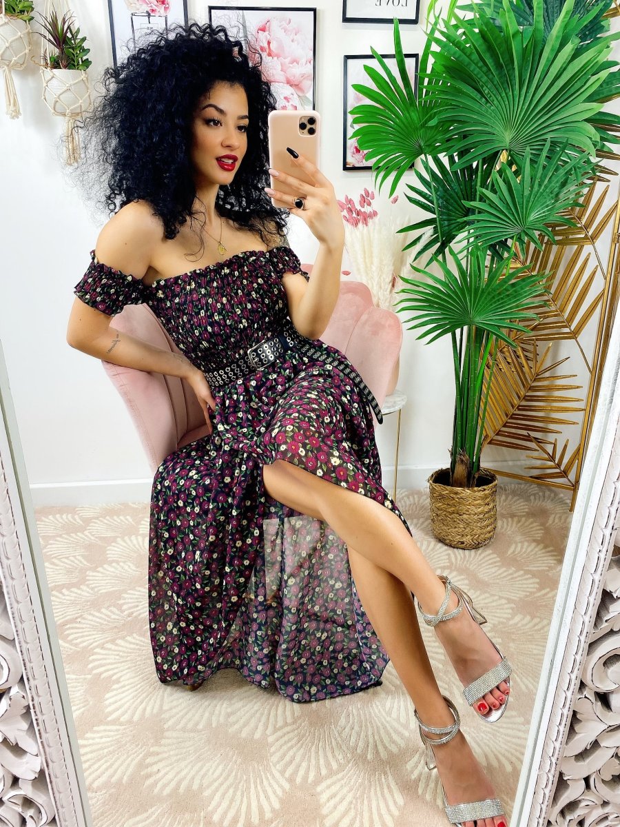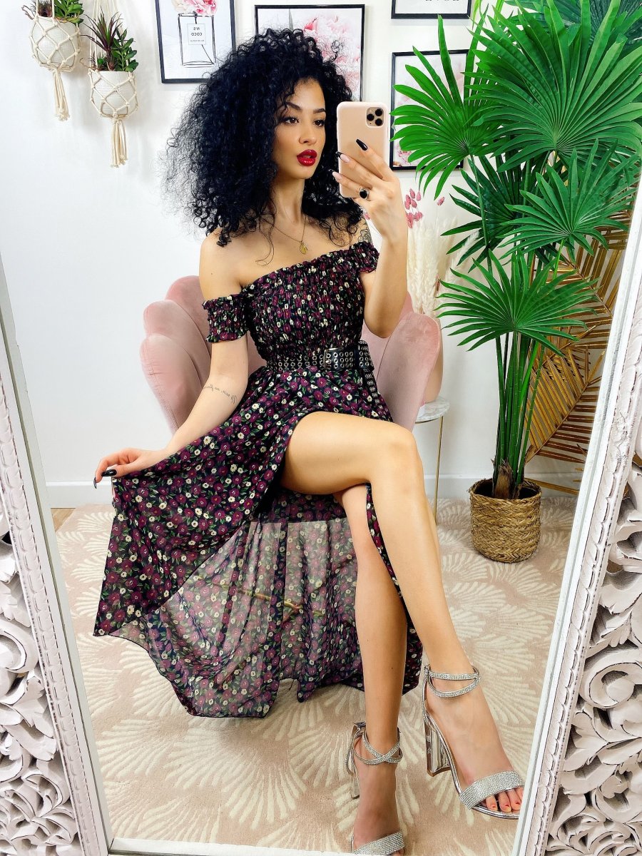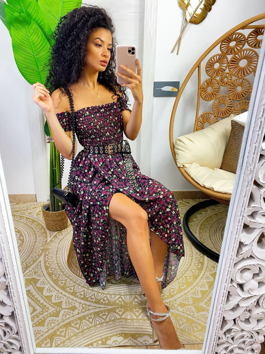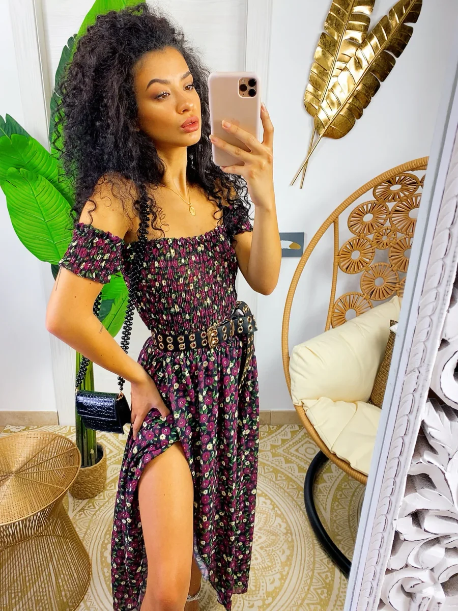 Recensisci per primo “Abito lungo con scollo a barchetta Nero fiori Fuxia”