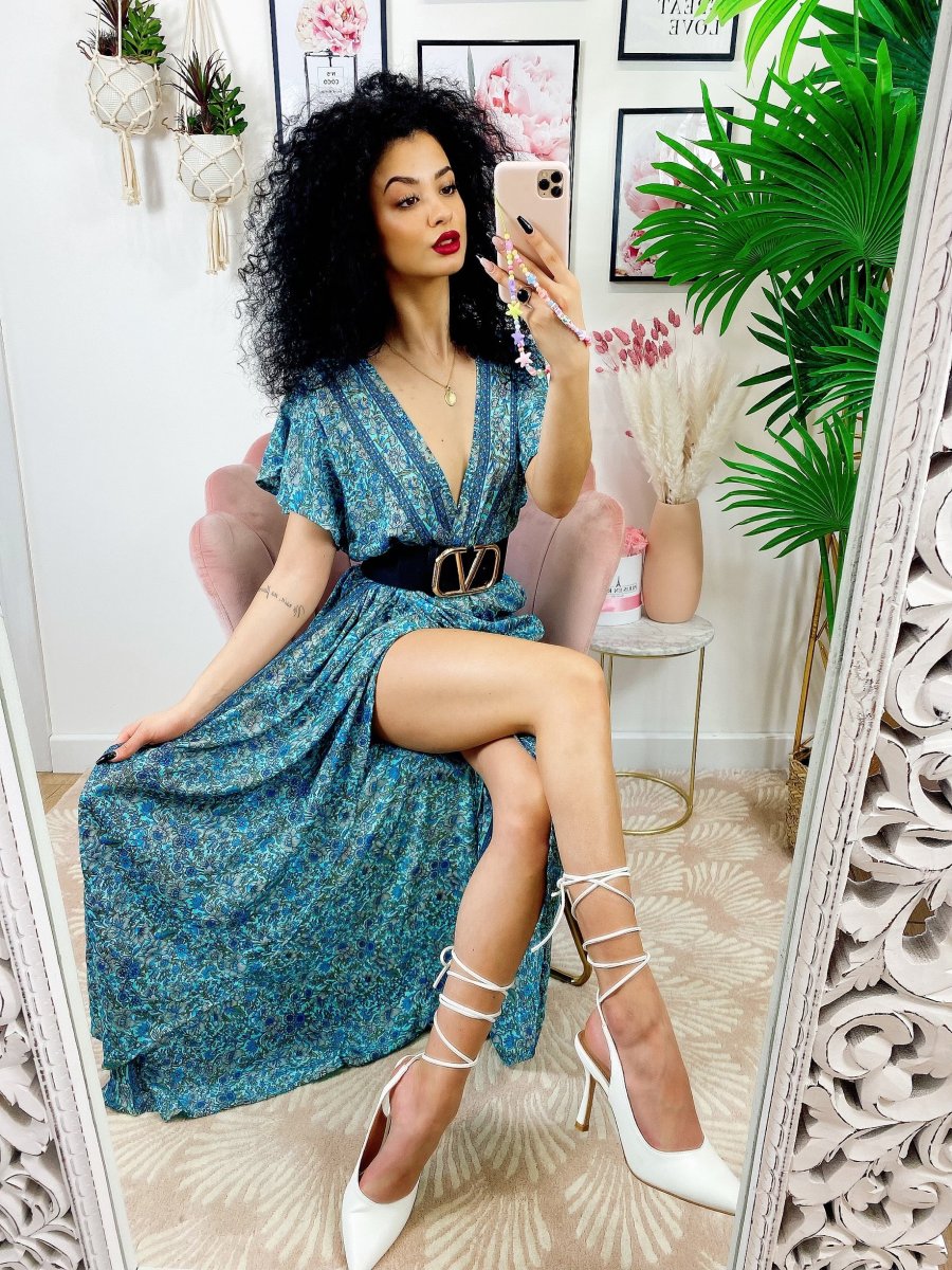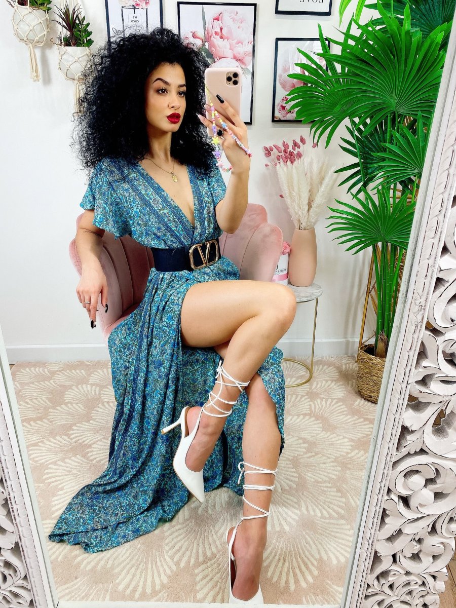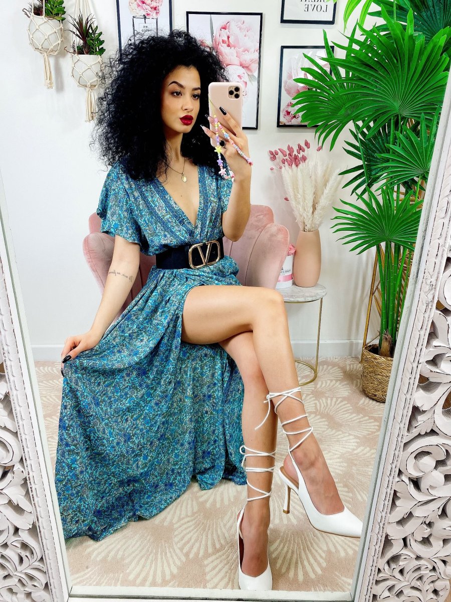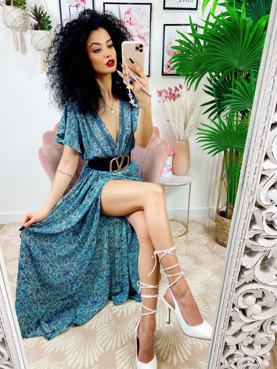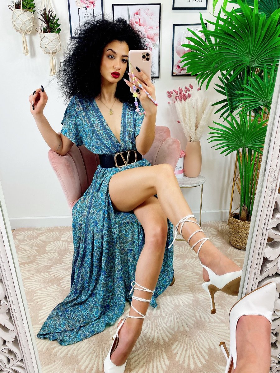 Abito con scollo a V e manica larga con rouches. Maxi spacco sul davanti. Fresco e comodo sia da giorno che da sera con una cinturina. Elastico in vita