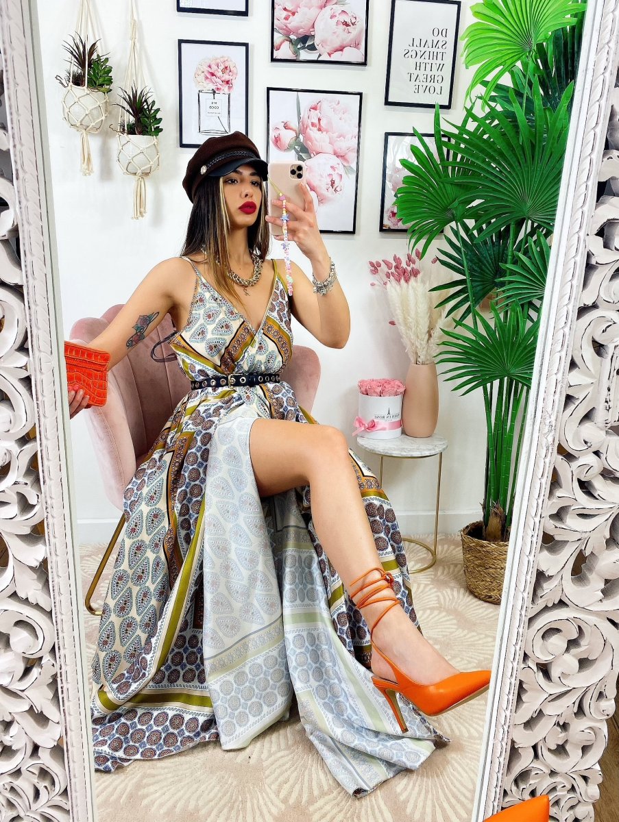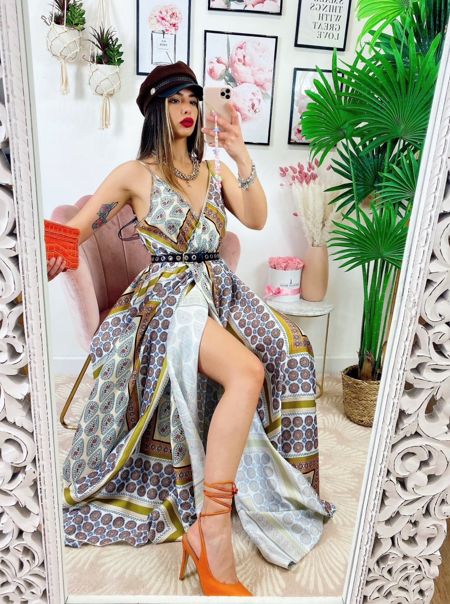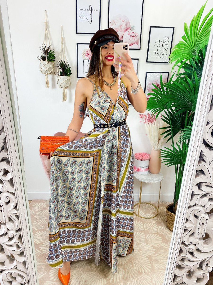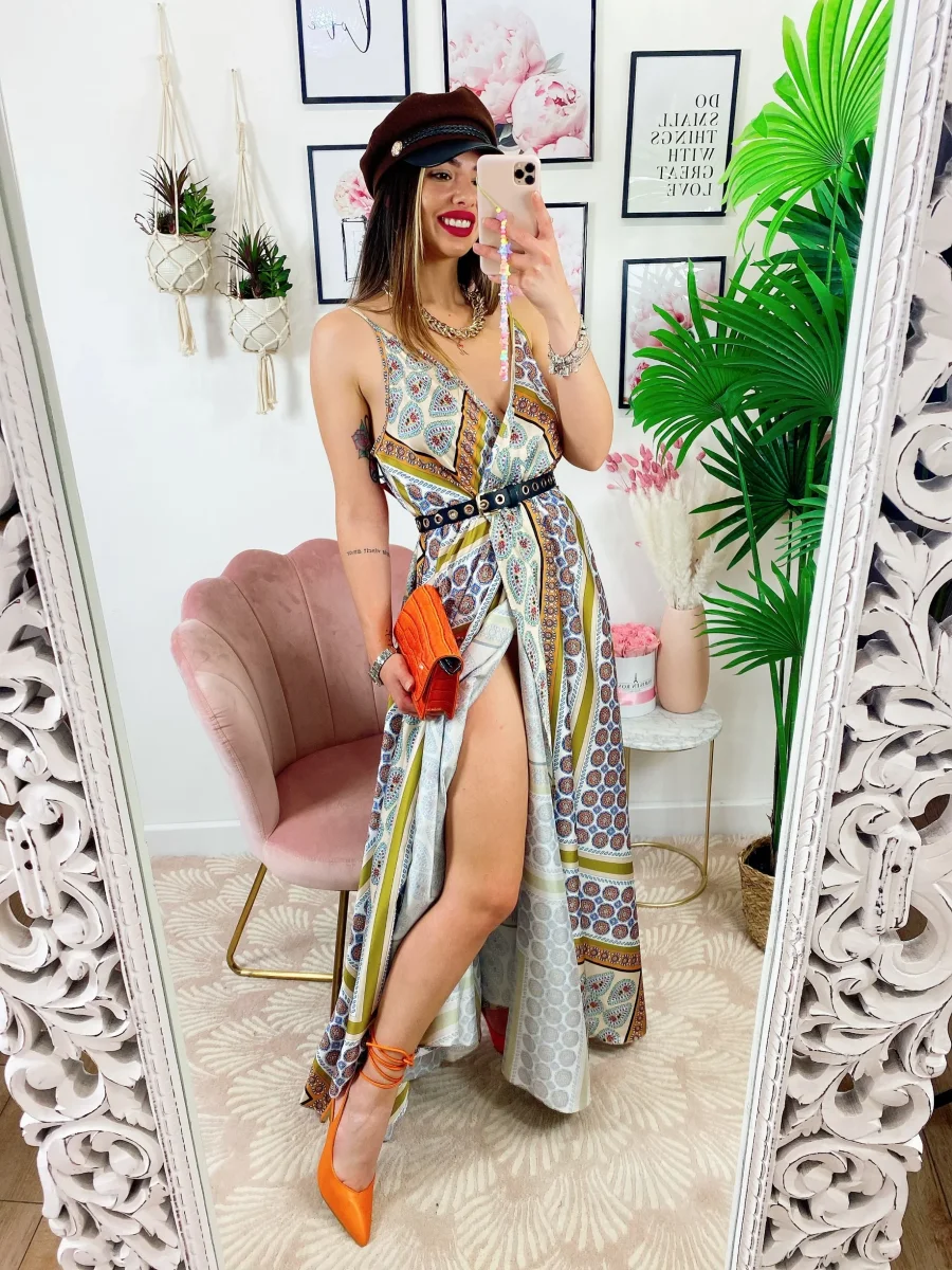 Abito con scollo a V e bretelle e . Maxi spacco sul davanti. Fresco e comodo sia da giorno che da sera con una cinturina. Elastico in vita