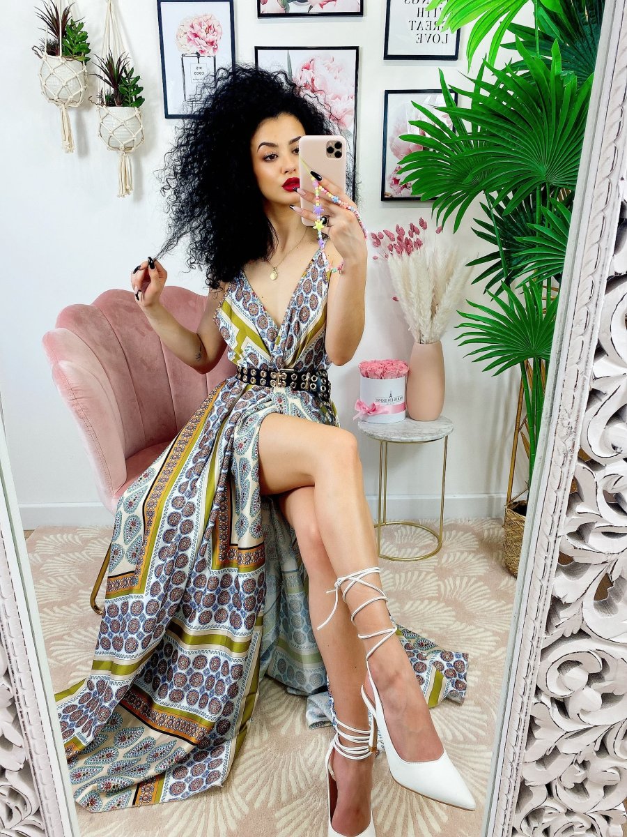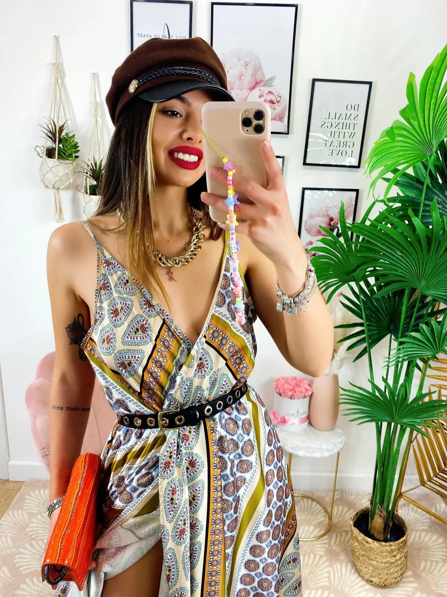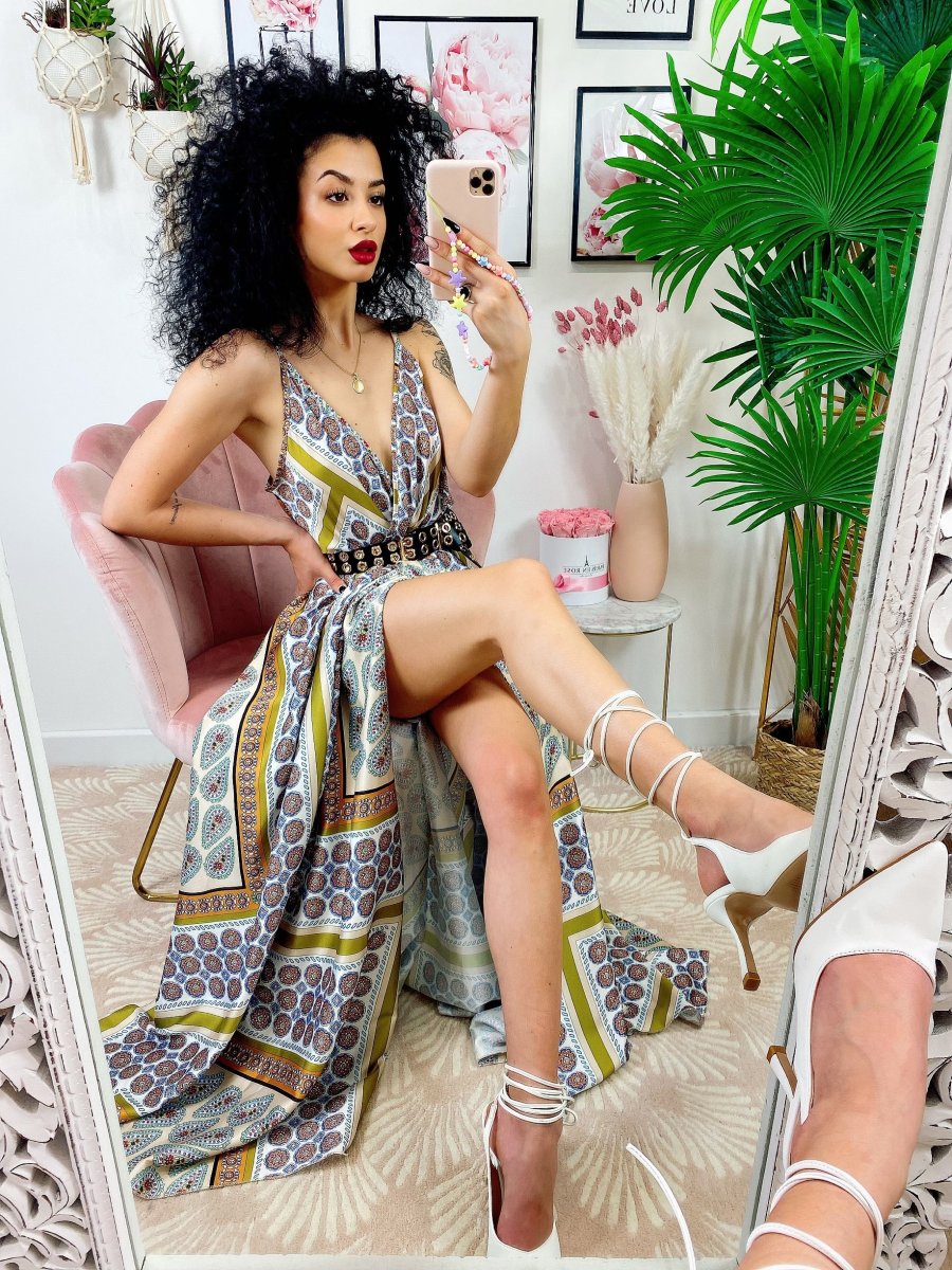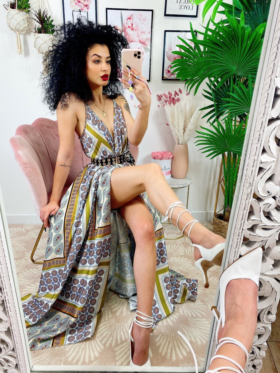 Abito con scollo a V e bretelle e . Maxi spacco sul davanti. Fresco e comodo sia da giorno che da sera con una cinturina. Elastico in vita