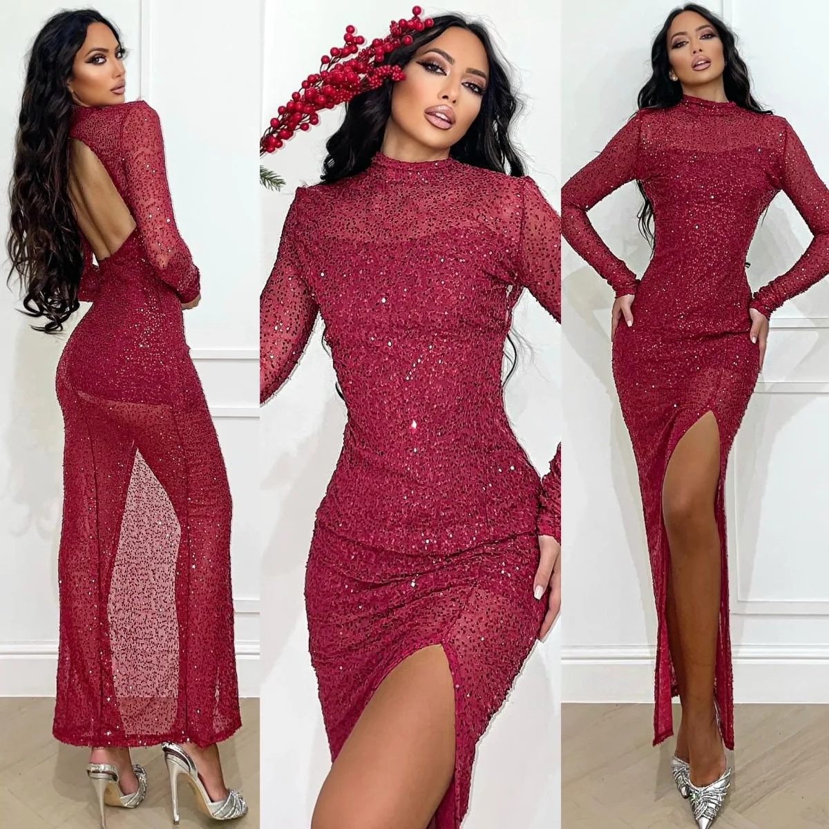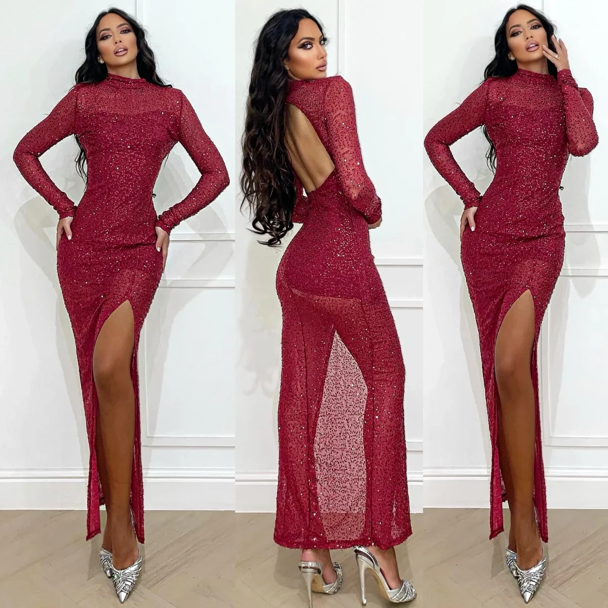 Abito lungo in paillettes super luminoso con fodera interna e schiena aperta, senza coppe