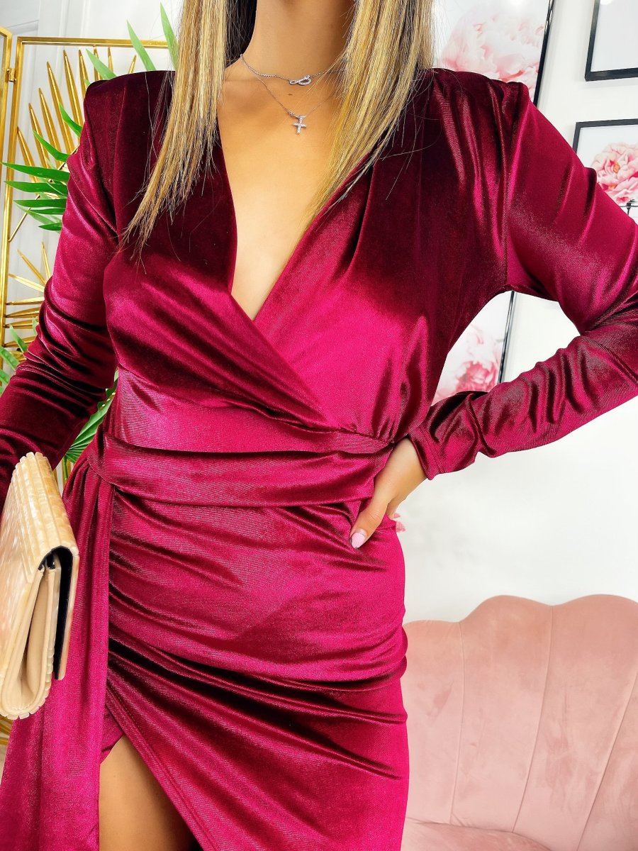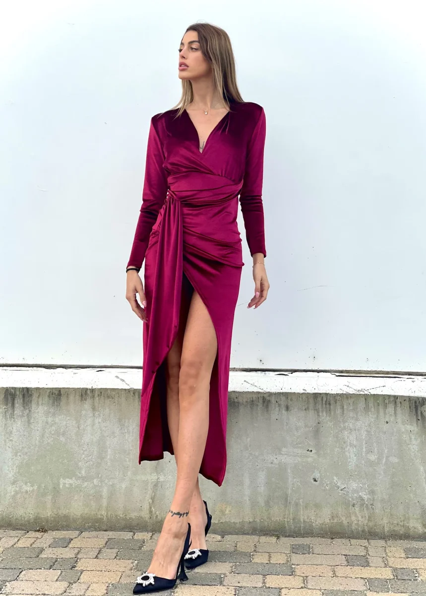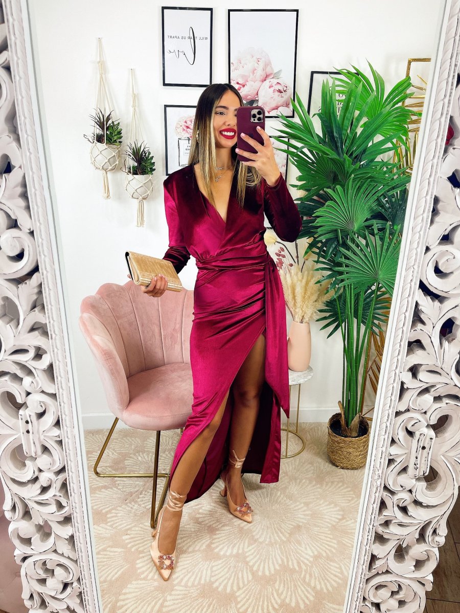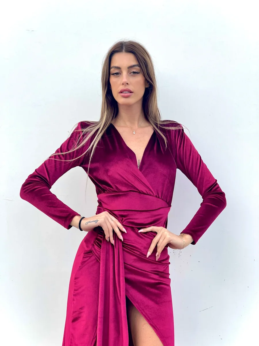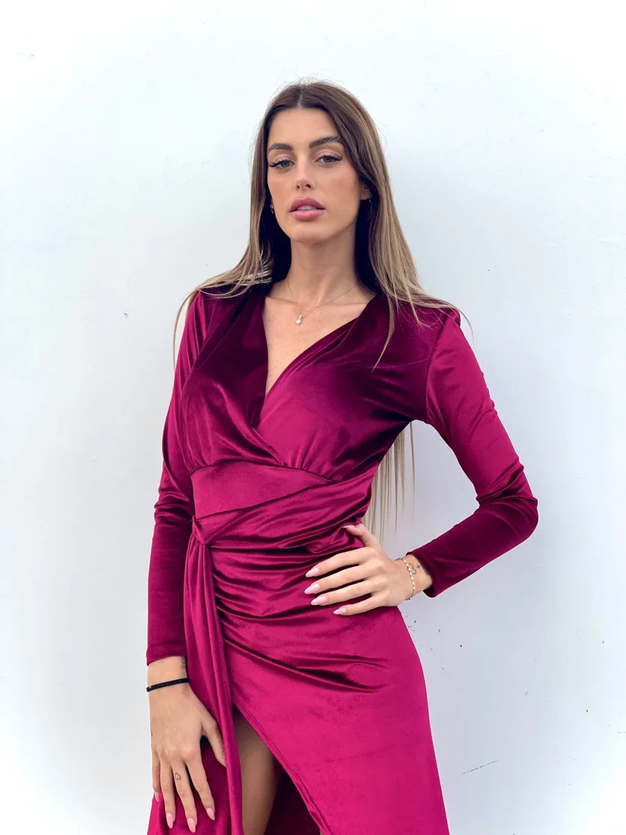 Abito lungo in velluto con maxi spacco e scollo a V perfetto per un evento.