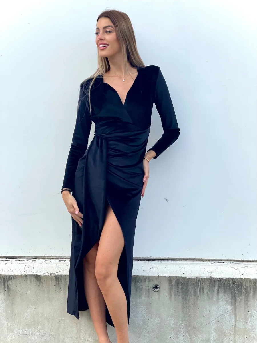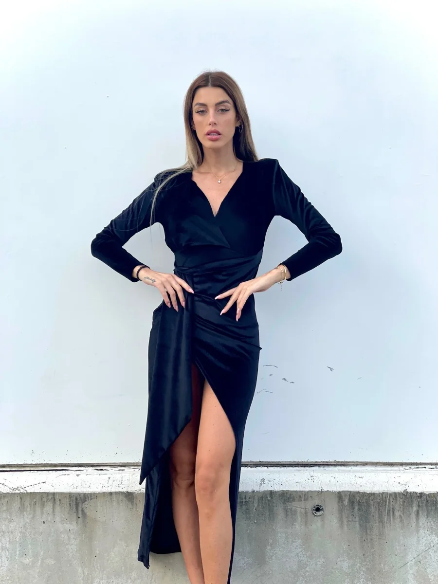 Abito lungo in velluto con maxi spacco e scollo a V perfetto per un evento.