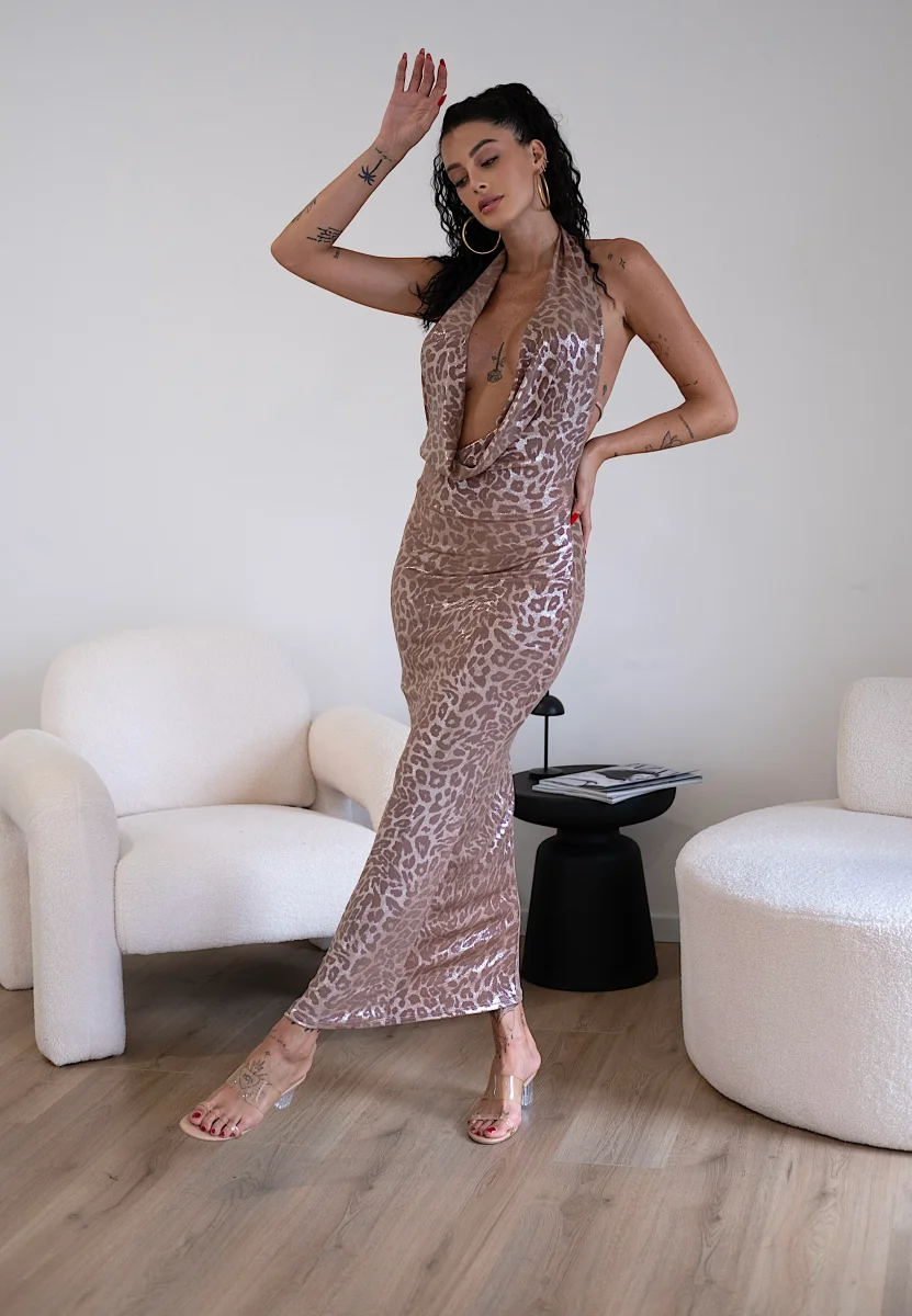 Abito lungo in tessuto aderente e elasticizzato a fantasia animalier rosa. Scollo morbido sul davanti senza coppe e schiena nuda con laccetto.