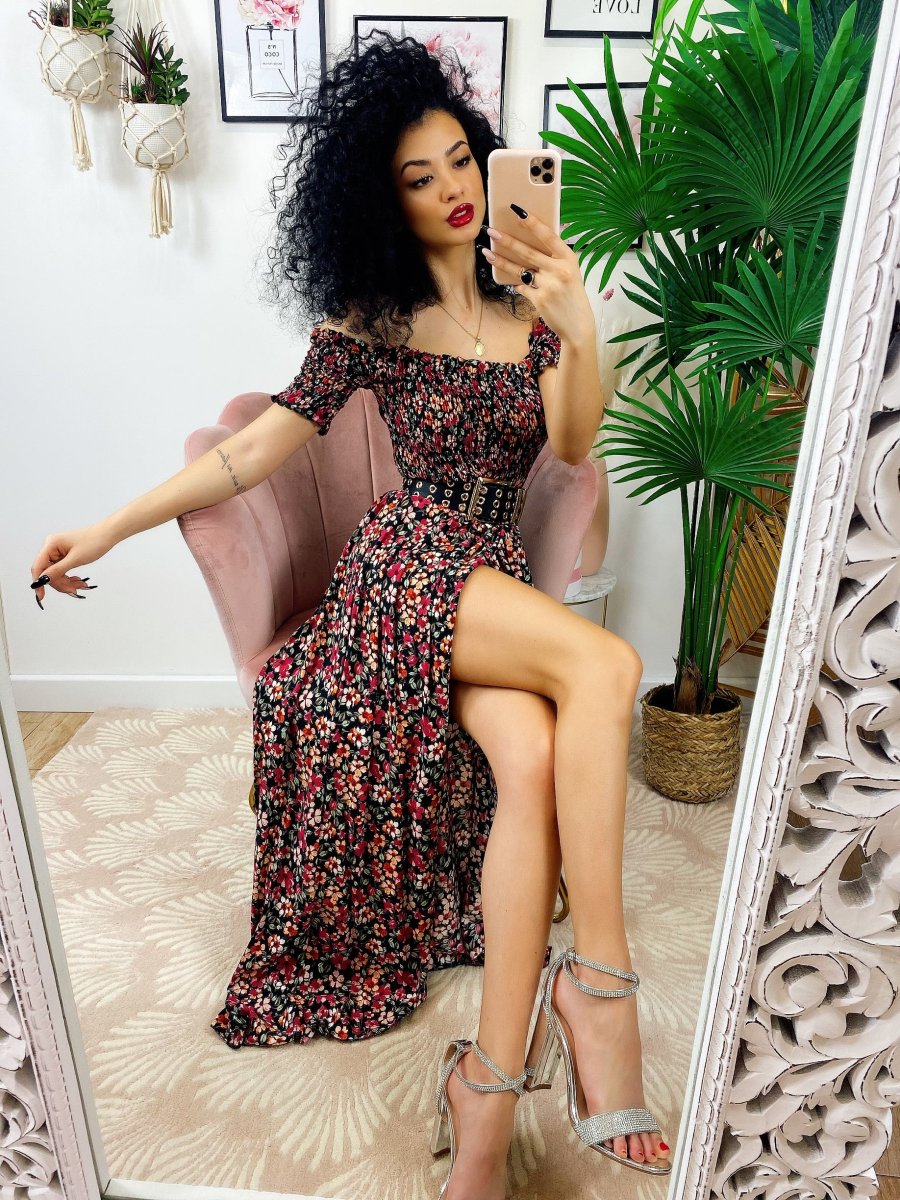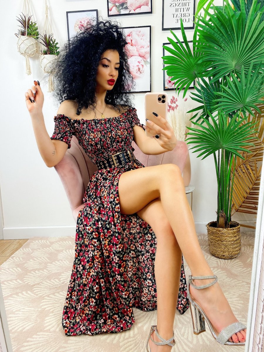 Recensisci per primo “Abito lungo nero con scollo a barchetta con fiori rossi”