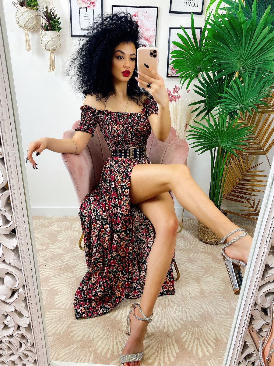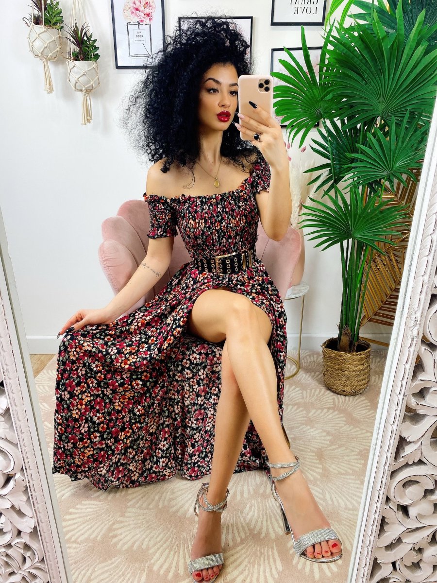Abito lungo nero con scollo a barchetta con fiori rossi