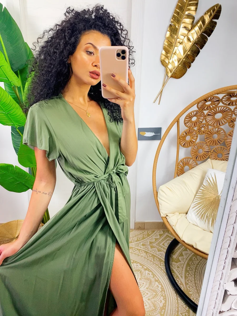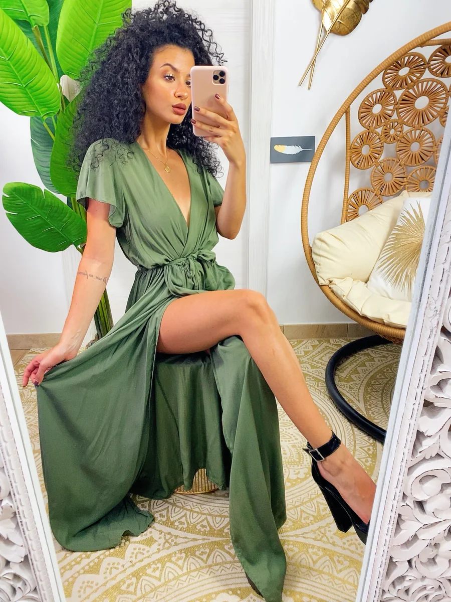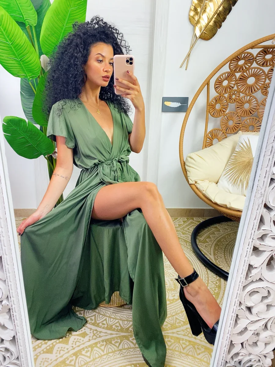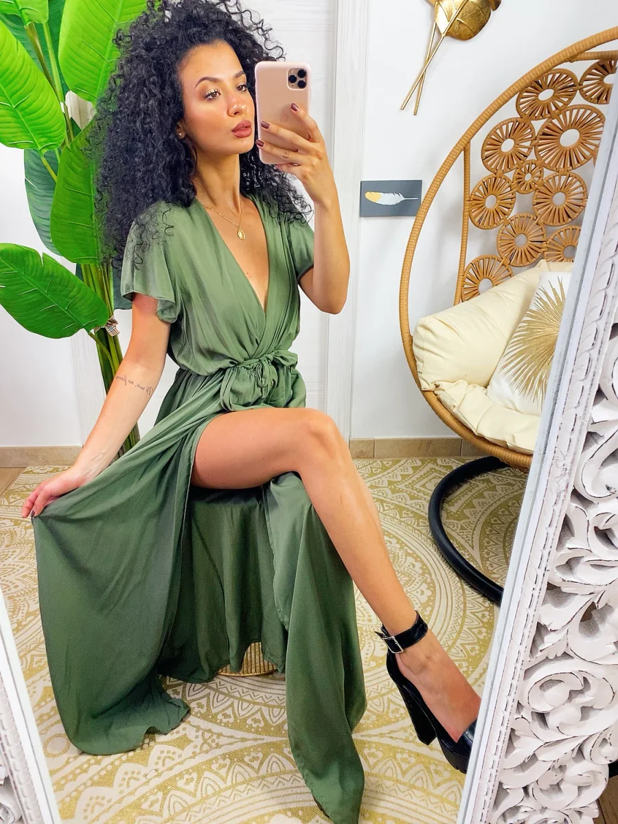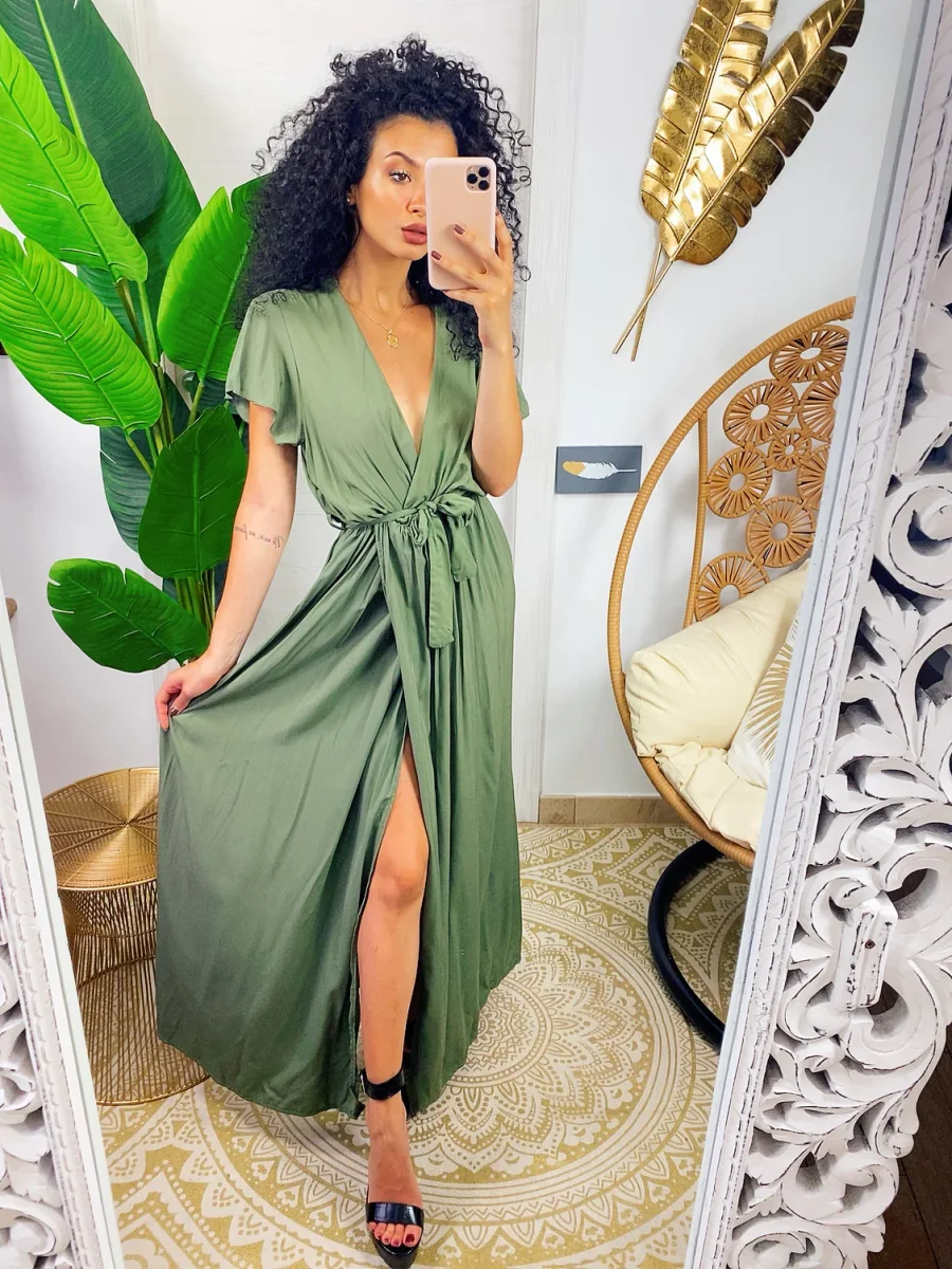 Abito lungo leggero con scollo a V e maxi spacco. Cintura in vita tono su tono.
