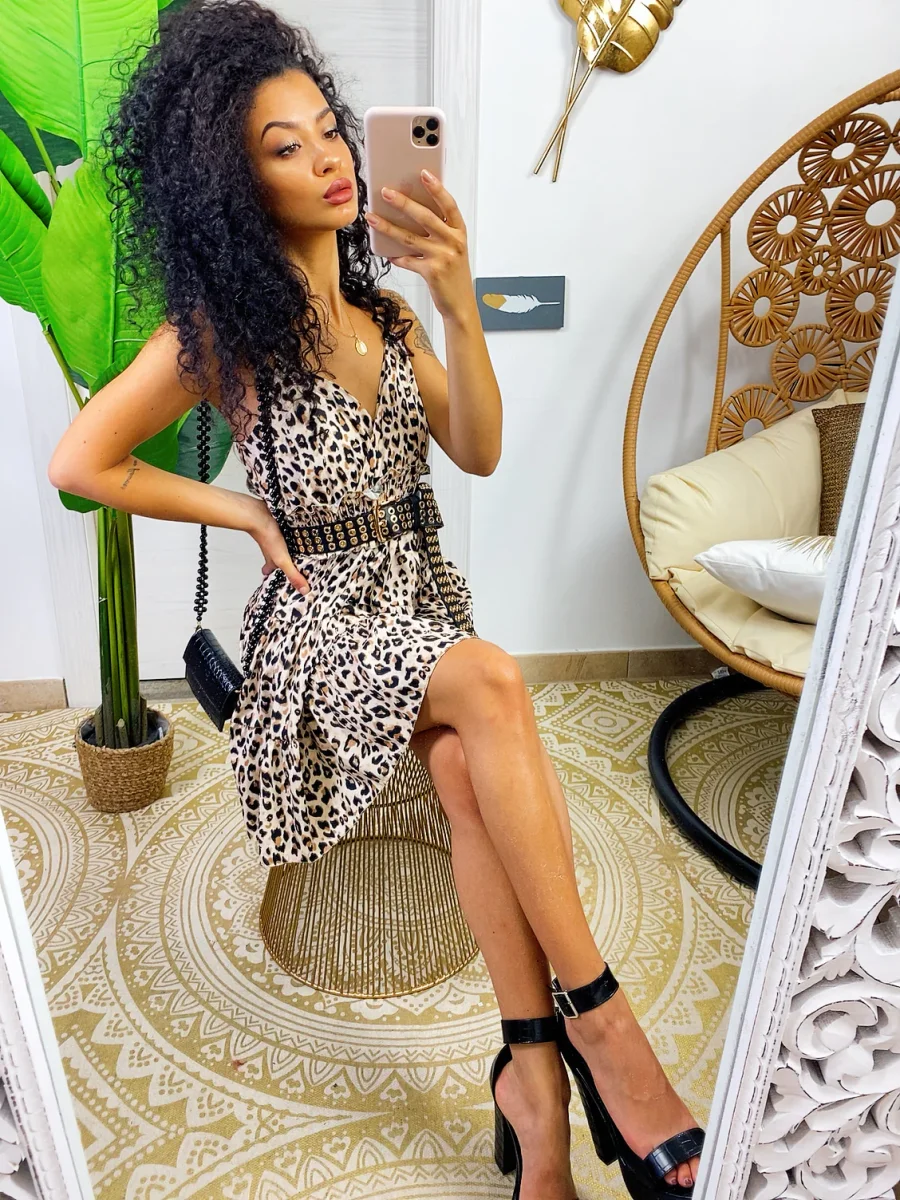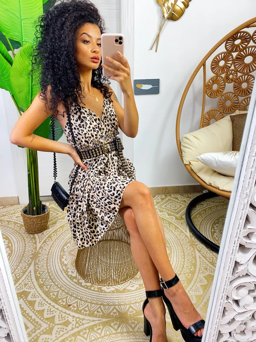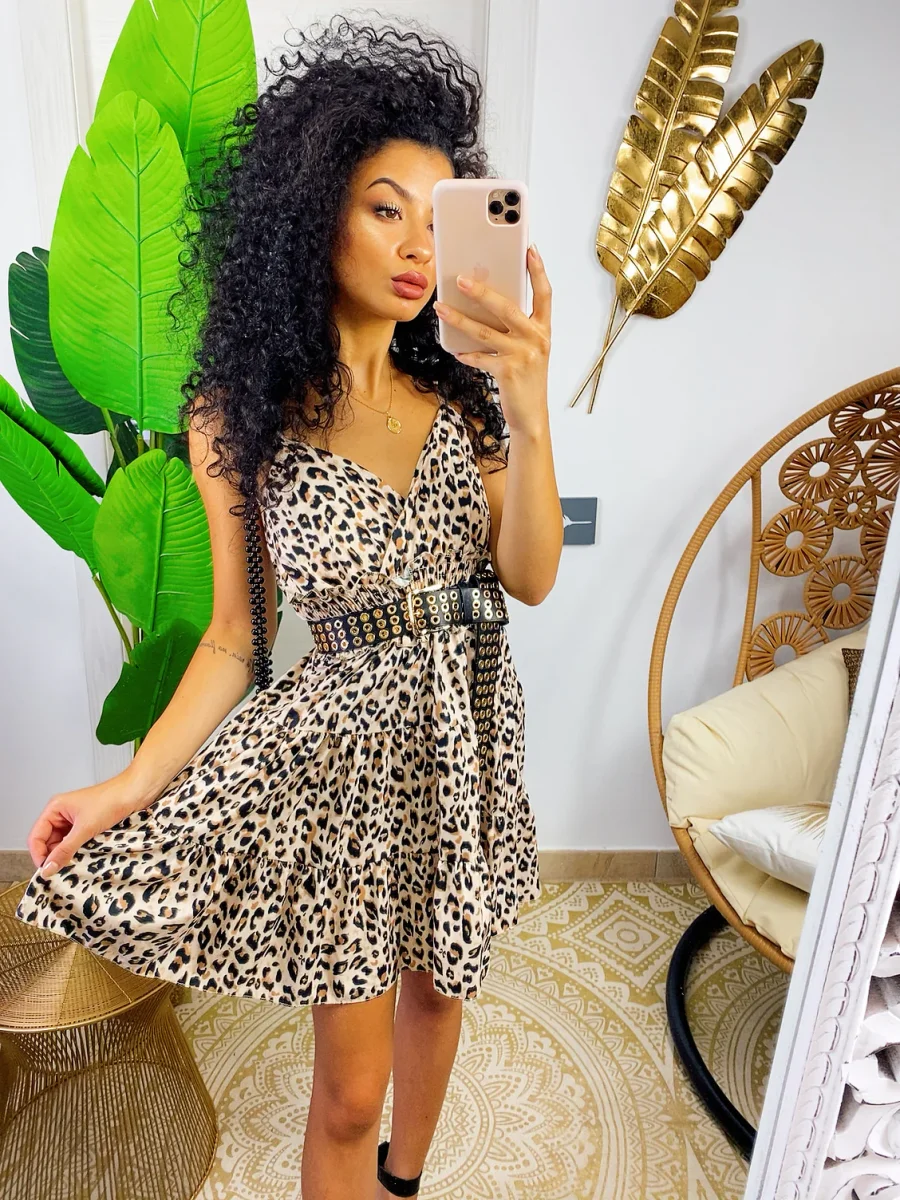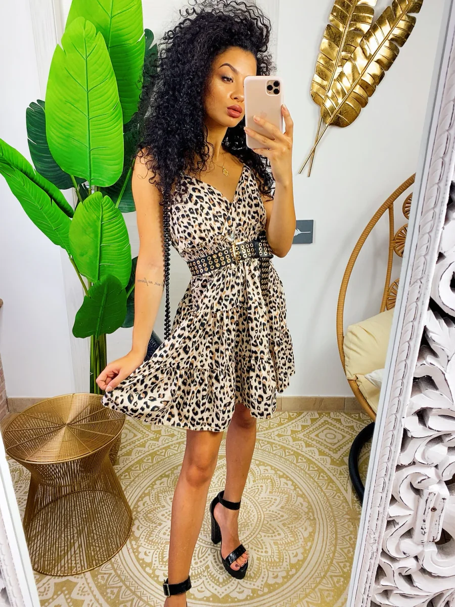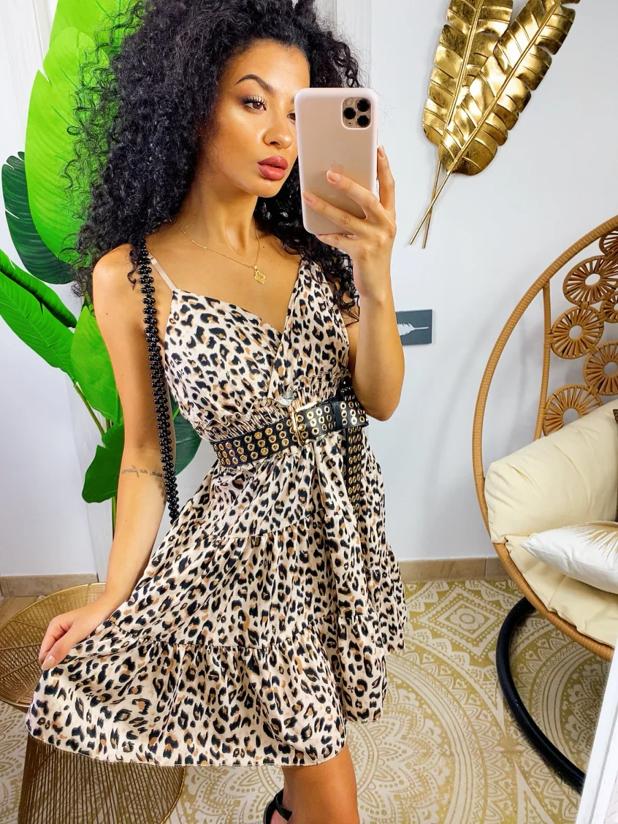 Abito a balze in cotone a bretellina con stampa maculata. Elasticizzato sul petto e bretelline regolabili. Taglio in vita
