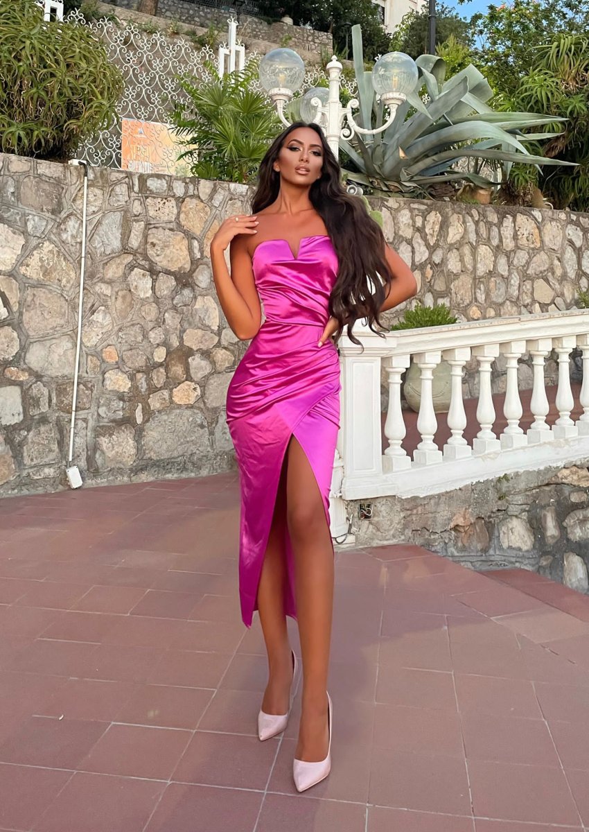 Abito midi in raso con spacco e scollo a V dotato di ferretto, coppe incluse