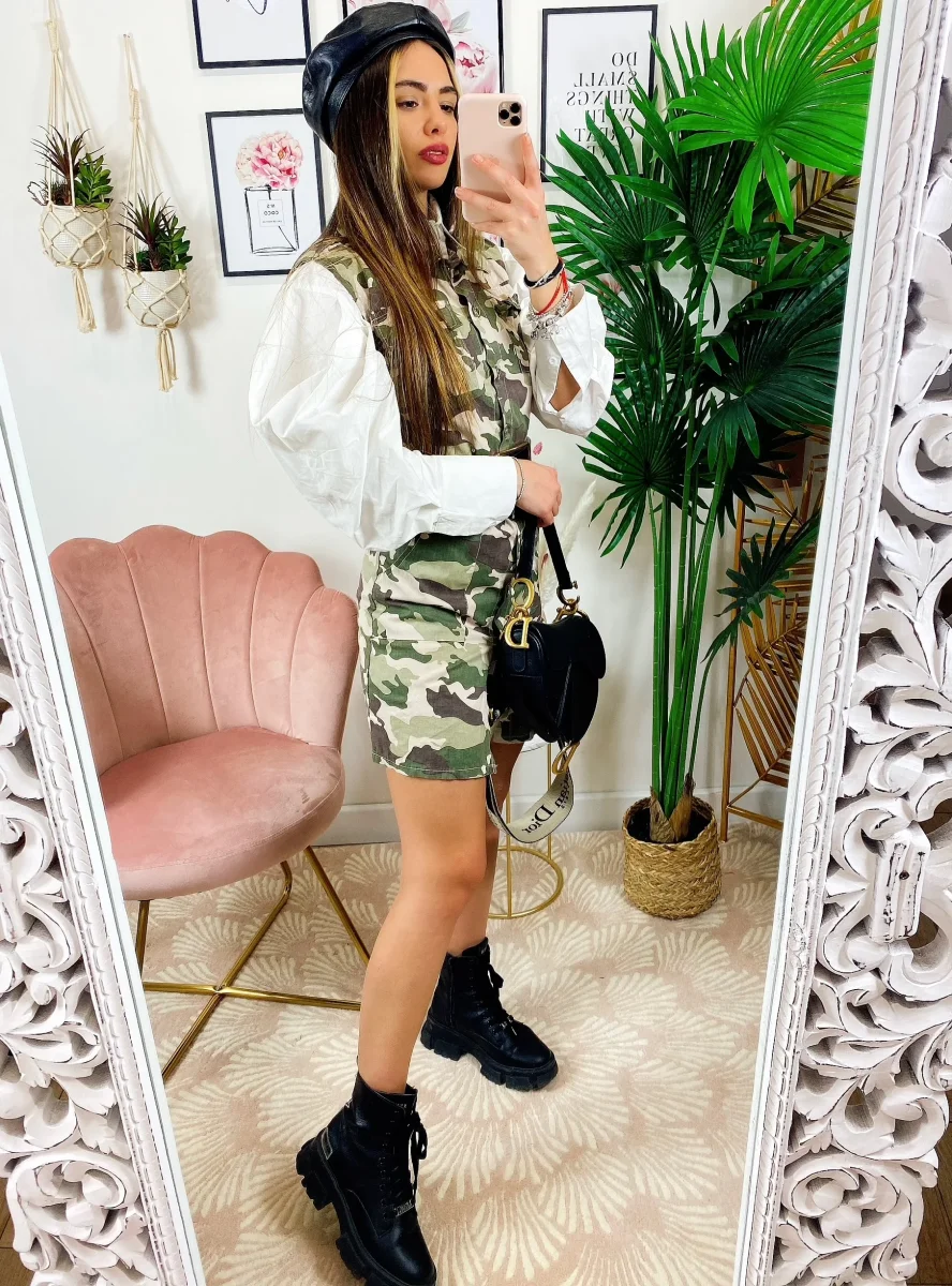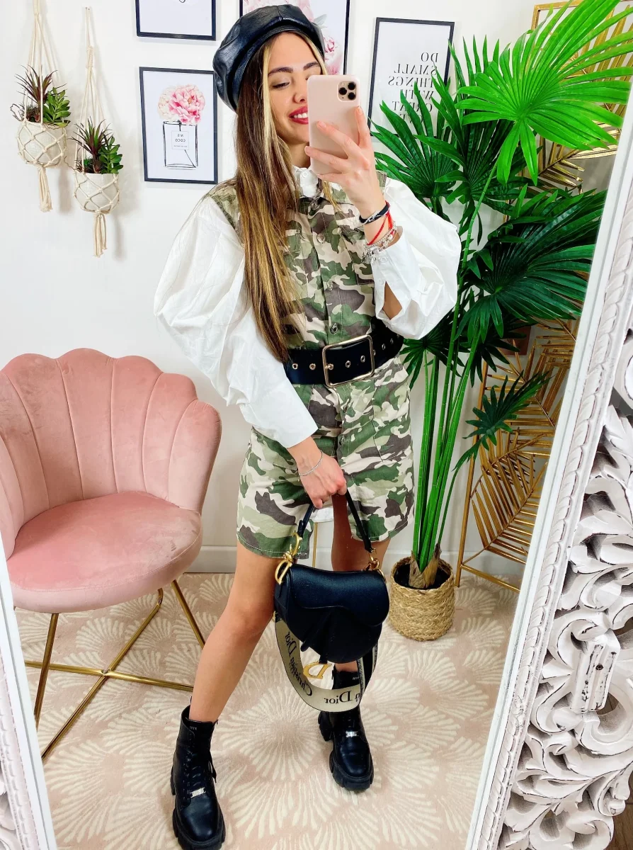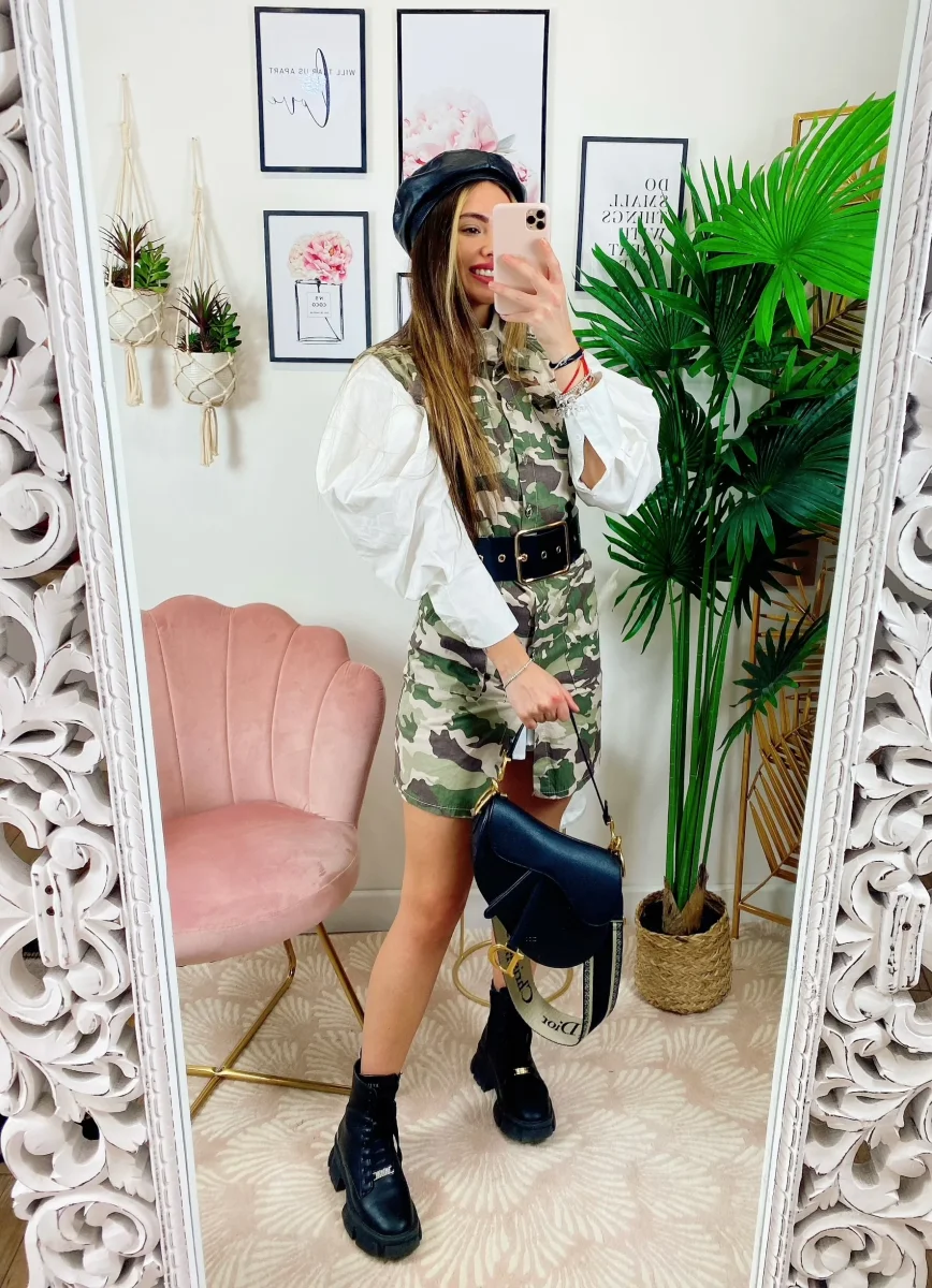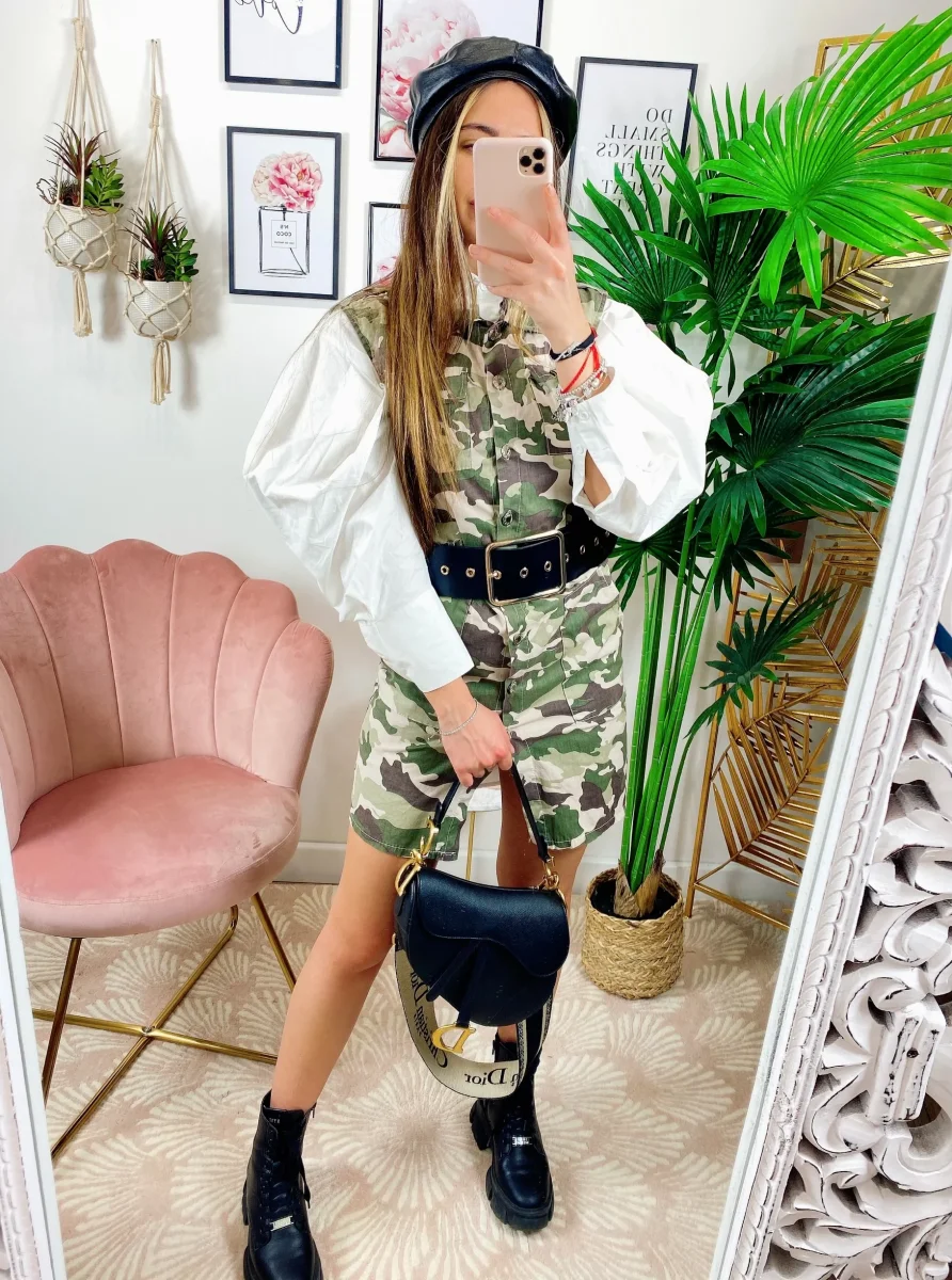 Abito in tessuto rigido non elasticizzato. Chiusura con bottoni e cintura in vita tono su ton. Camicia non inclusa
