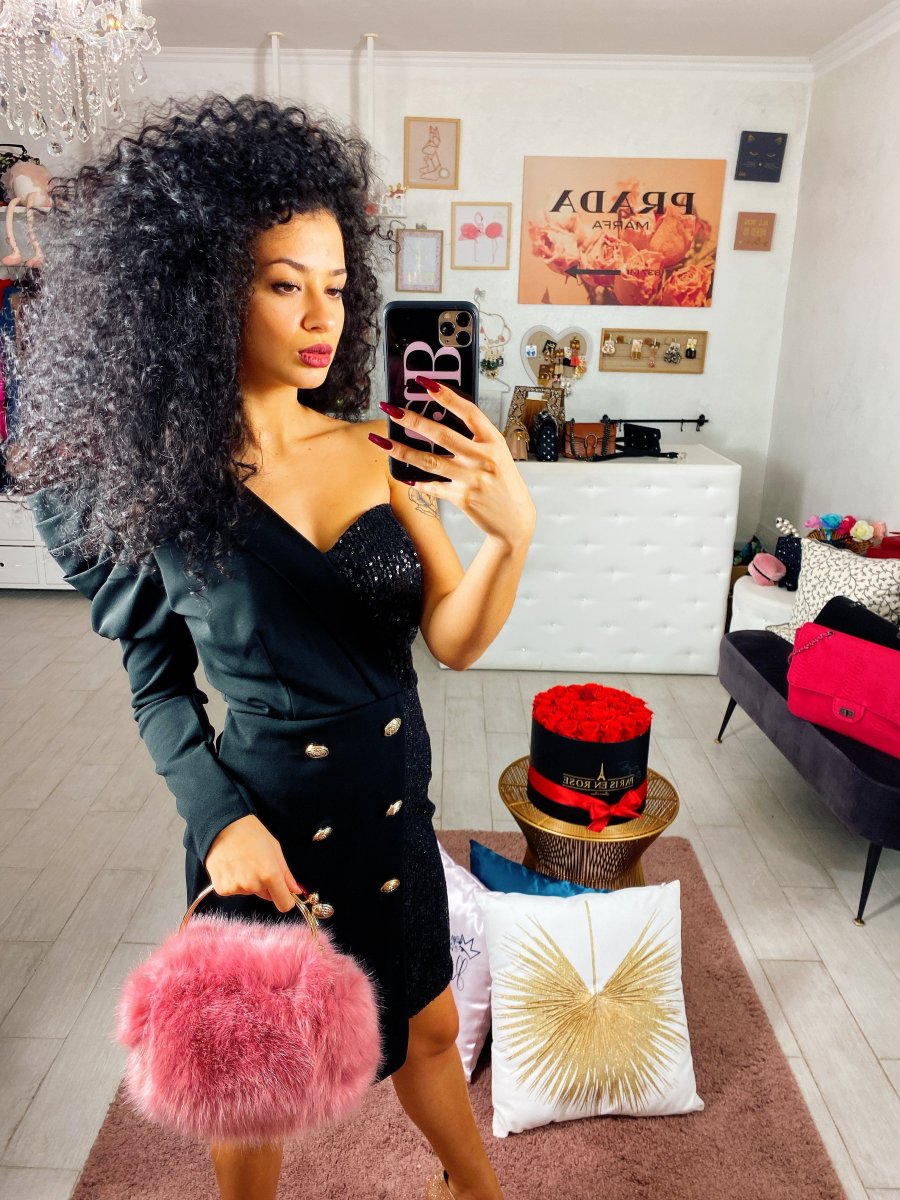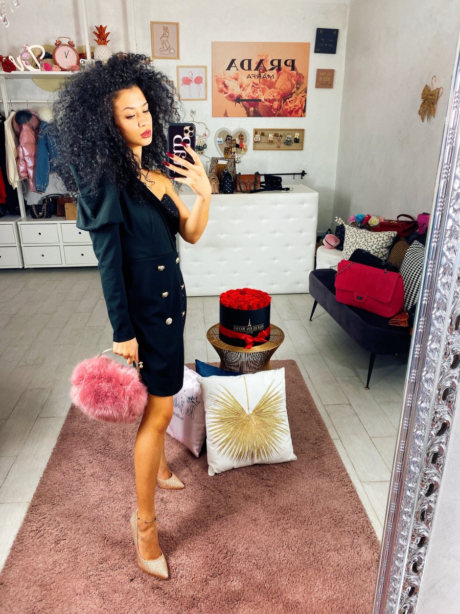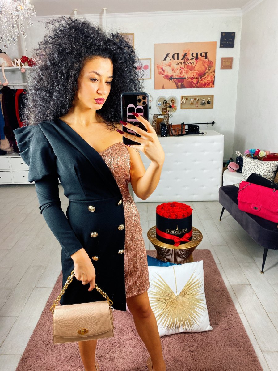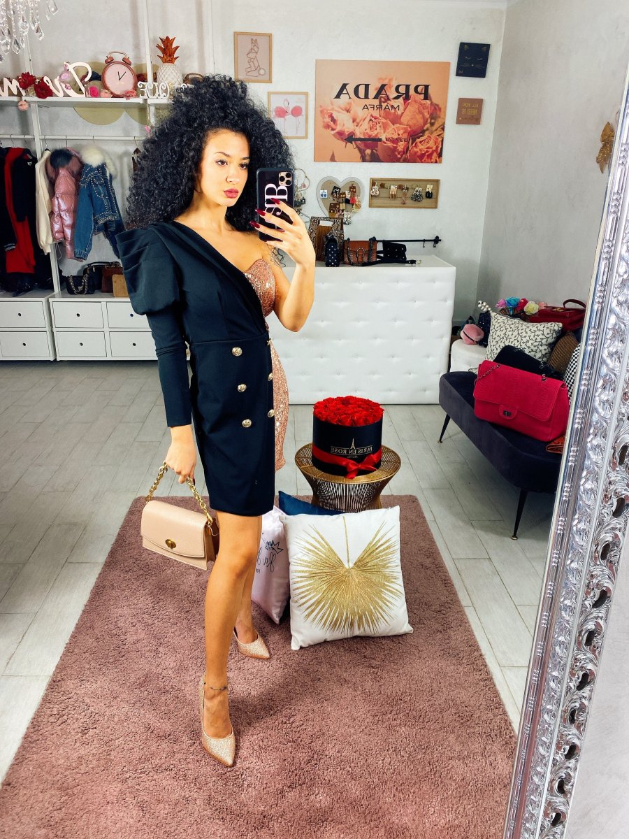 Abito monomanica particolare e molto elegante. Bottoni oro come dettaglio.
