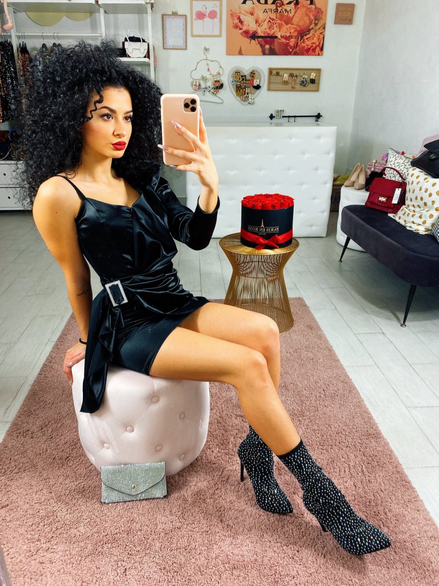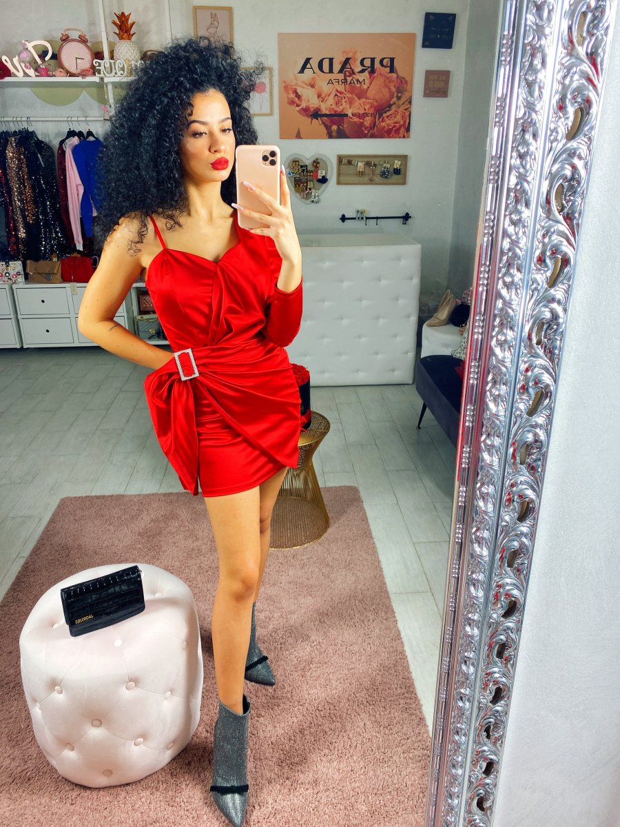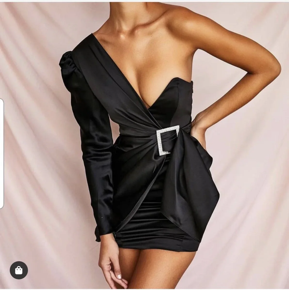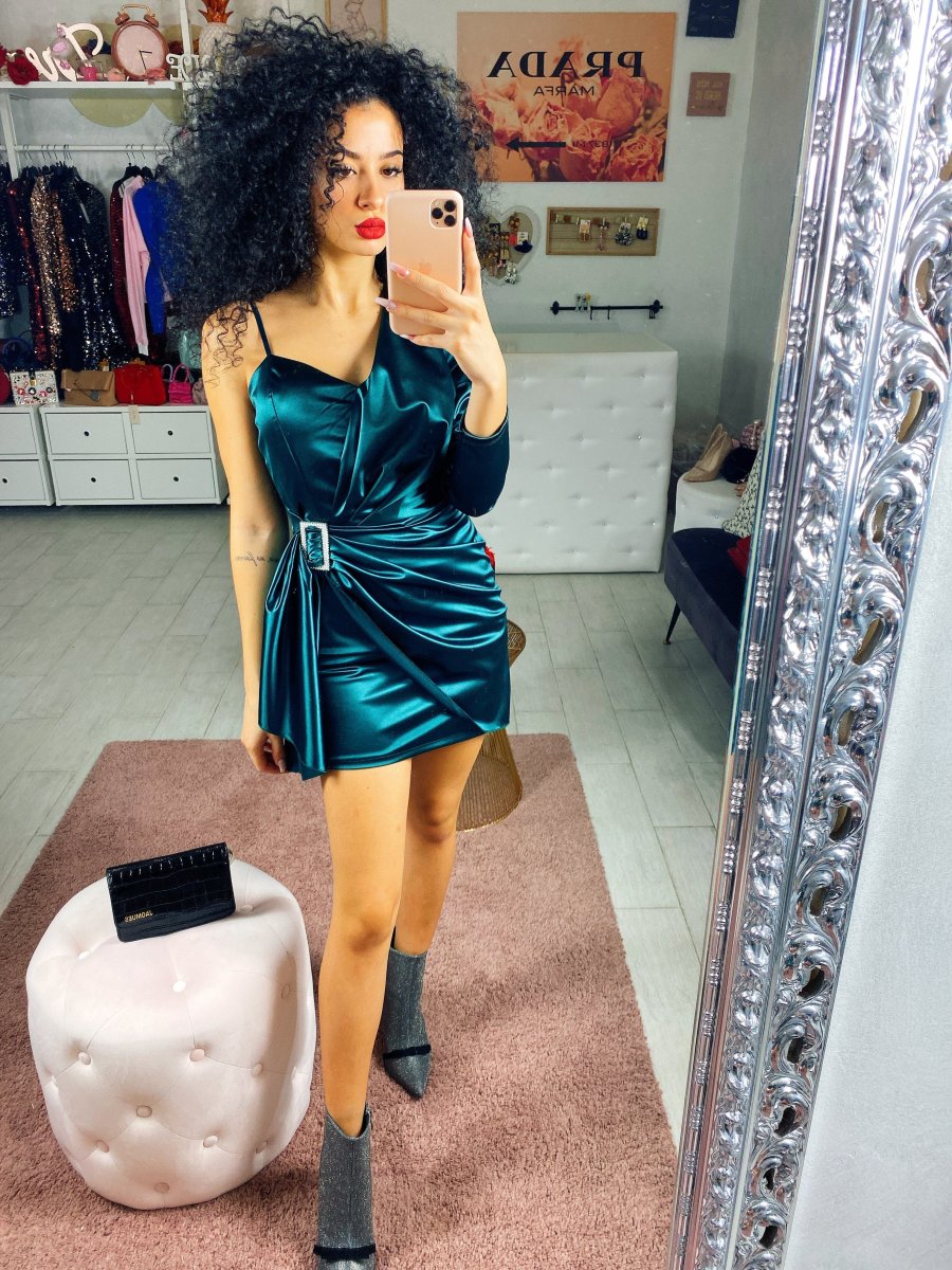 Abito monospalla con cinta glitterata, tessuto Raso e cinta che accentua il punto vita, l’abito per il tuo evento che non ti farà passare inosservata.