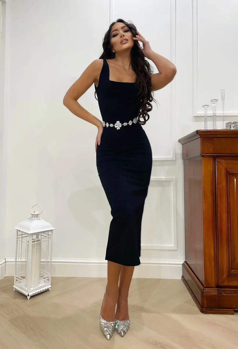 Abito in tessuto elasticizzato e aderente tagliato a laser, spacchetto nel dietro e chiusura con zip